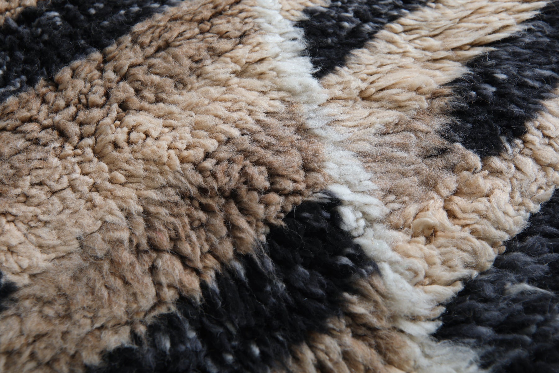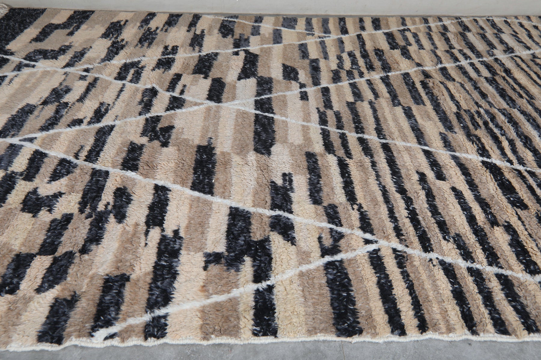 Elevate your space with this Beni Ourain Moroccan Rug, sized at 8.3 x 11.9 feet (256 CM x 364 CM). Handwoven from 100% natural wool, this stunning piece features a bold black and beige pattern with striking white diamond accents, blending traditional Moroccan craftsmanship with a contemporary touch. Its plush texture offers luxurious comfort, making it a perfect addition to living rooms, offices, or stylish interiors. A timeless statement piece for any sophisticated space.