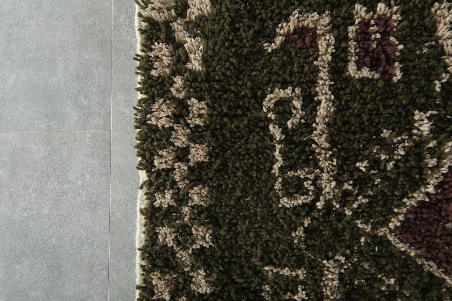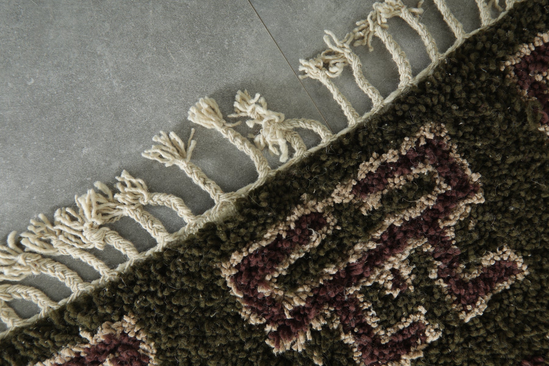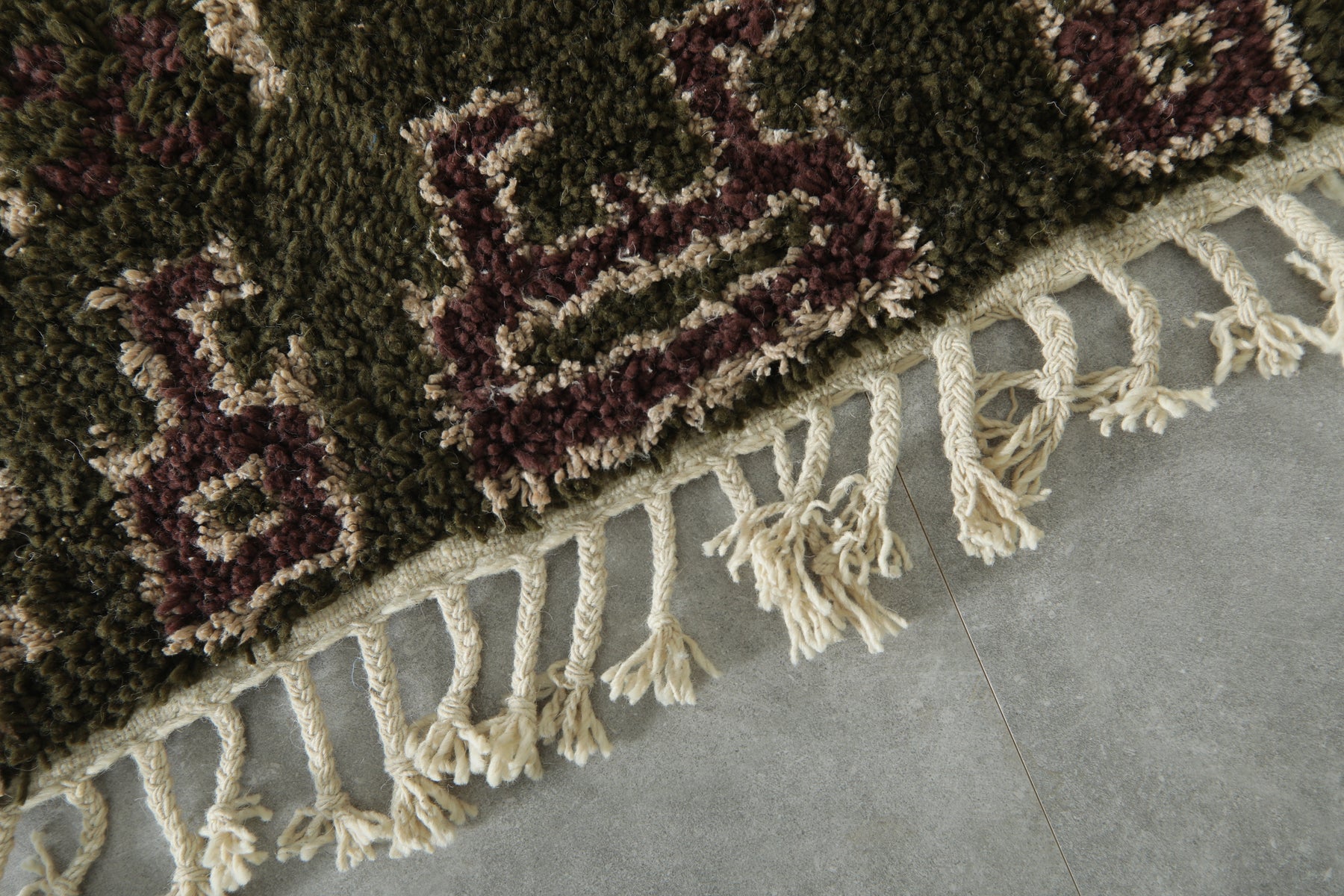 Bring a bold yet timeless statement to your space with this handcrafted Moroccan rug featuring rich olive green, soft beige, and deep burgundy hues. Adorned with intricate geometric Berber motifs, this vintage-inspired piece adds warmth, character, and artisanal charm to any room. Perfect for boho, eclectic, or rustic interiors, this wool rug is both stylish and durable—making it a unique centerpiece for living rooms, bedrooms, or entryways.