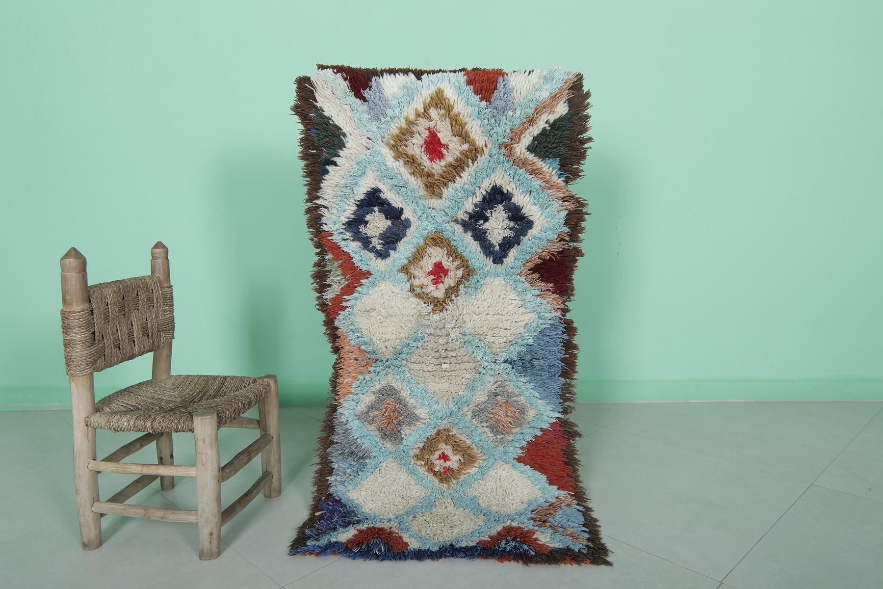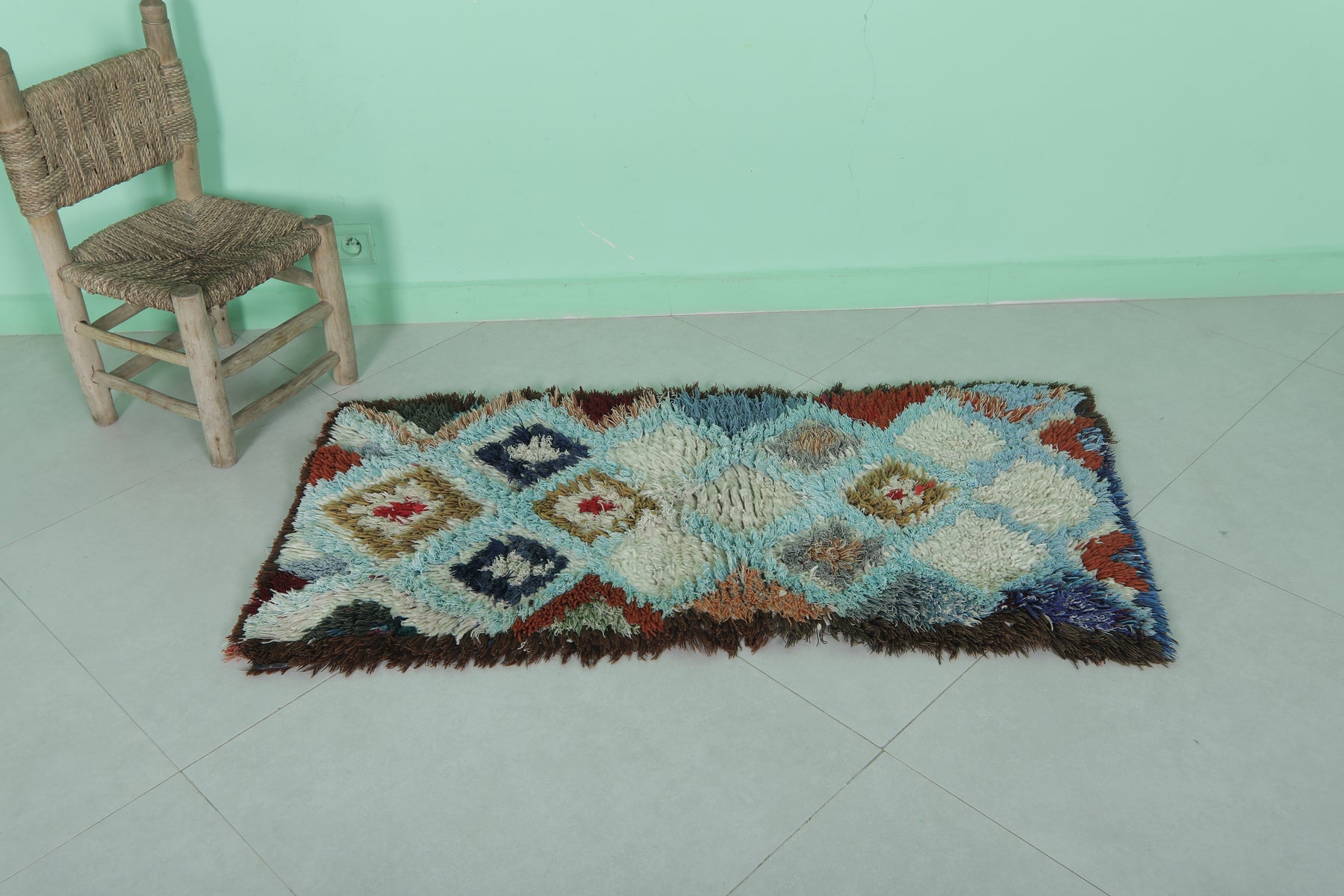 Add a vibrant touch to your space with this Diamond Multicolored Moroccan Berber Rug, sized 1.8 x 4 feet. Featuring bold diamond motifs in shades of blue, red, and beige, this handcrafted rug creates an eye-catching centerpiece. The soft textured background enhances its artisanal charm, making it a perfect fit for entryways, reading nooks, or small living areas. Each rug is woven by skilled artisans, ensuring authenticity and timeless appeal.