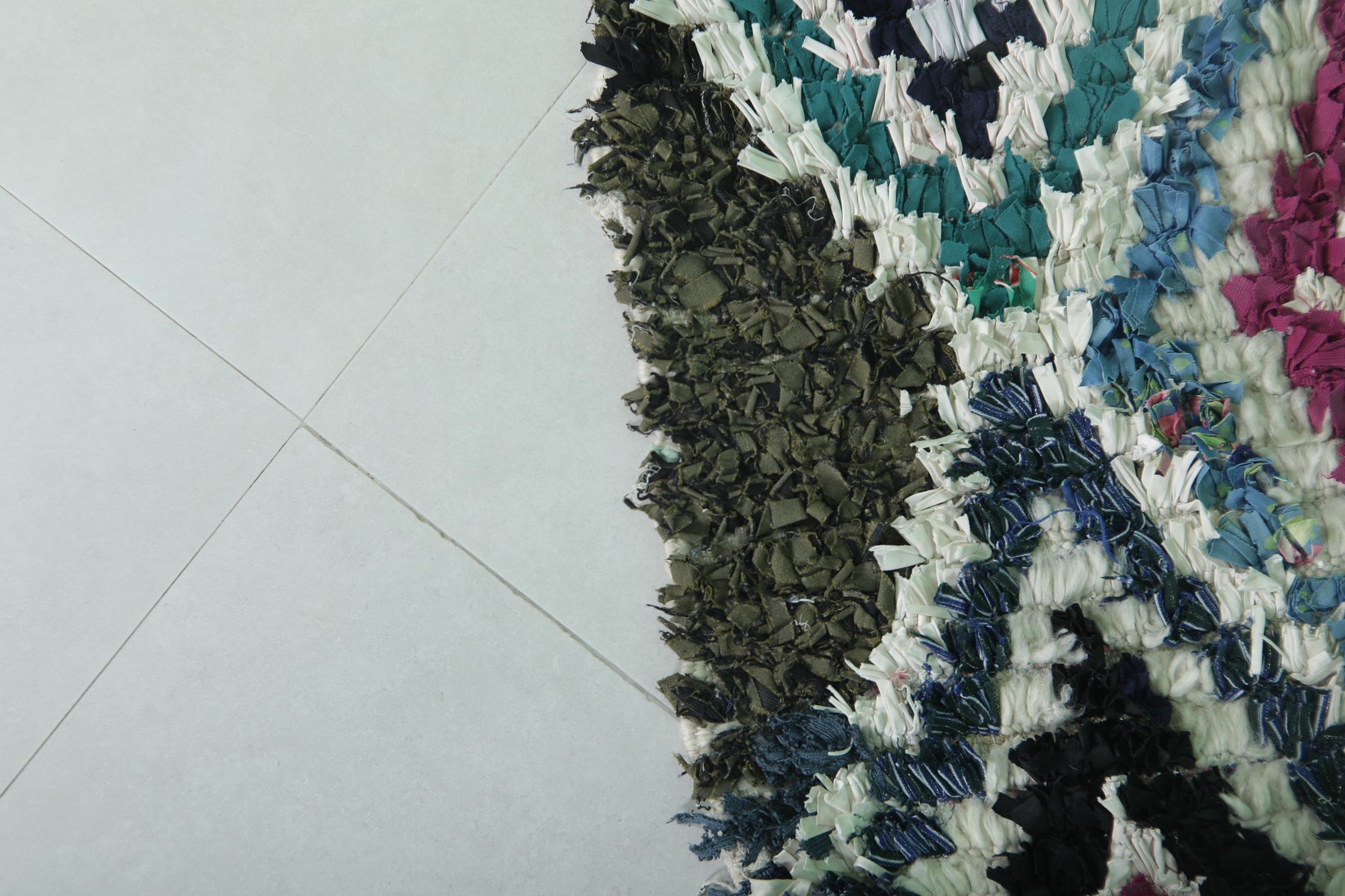 Brighten your space with this Moroccan Berber rug, measuring 3.3 x 5.8 feet. The eye-catching diamond pattern features a blend of vibrant colors, including pink, blue, white, and black, creating a stunning visual impact. Expertly handwoven with premium materials, this rug offers a soft, plush texture, perfect for enhancing your living room, bedroom, or office décor. Its artistic design reflects the rich heritage of Moroccan craftsmanship while adding a unique bohemian charm to any interior.