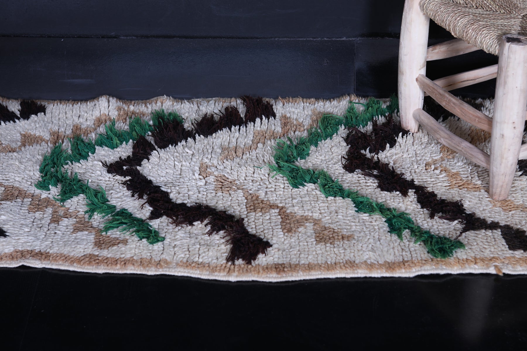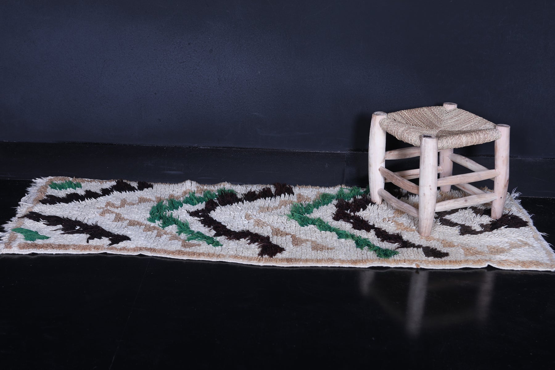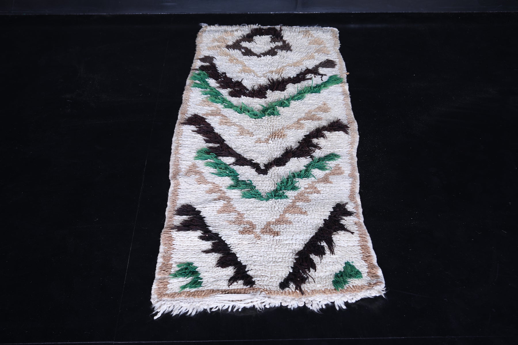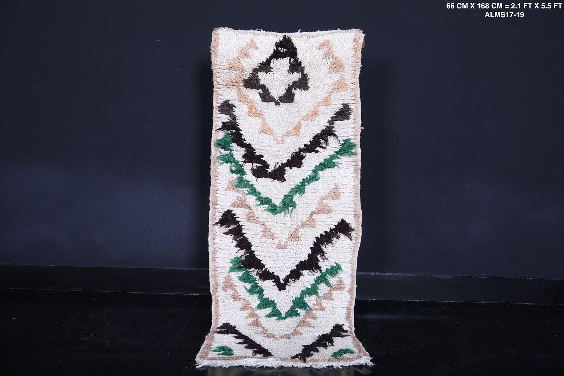 This 2.1 x 5.5 feet Moroccan runner rug features a striking handwoven chevron design, adding elegance and texture to any space. Crafted with care, it showcases bold chevron patterns in black, beige, and green on a soft cream background, creating a balanced blend of sophistication and earthy charm. Perfect for hallways, narrow spaces, or bedside areas, this runner rug enhances your décor with timeless Moroccan artistry.