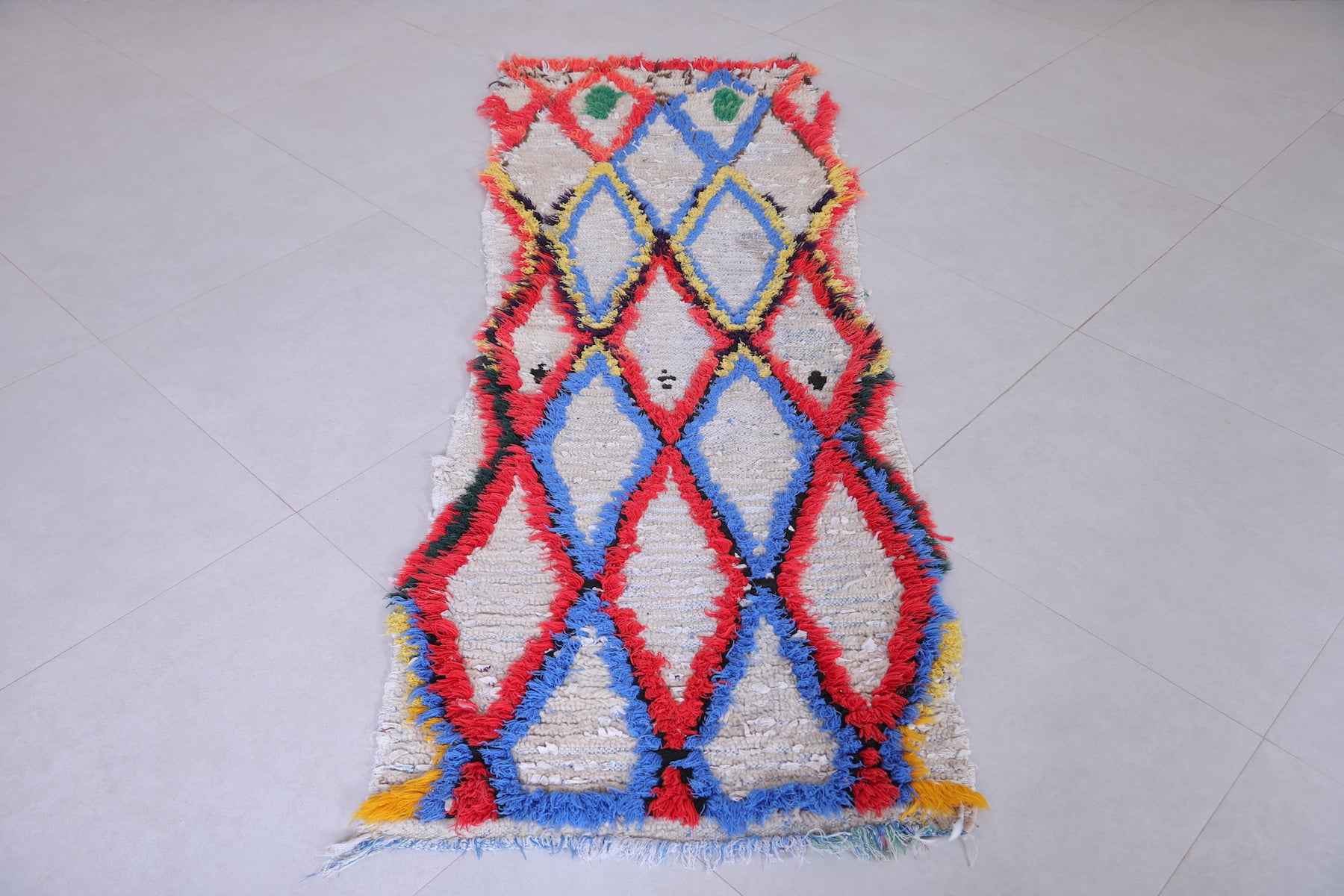 Enhance your home with this striking Moroccan runner rug. Measuring 2.2 x 6.6 ft, this handwoven wool masterpiece features a bold geometric diamond pattern in vibrant hues of red, blue, yellow, and green, set against a neutral background.