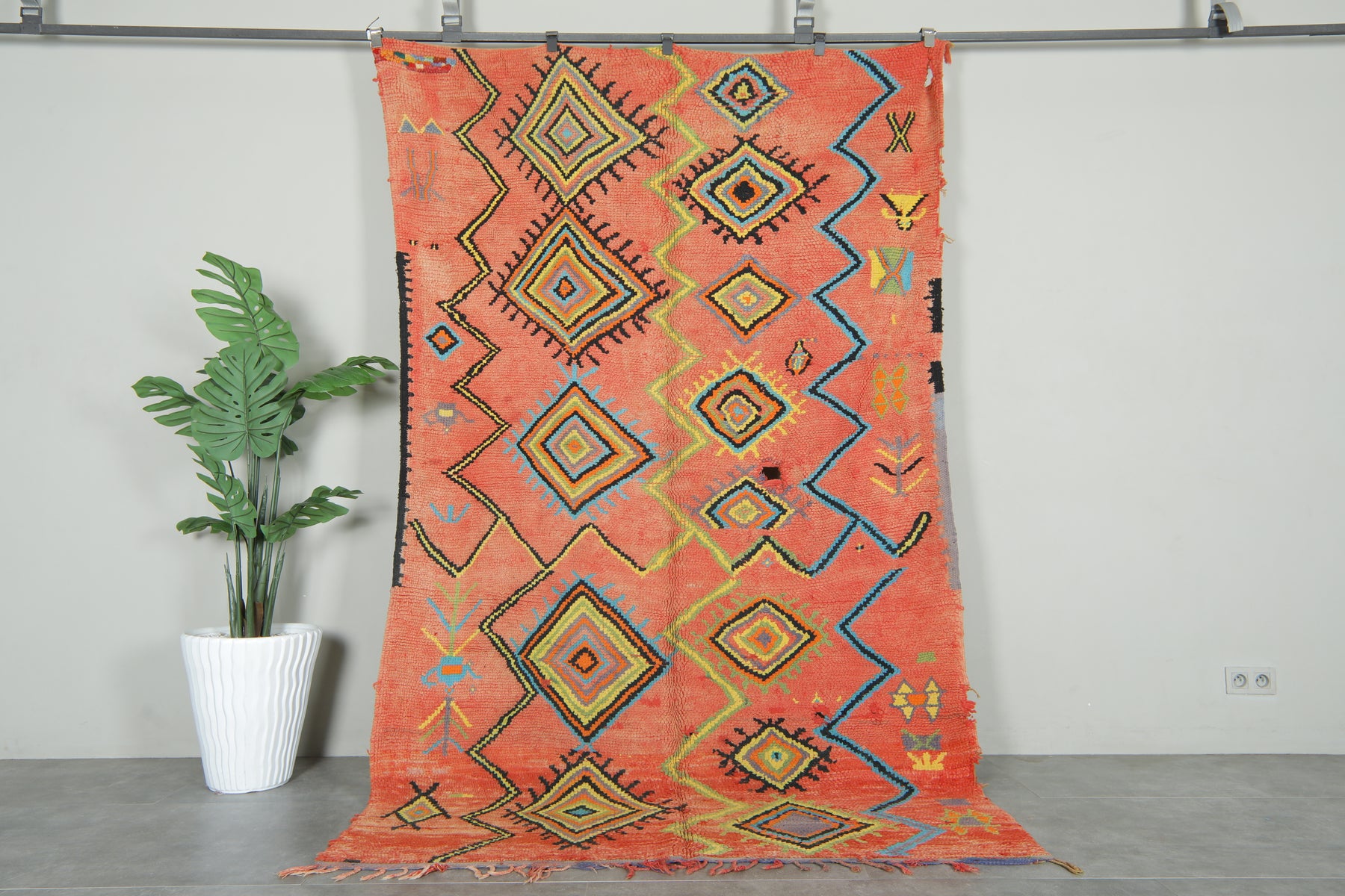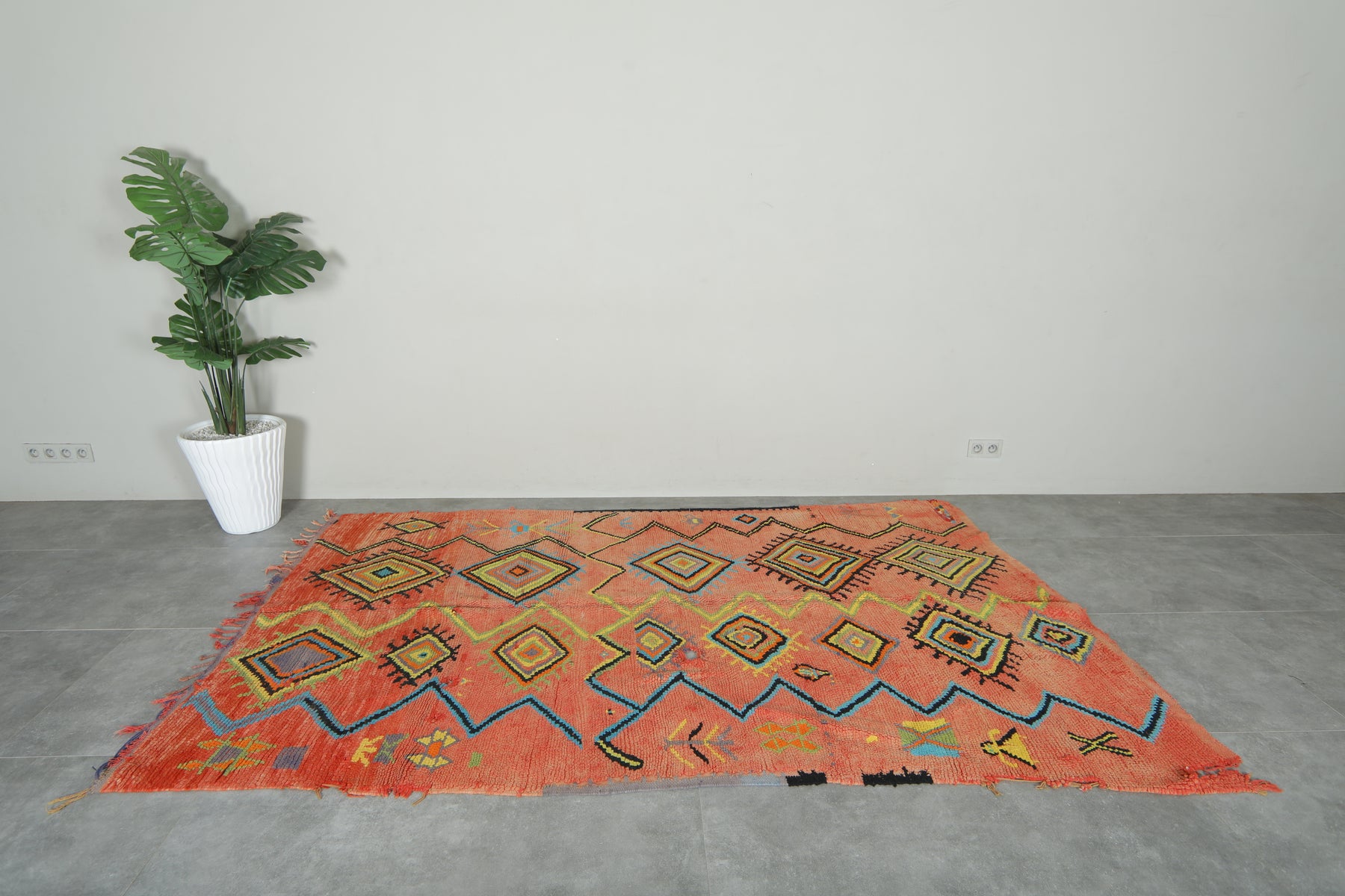 Orange azilal rug - Moroccan wool carpet with geometric diamonds - 5.6 ft x 9.4 ft