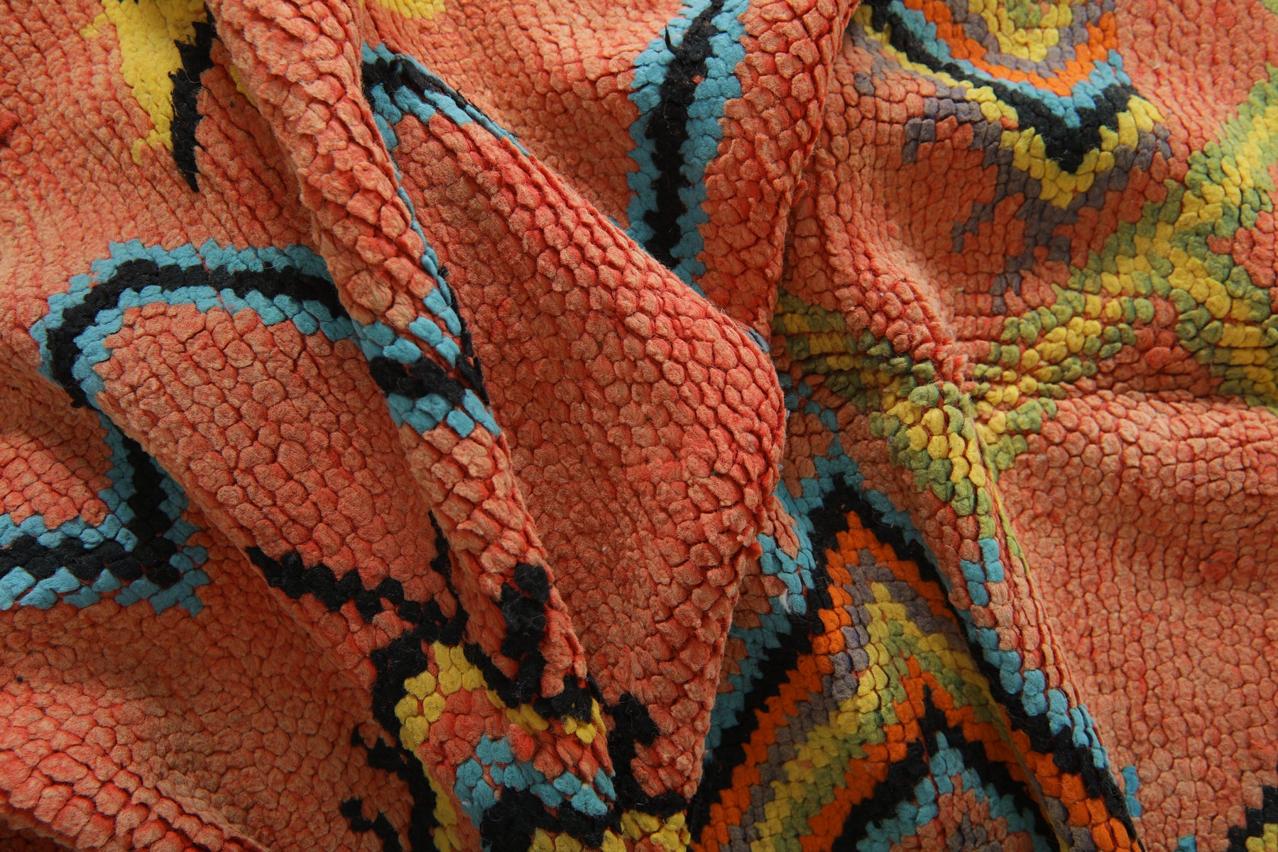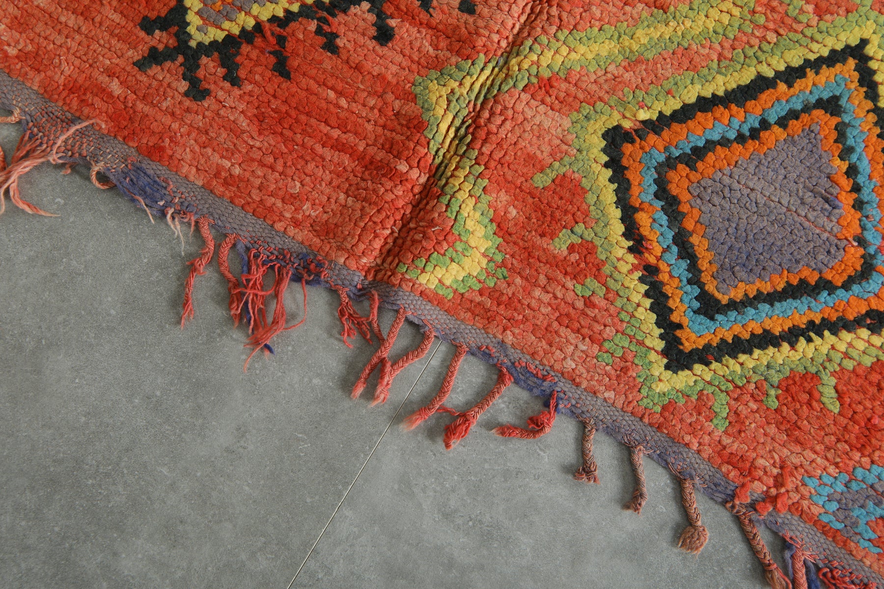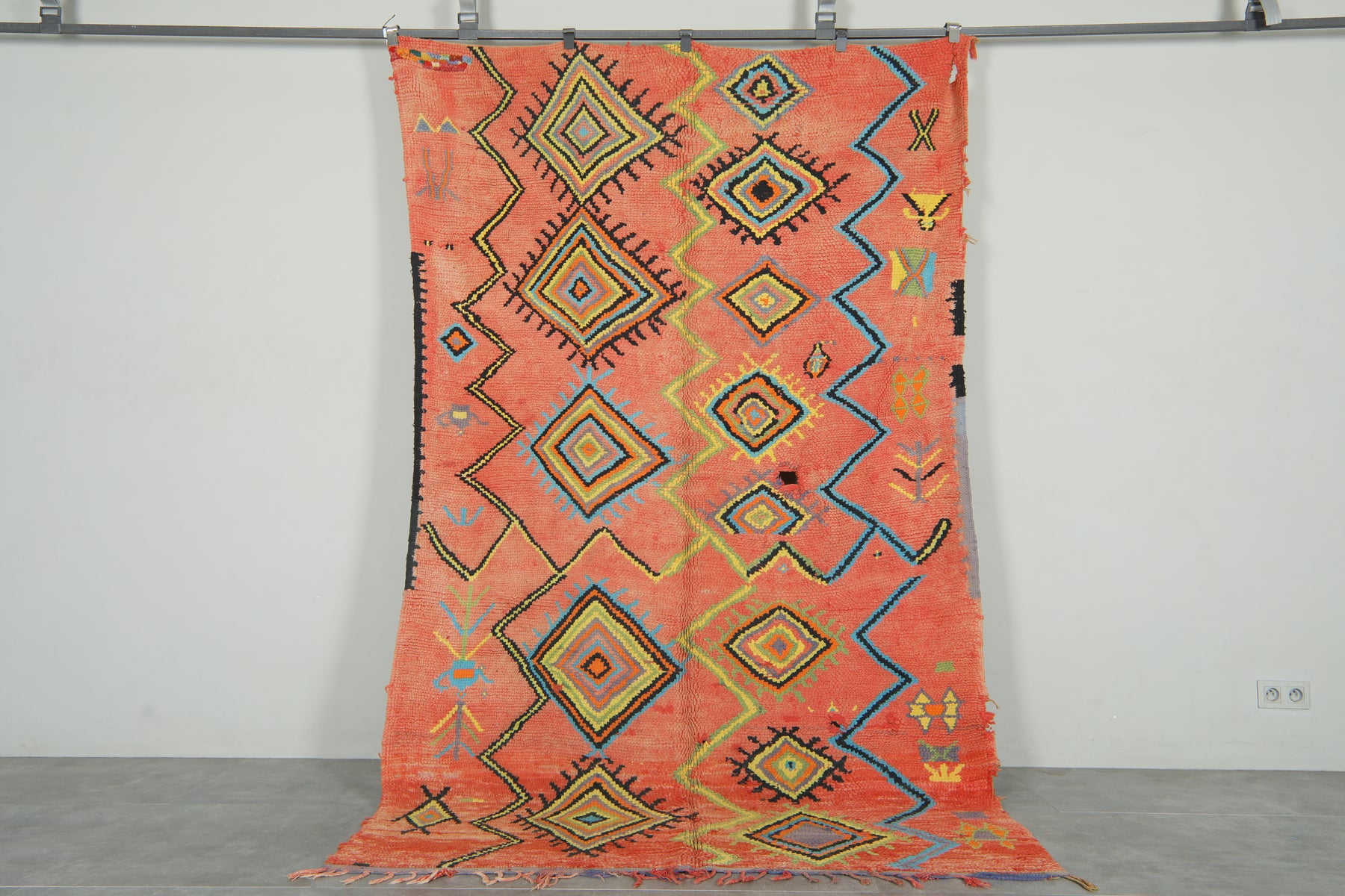 Brighten your home with this Orange Azilal Rug, a handmade Moroccan wool carpet that combines bold color with traditional Berber artistry. Featuring a vibrant orange base decorated with multicolored geometric diamond motifs in blue, yellow, black, and green, this rug is a true statement piece. Its playful asymmetrical patterns and tribal symbols reflect the creativity and heritage of the Azilal region in the Atlas Mountains.