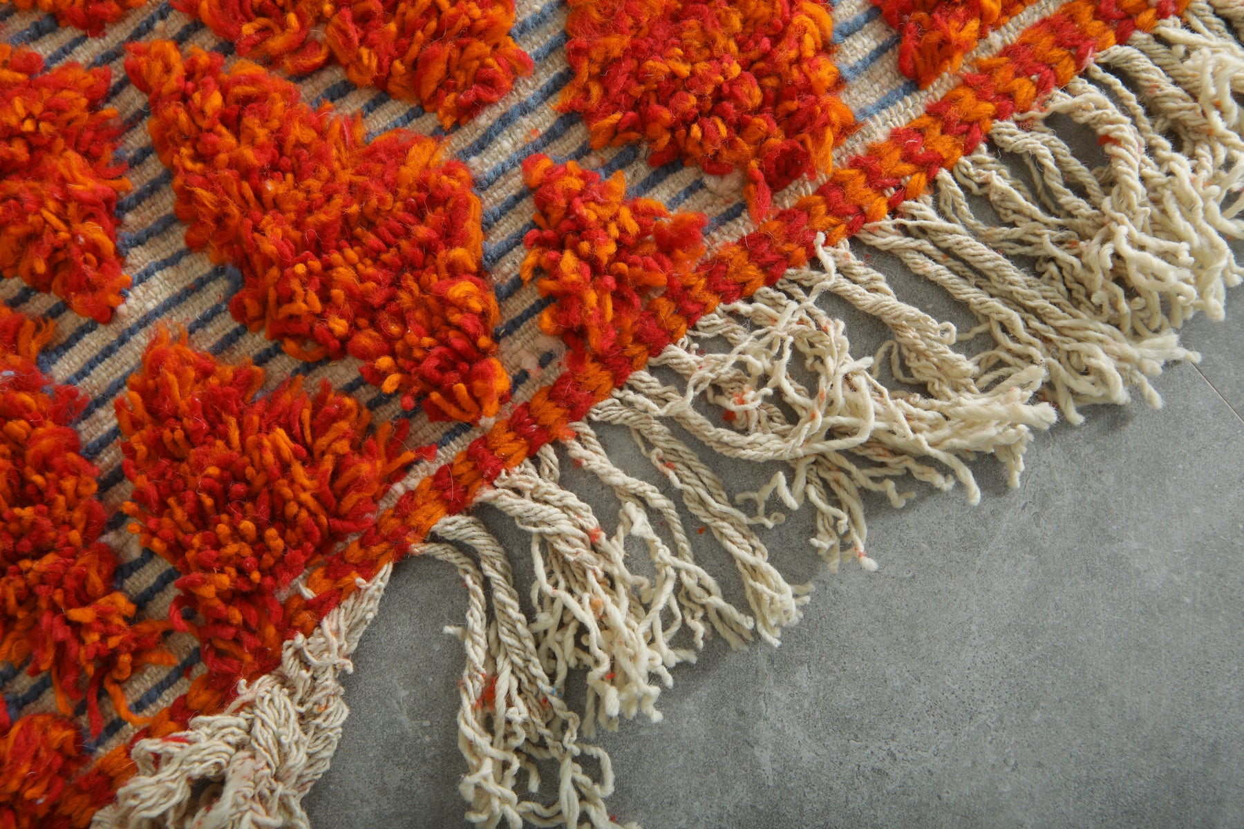 Brighten up your home with this vibrant Moroccan Boucherouite rug, featuring bold orange diamond patterns on a soft gray and blue base. Handwoven from recycled textiles by skilled Berber artisans, this eco-friendly rug adds a pop of color and texture to any space. Perfect for bohemian, eclectic, or modern interiors, its playful design and unique handmade charm make it a one-of-a-kind statement piece.
