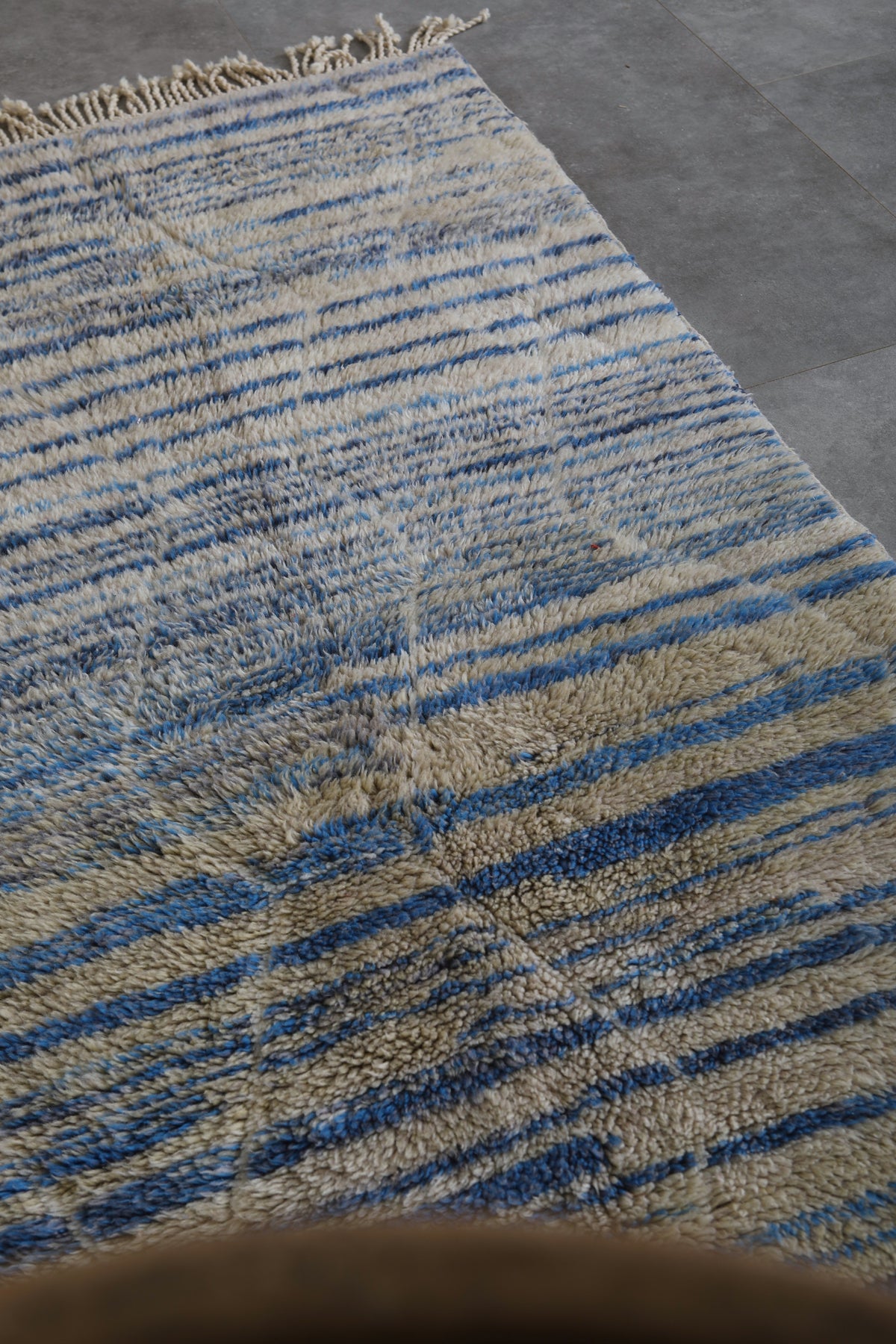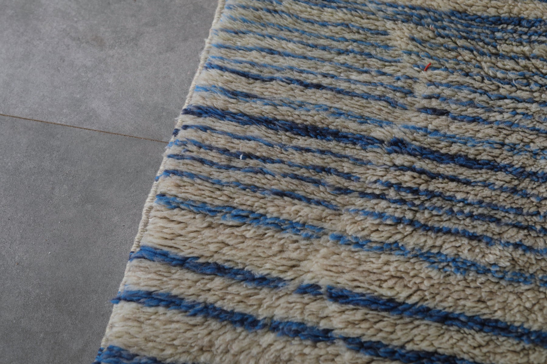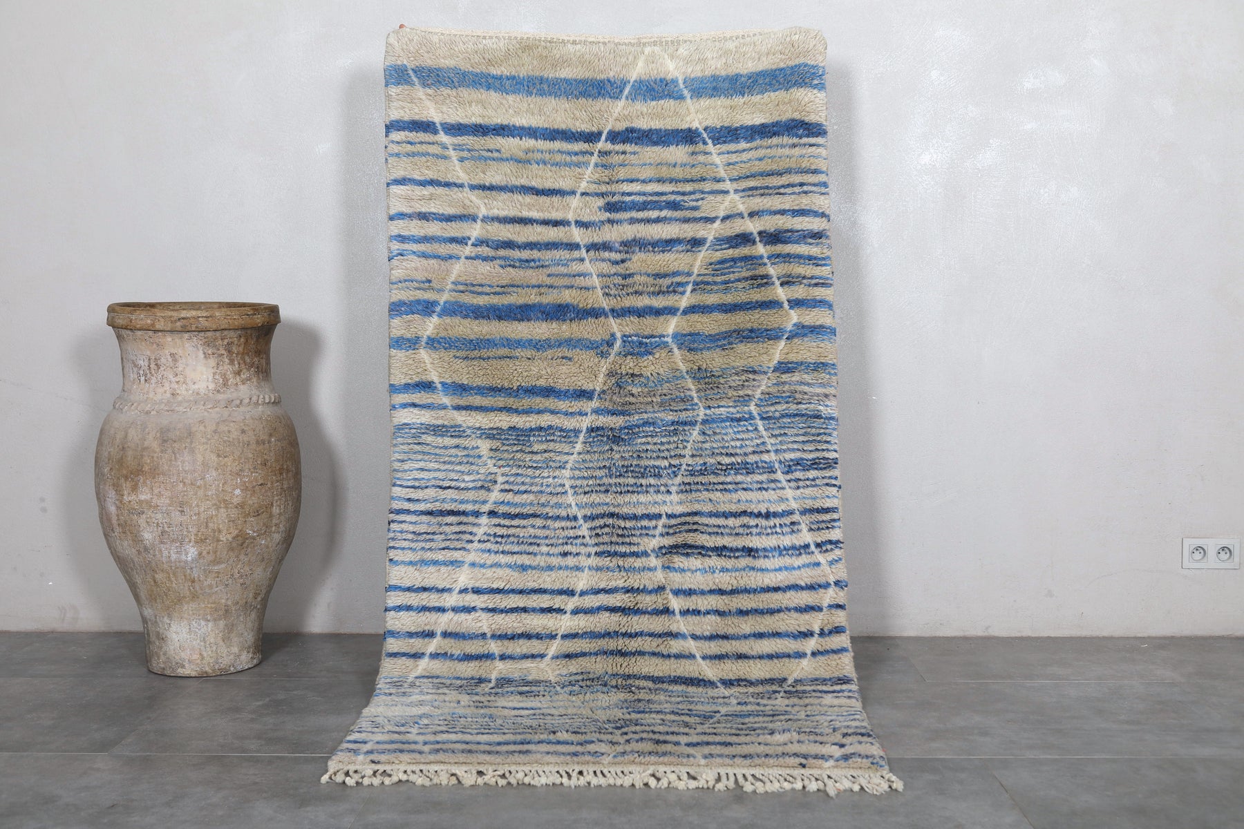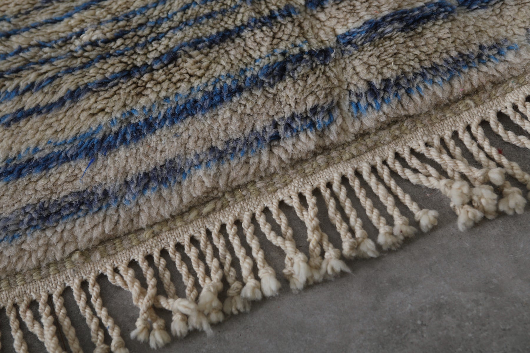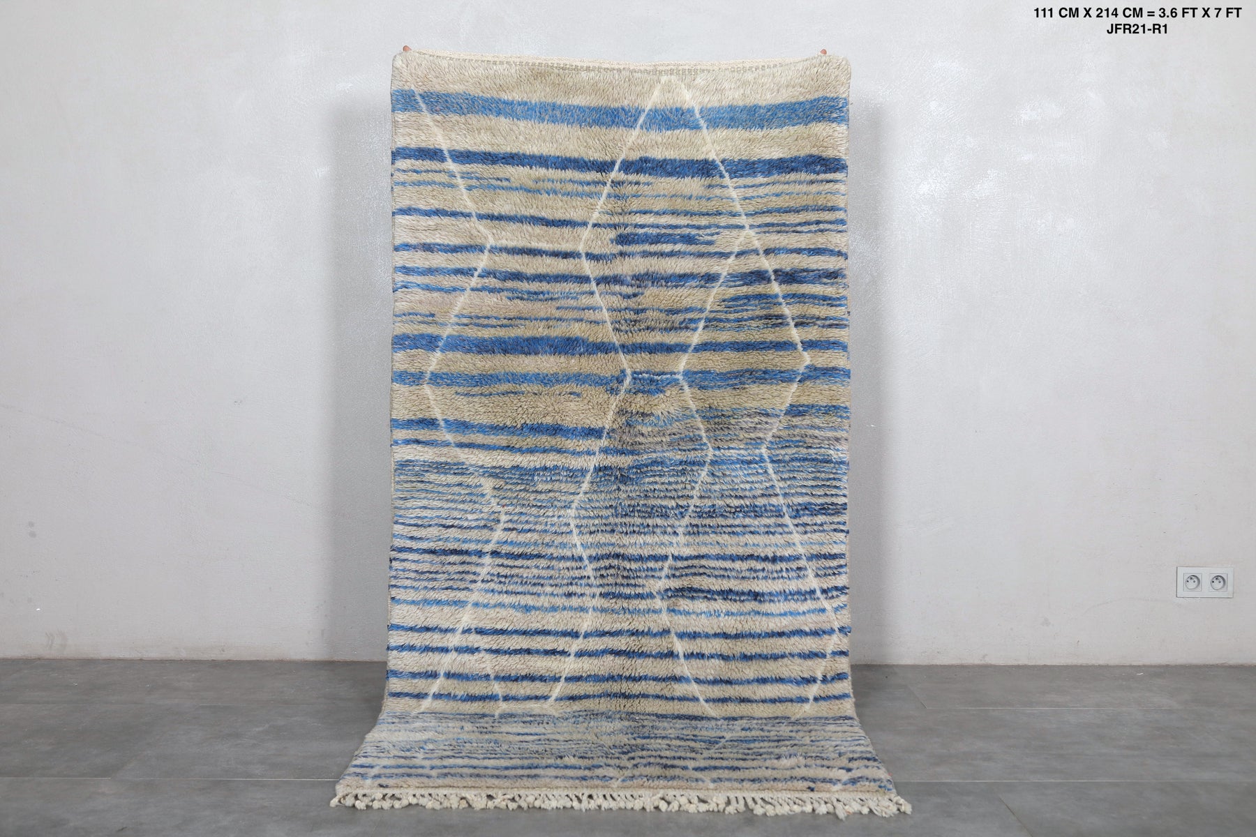 Enhance your space with this Runner Moroccan Rug, sized at 3.6 x 7 feet (111 CM x 214 CM). Featuring a blend of blue and beige stripes with subtle geometric accents, this handwoven rug adds texture, warmth, and a touch of Moroccan artistry. Its elongated design makes it a perfect choice for hallways, entryways, or narrow spaces.