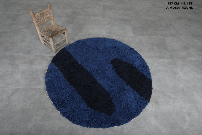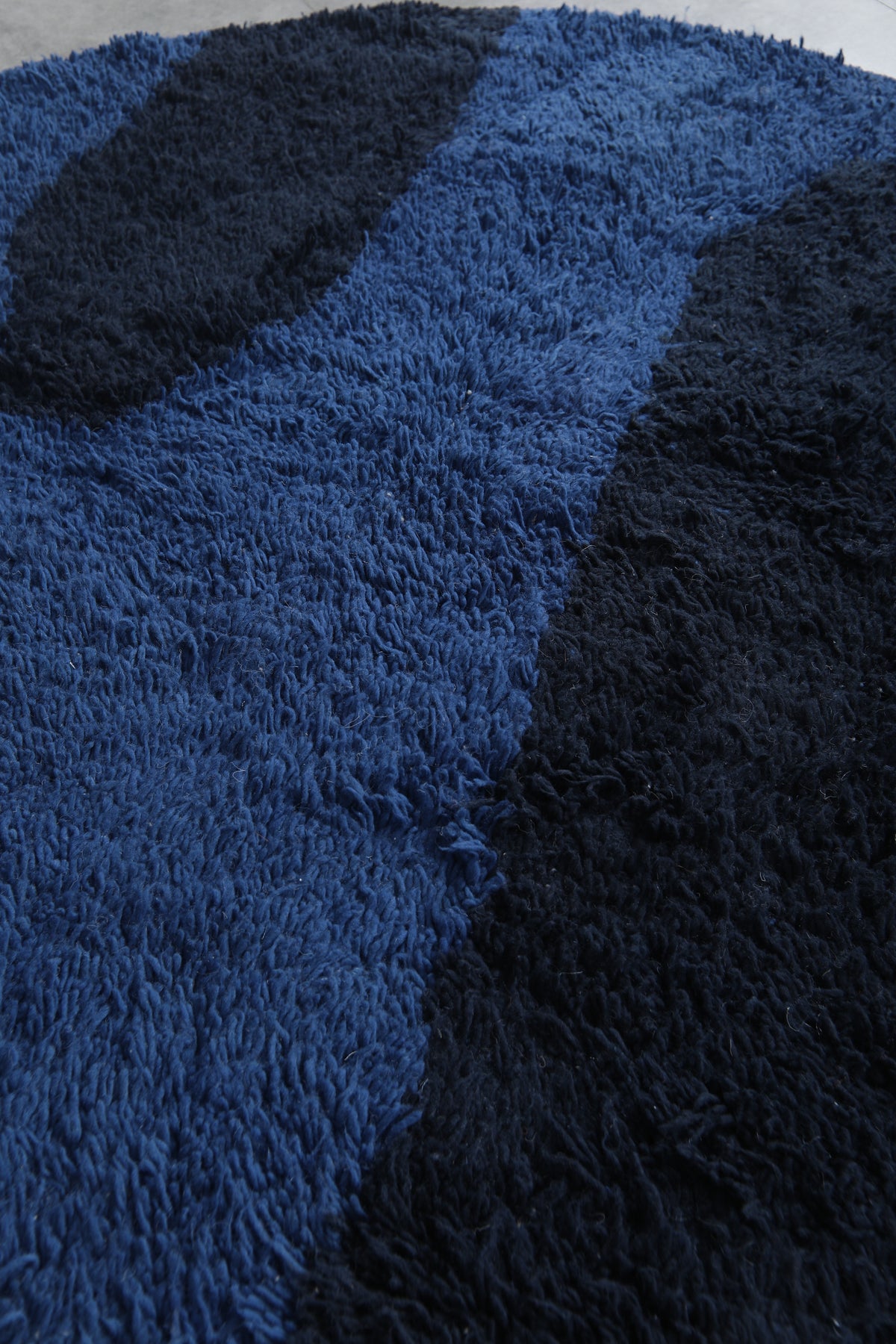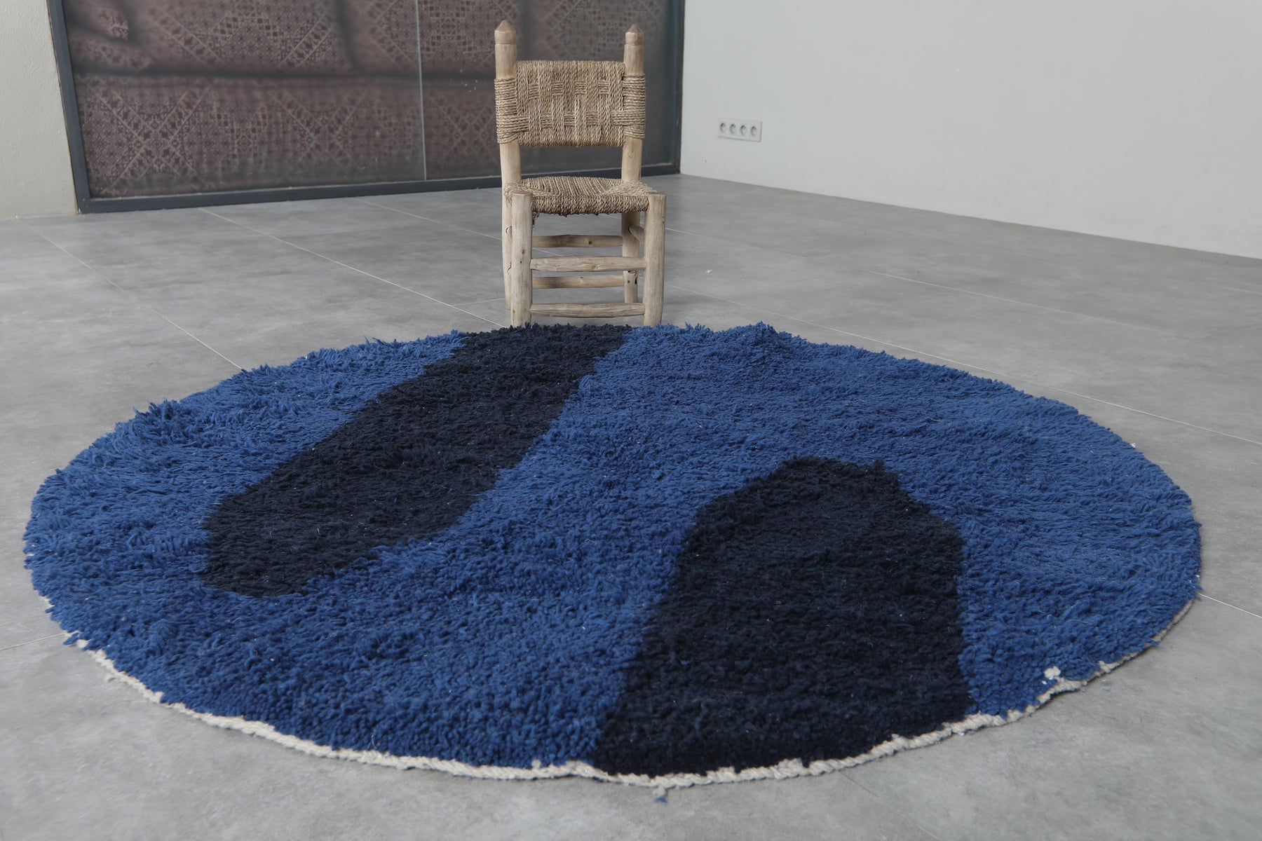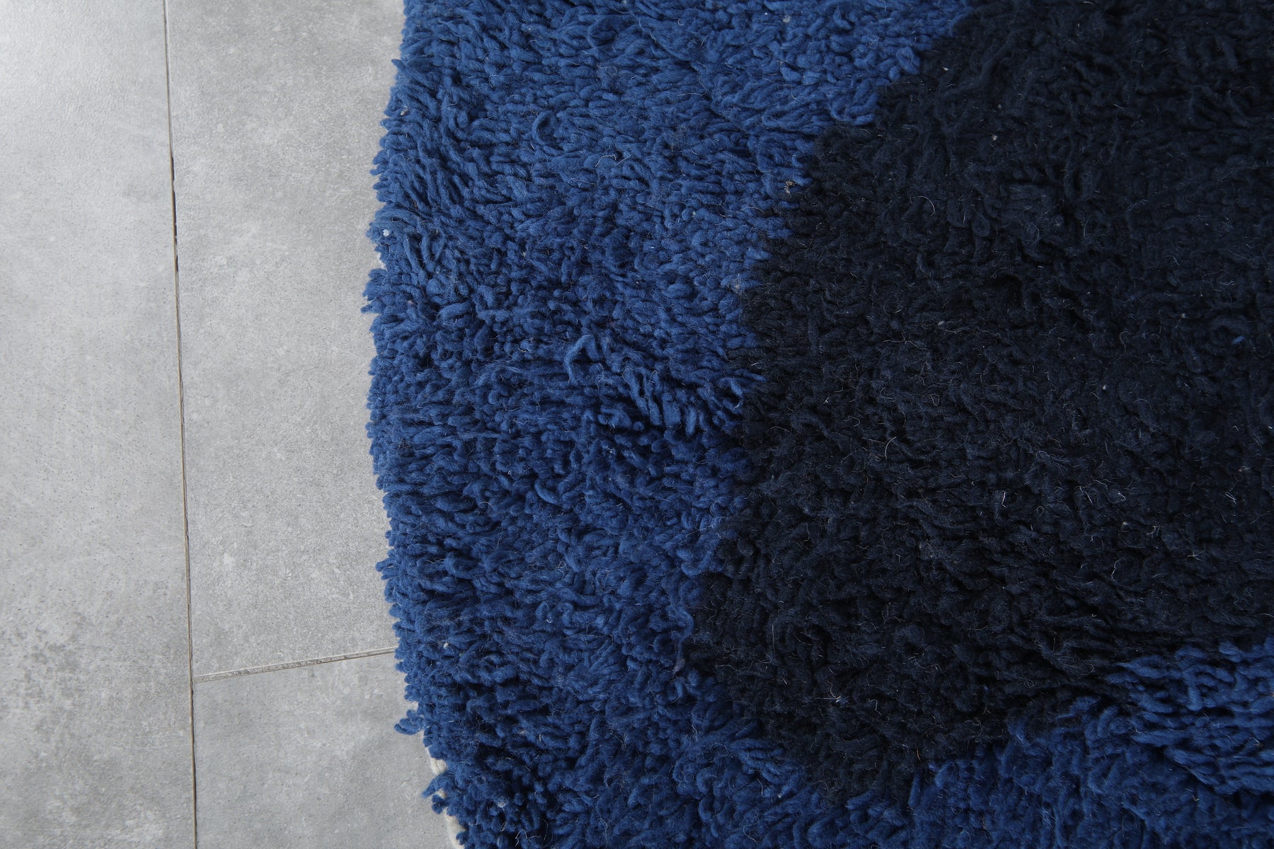 Elevate your décor with this 5.1-foot round Moroccan wool rug in deep midnight blue, accented by contrasting black patterns. Handwoven from premium natural wool, this rug blends modern elegance with traditional Moroccan craftsmanship.