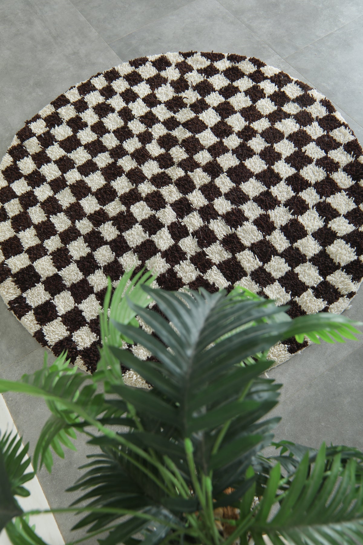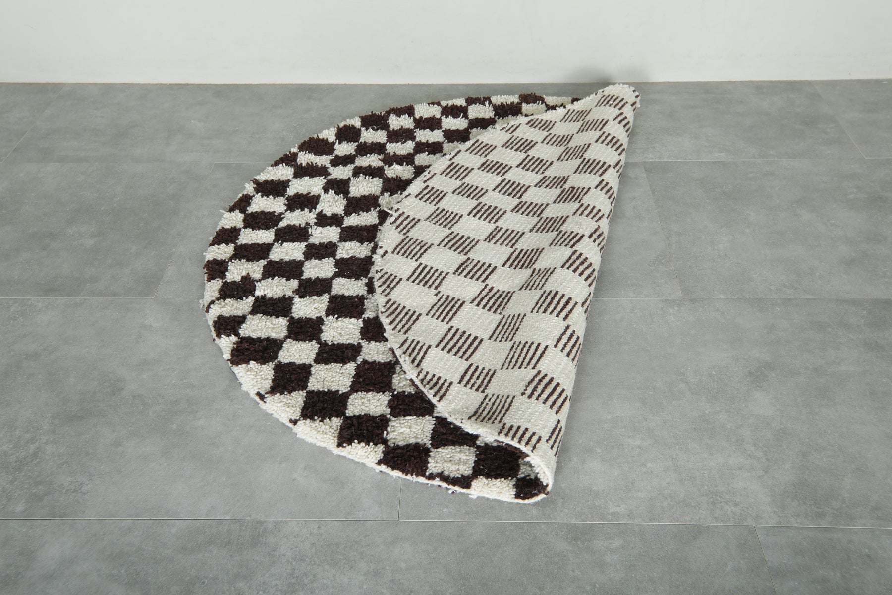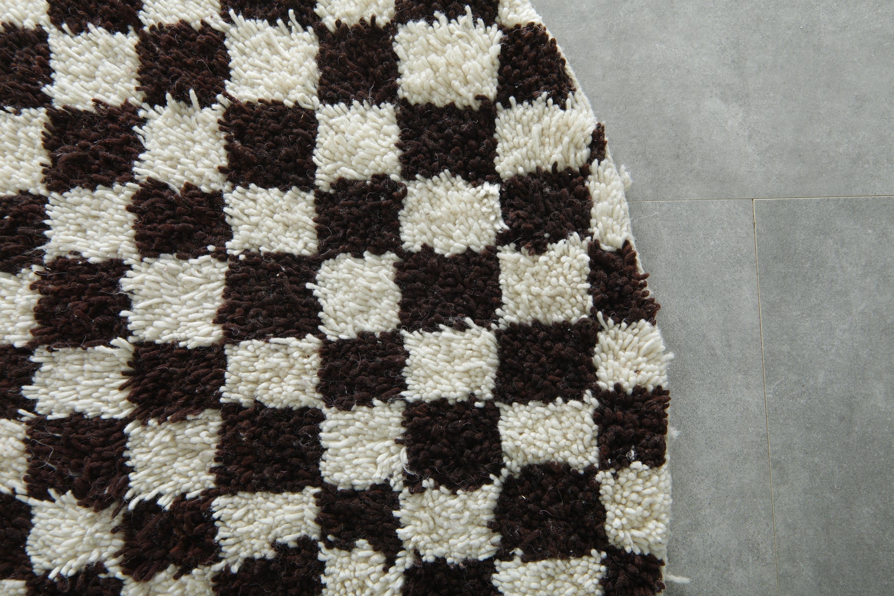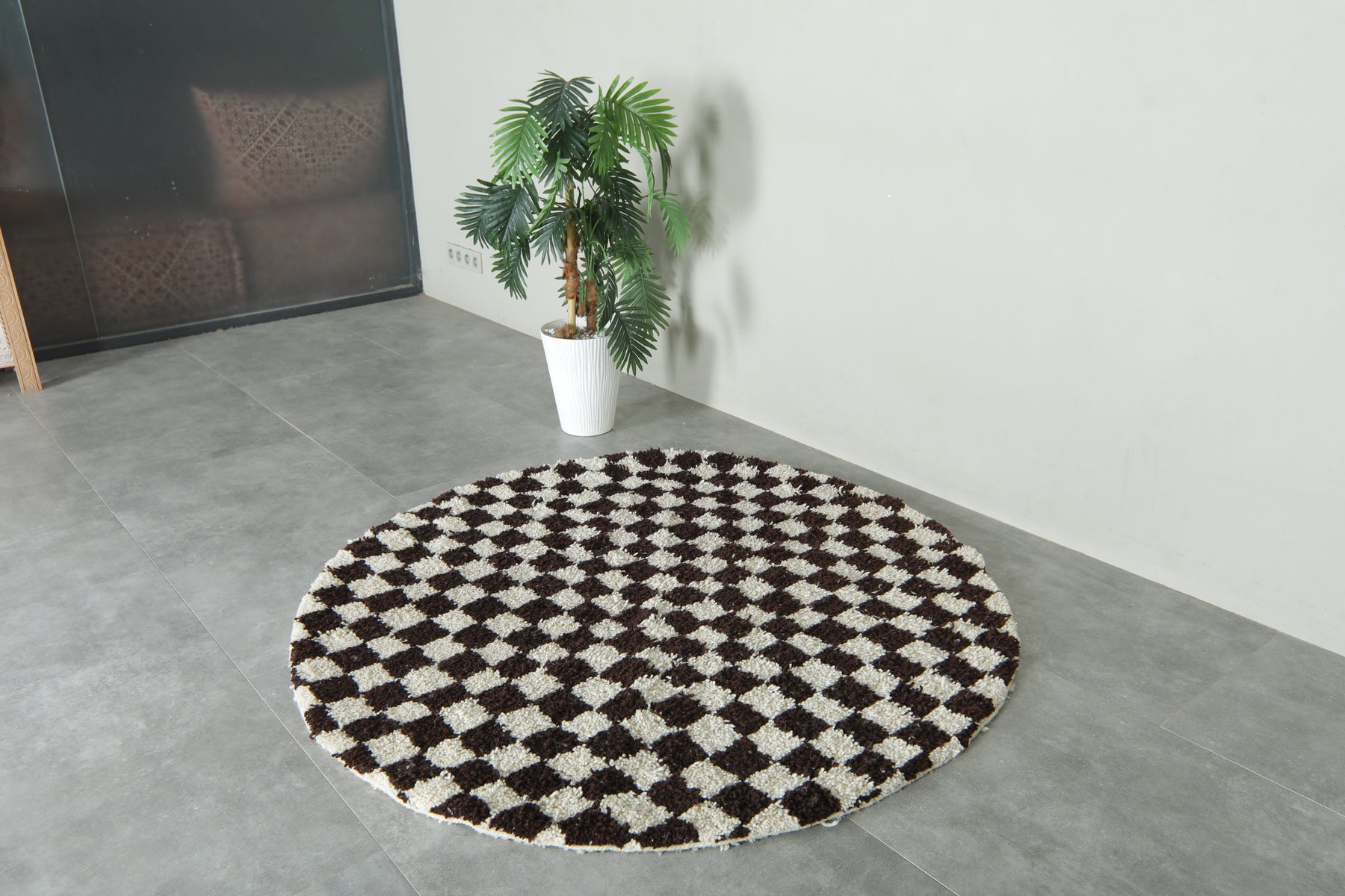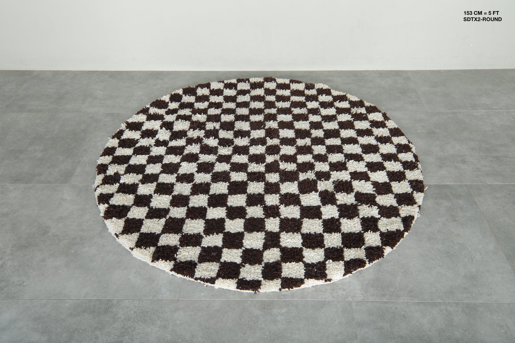 Round dark brown and white checkered Moroccan wool rug - 5 ft