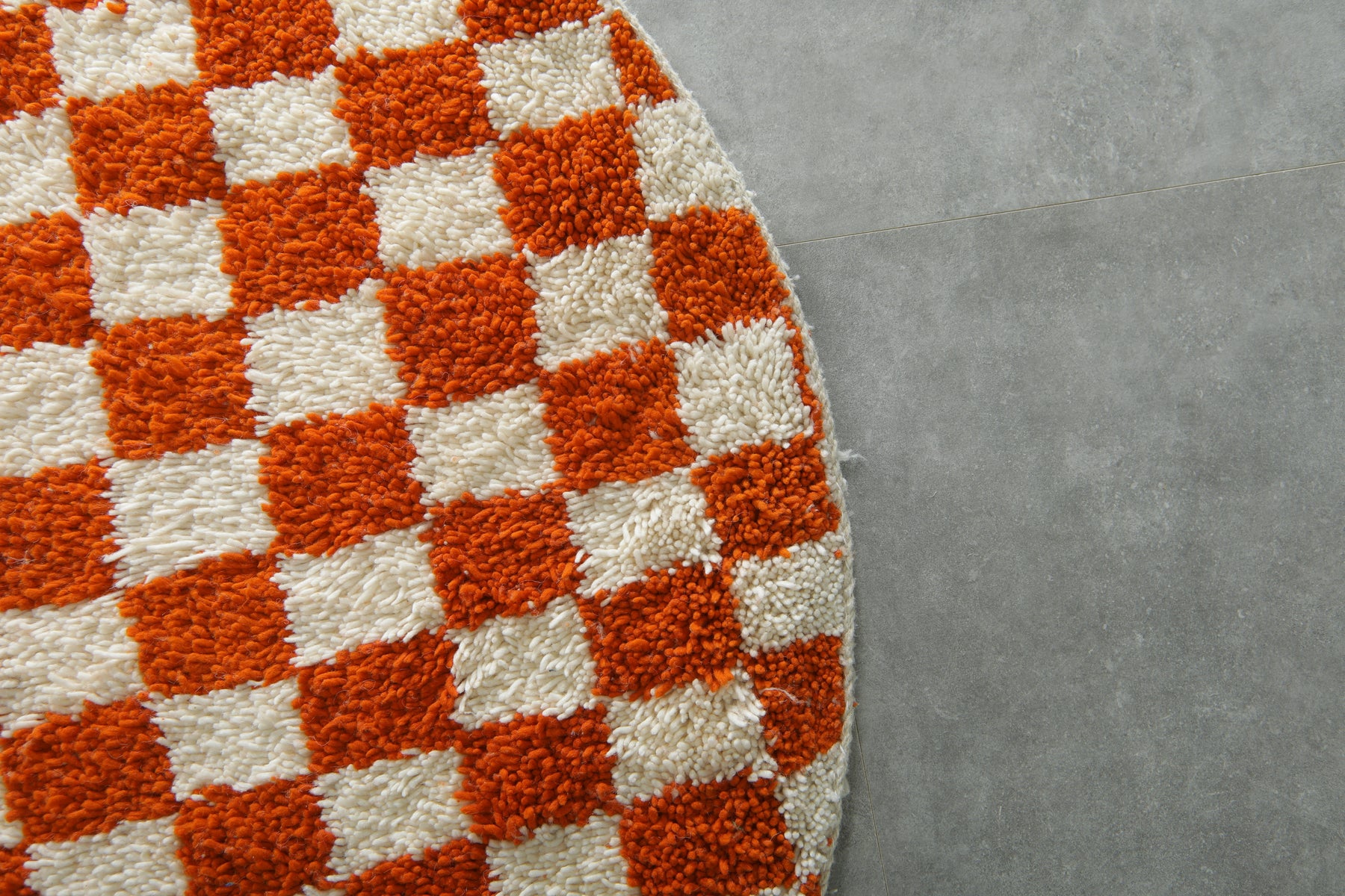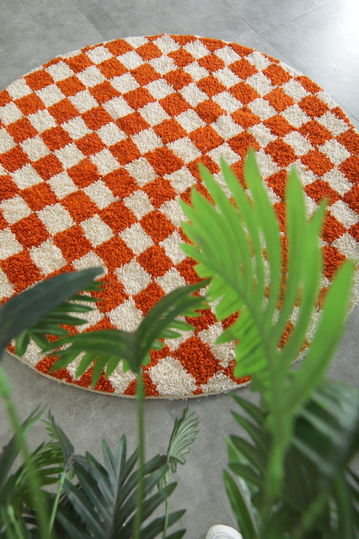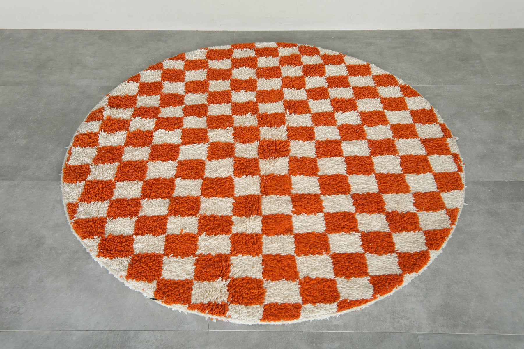 Round Moroccan Wool Rug - 5ft Orange Checkerboard