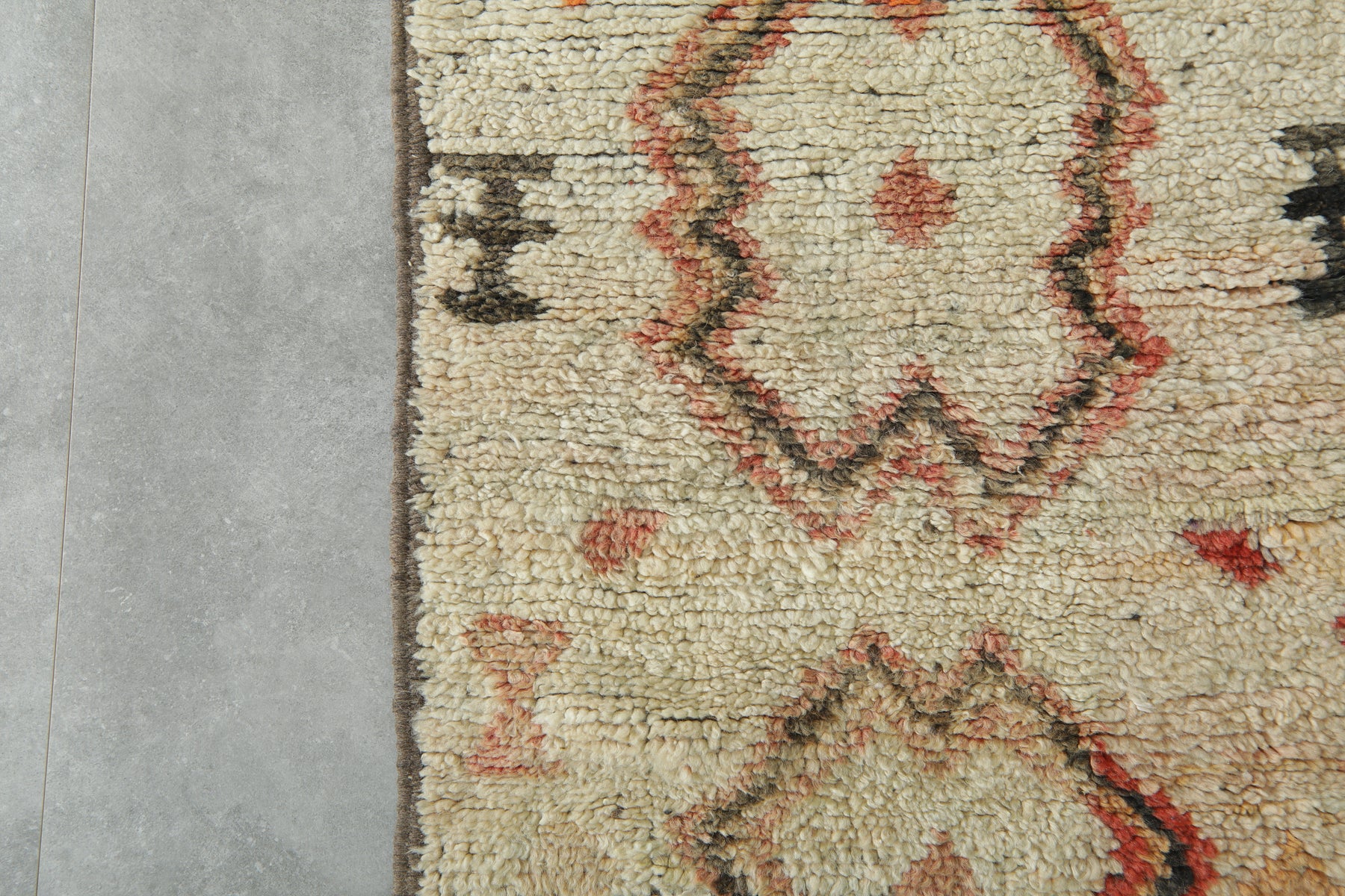 Bring natural warmth and artistic detail to your space with this Cream Tribal Runner Rug. Handwoven with care, it features a beige base accented by rustic tones of red, burnt orange, and brown—highlighted by bold geometric motifs and subtle black tribal symbols that nod to authentic Berber craftsmanship.