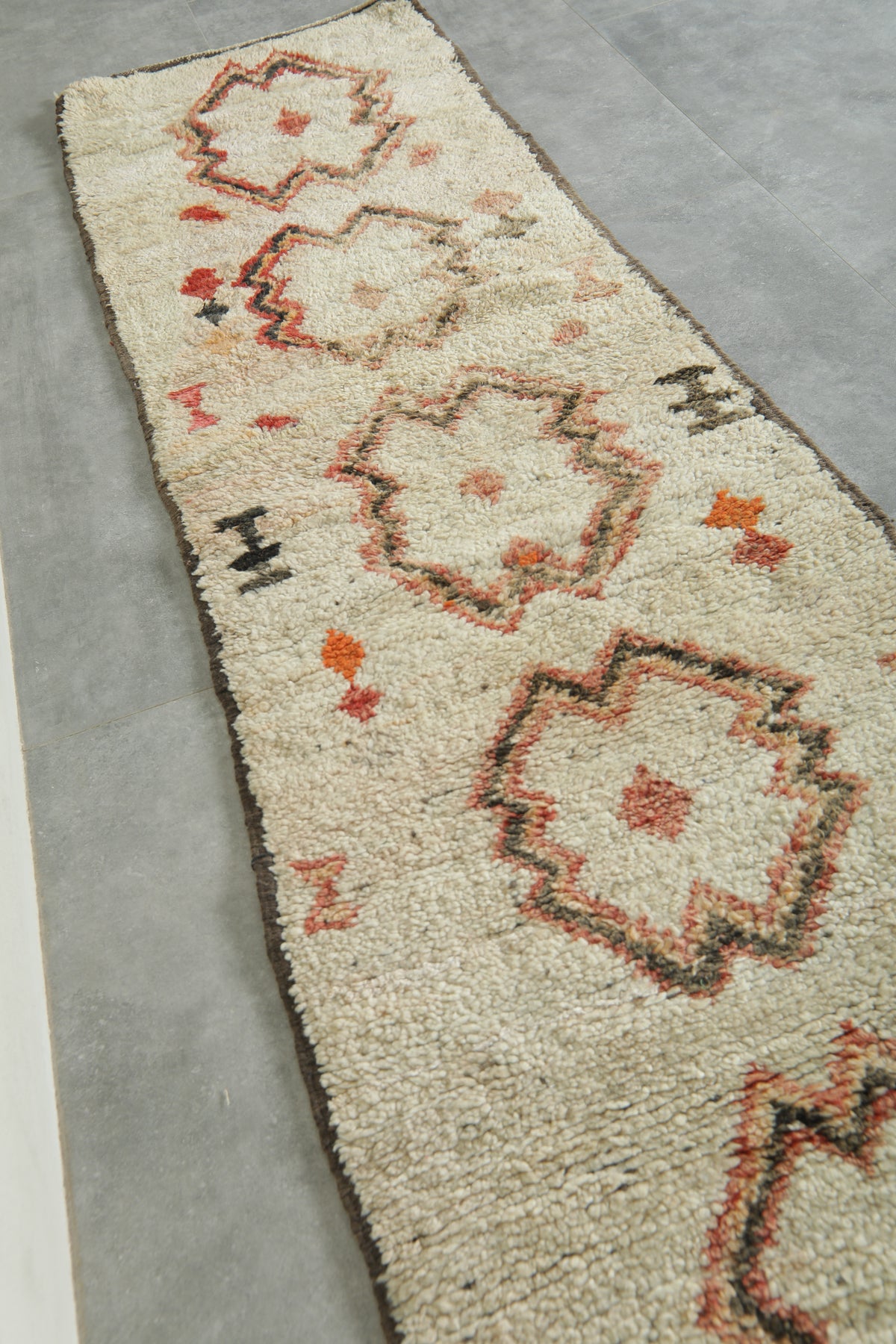 The long, narrow silhouette makes it ideal for hallways, kitchens, or bedsides, offering both function and visual interest. Its plush wool texture provides comfort underfoot, while the organic, slightly faded finish adds character and a sense of history. Whether you're styling a modern boho interior or a cozy rustic home, this runner delivers understated elegance and global charm.