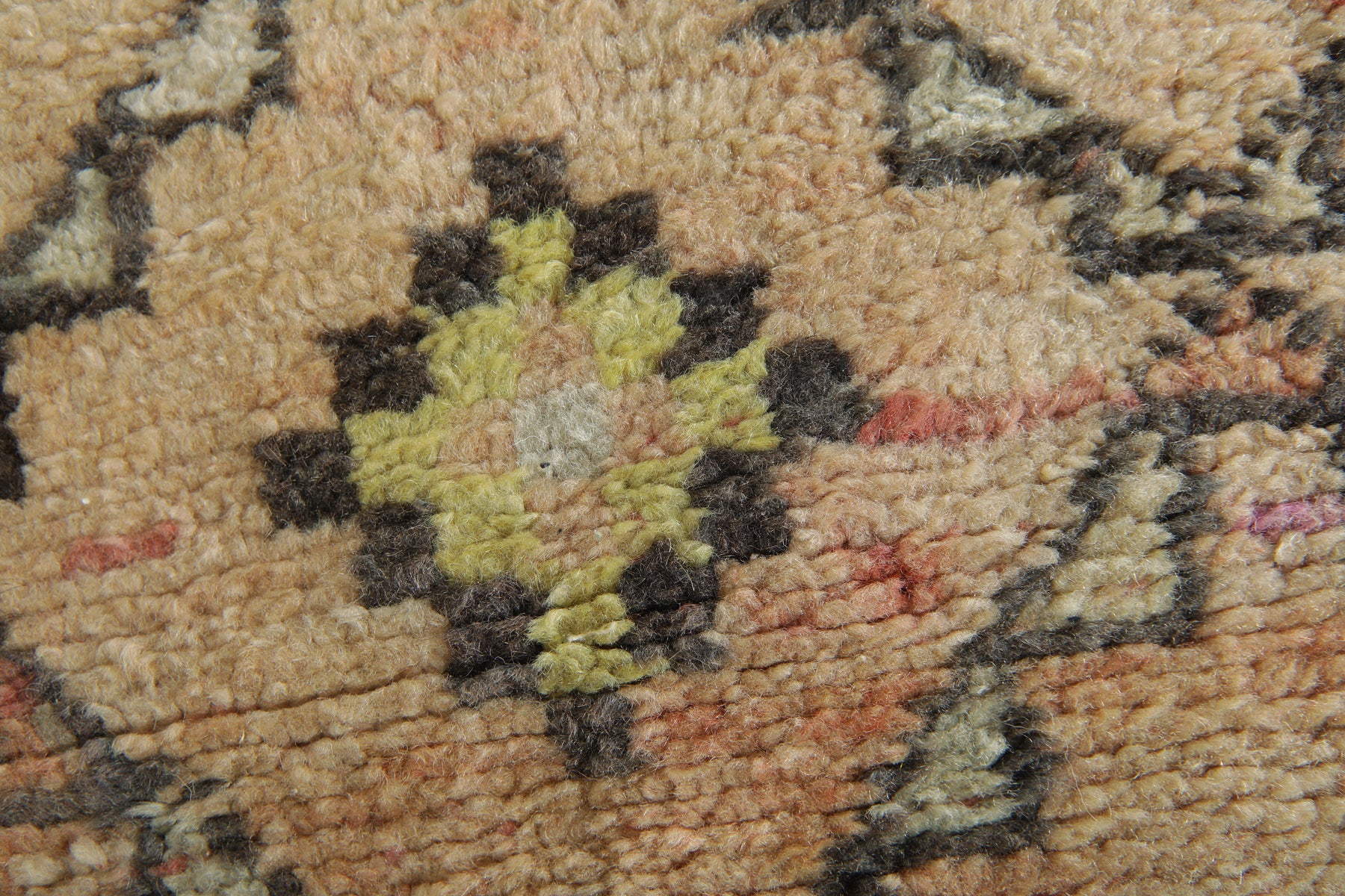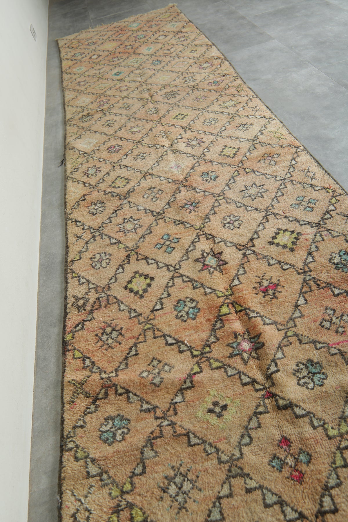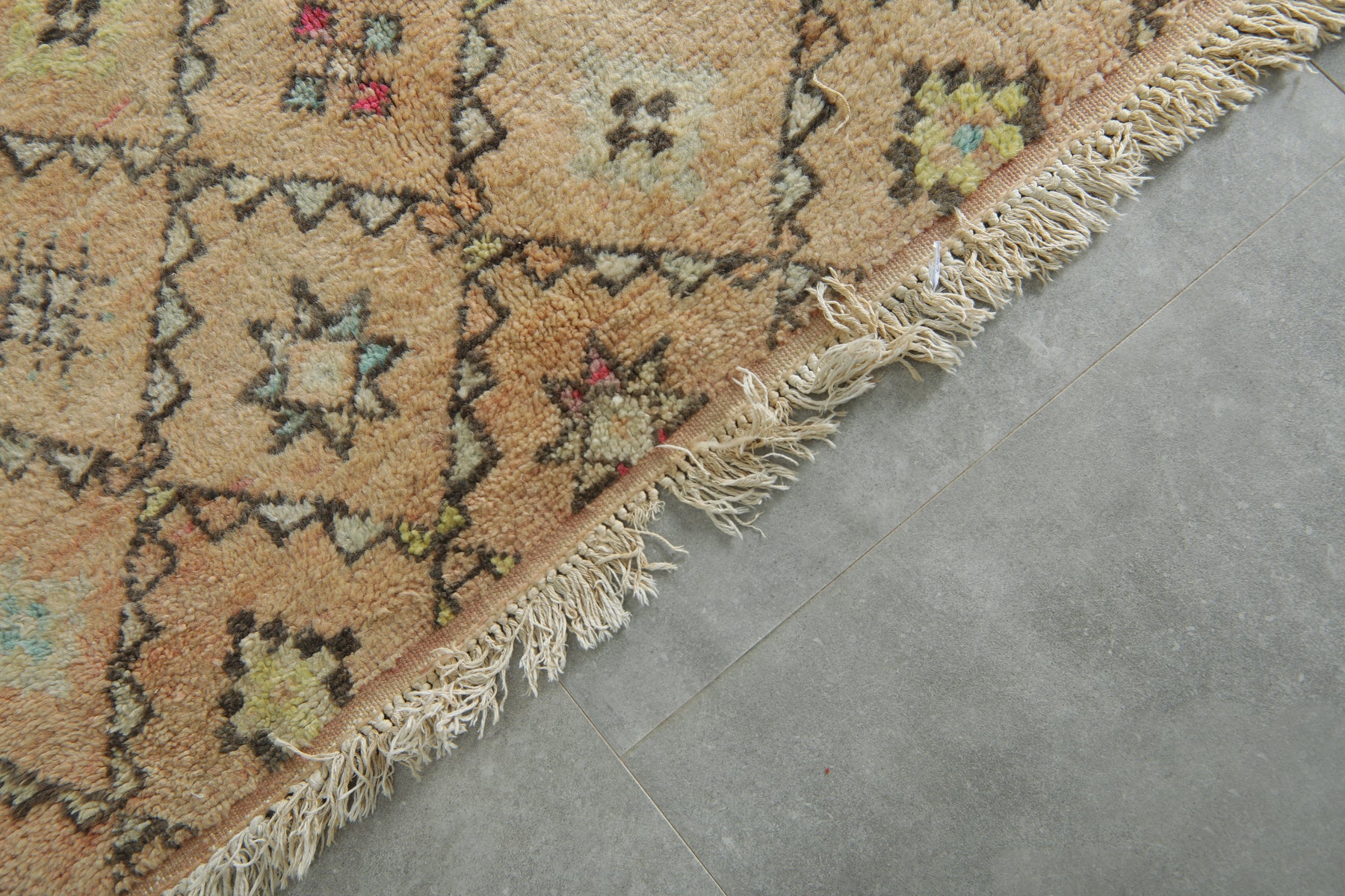Add warmth and elegance to your space with this handmade Moroccan runner rug featuring a soft beige base and intricate diamond and star motifs in muted tones of pink, green, and blue. Perfect for hallways, entryways, or narrow spaces, this vintage wool rug blends traditional Berber craftsmanship with a timeless, earthy aesthetic that complements boho, minimalist, or rustic interiors.