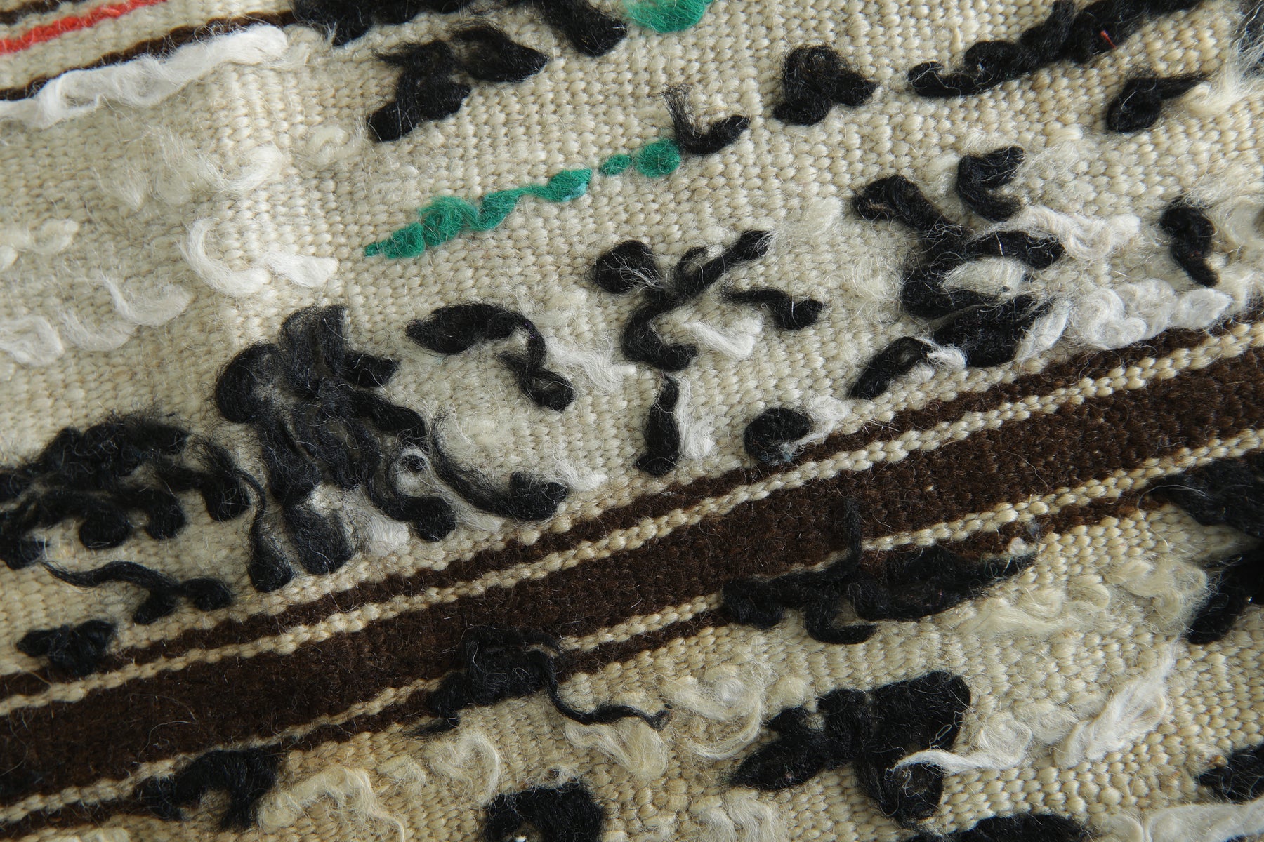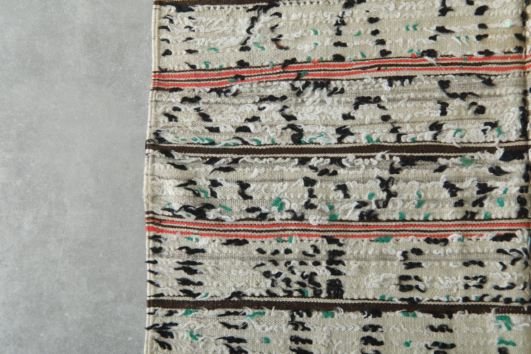 Add an element of artisanal elegance to your living space with this Flatwoven Tribal Rug, featuring a cream background with black speckles, red and brown stripes, and muted green highlights. The unique handwoven appearance and low pile make it the perfect fit for both modern and bohemian-inspired interiors.