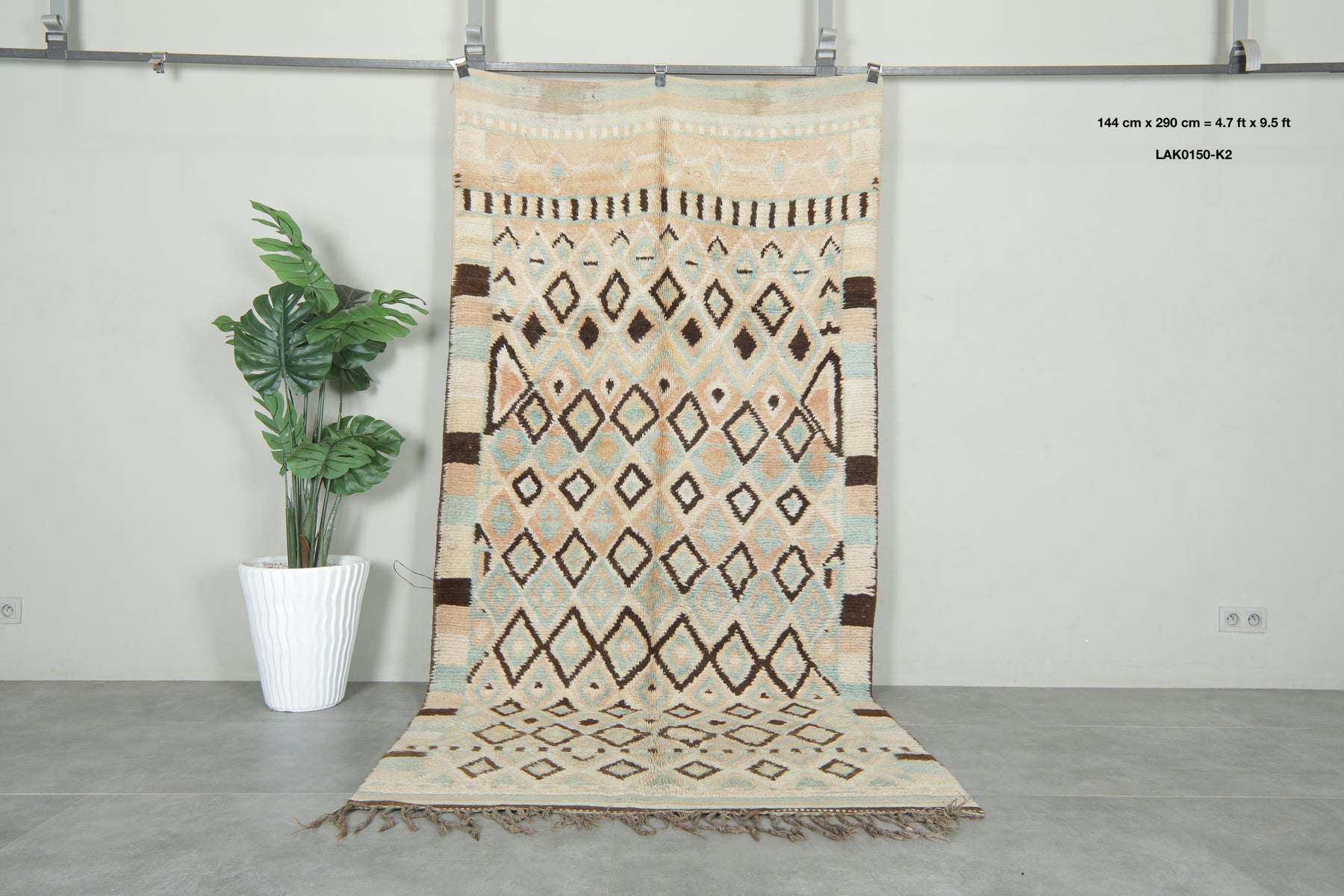 Introduce warmth and elegance to your room with this Moroccan Wool Rug, meticulously handwoven in a calming palette of cream, light beige, sky blue, pale peach, and dark brown. Embellished with the classic diamond lattice design, this rug brings texture and depth to any space, and its subdued color scheme is easy to incorporate into boho, modern, or neutral-themed decors.