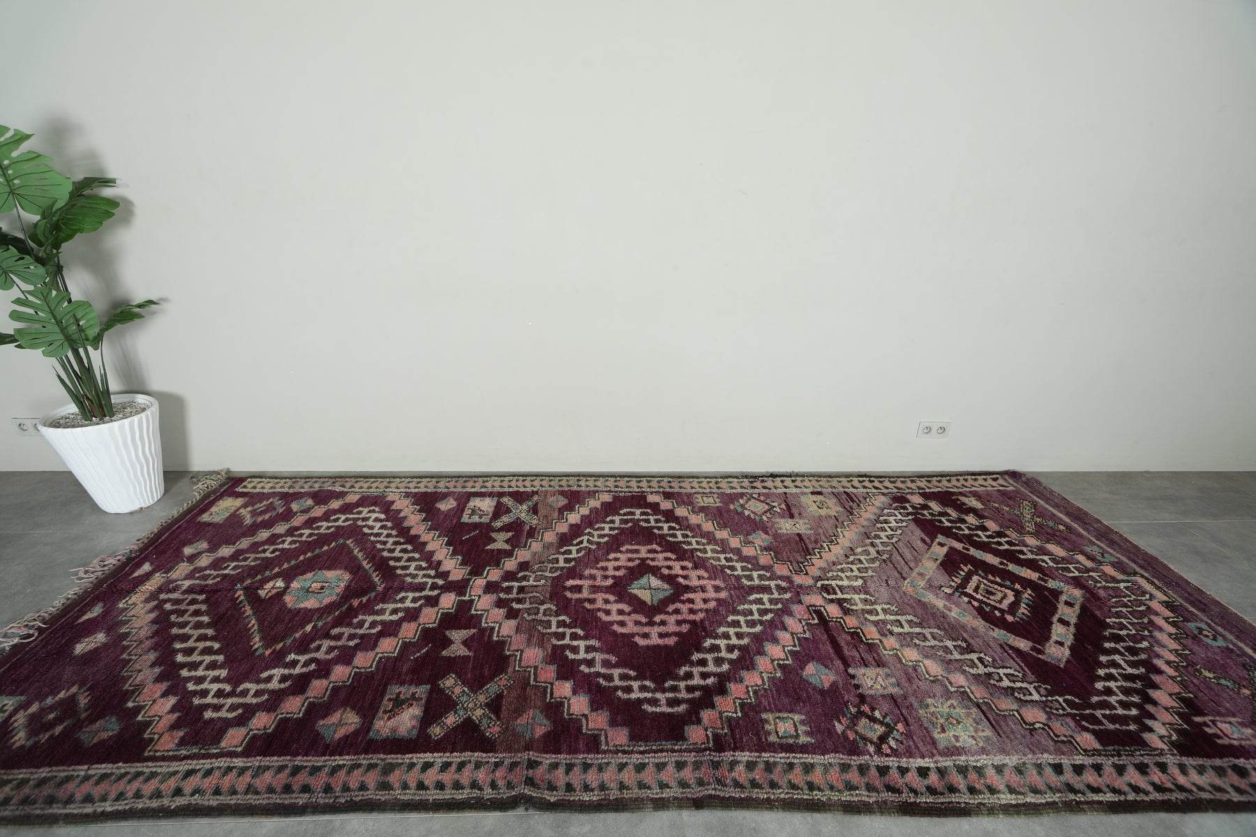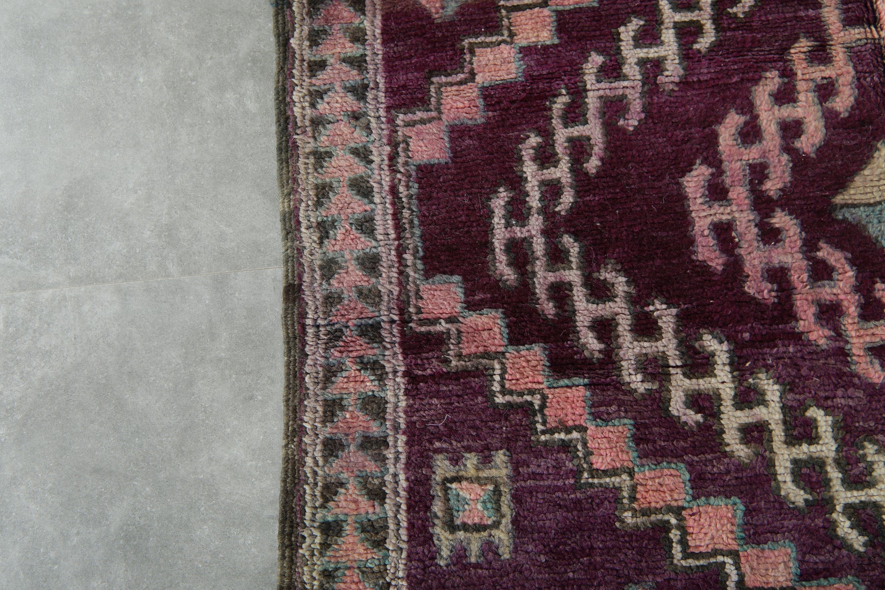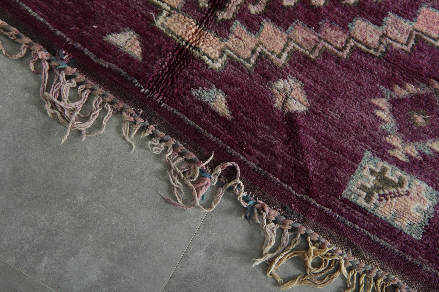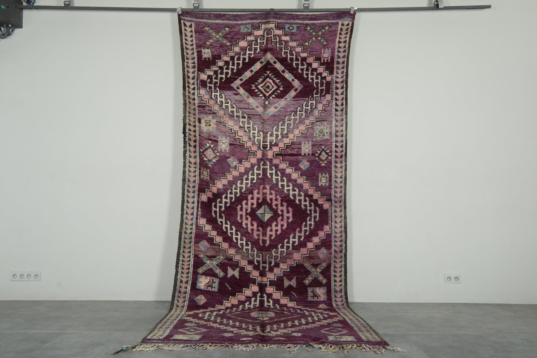 Make a bold statement with this purple Moroccan Azilal rug, handwoven from natural wool by Berber artisans in the Atlas Mountains. Its striking purple base is enriched with traditional Azilal geometric motifs, creating a vibrant design that blends artistry with cultural heritage. The elongated size makes it ideal for hallways, large living areas, or dining spaces, while the soft wool texture adds warmth and comfort underfoot. Authentic and one-of-a-kind, this handmade rug brings Moroccan tradition and modern style together in a truly unique piece.