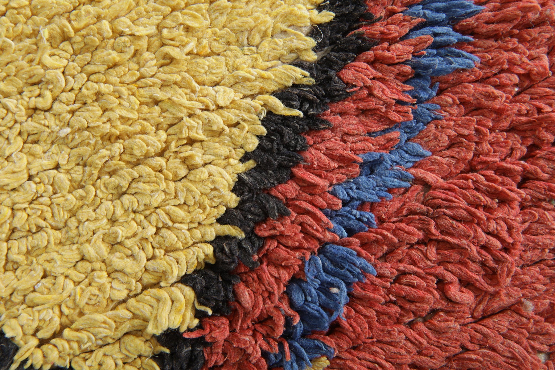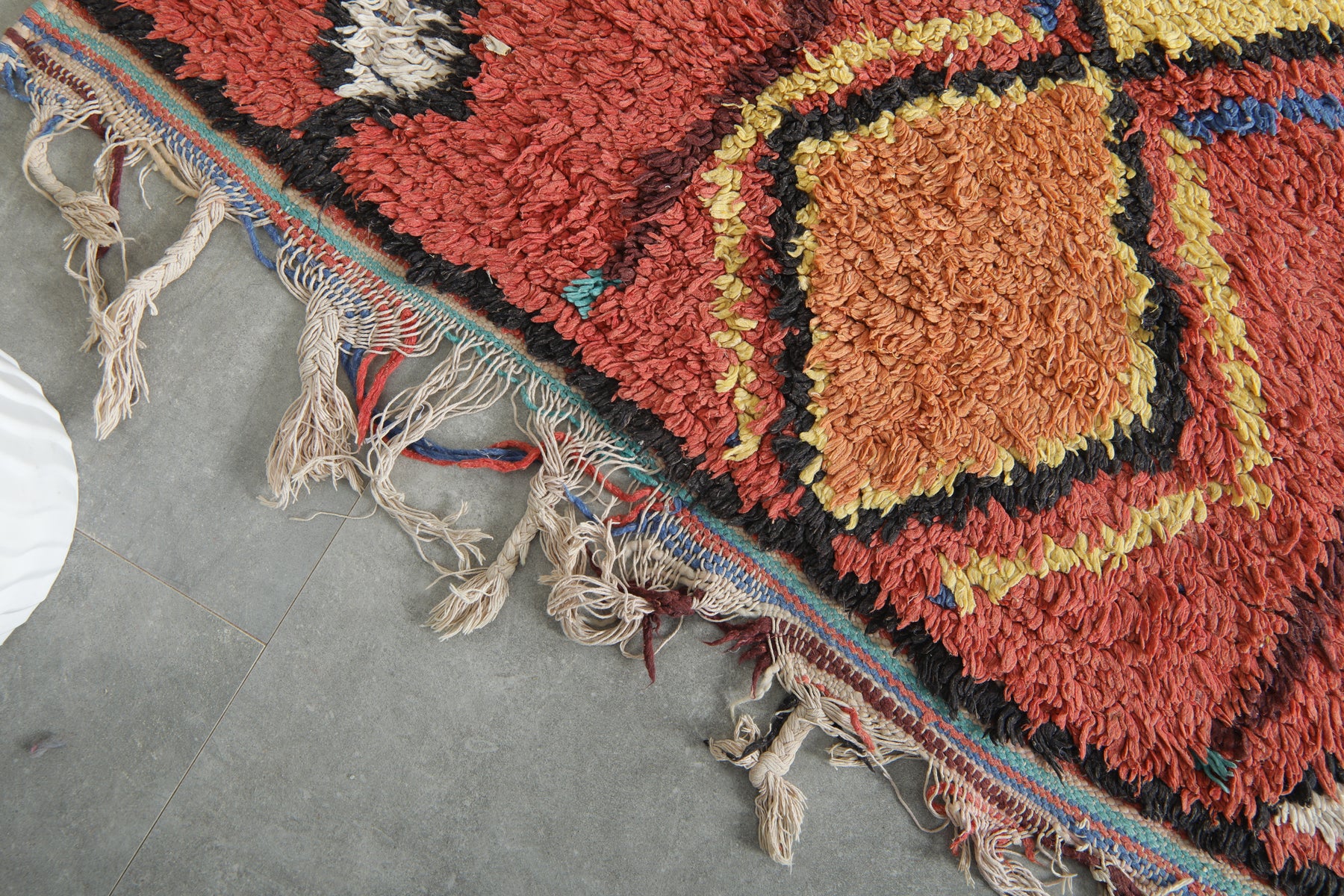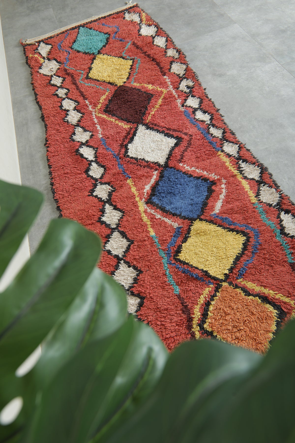 Add a dramatic splash to your room with this deeply colored Moroccan runner rug, featuring a terracotta red background and striking diamond motifs in turquoise, yellow, burgundy, and white. Handmade with authentic Berber heritage, this colorful rug brings warmth, energy, and cultural spice to any entryway, hallway, or narrow space.
