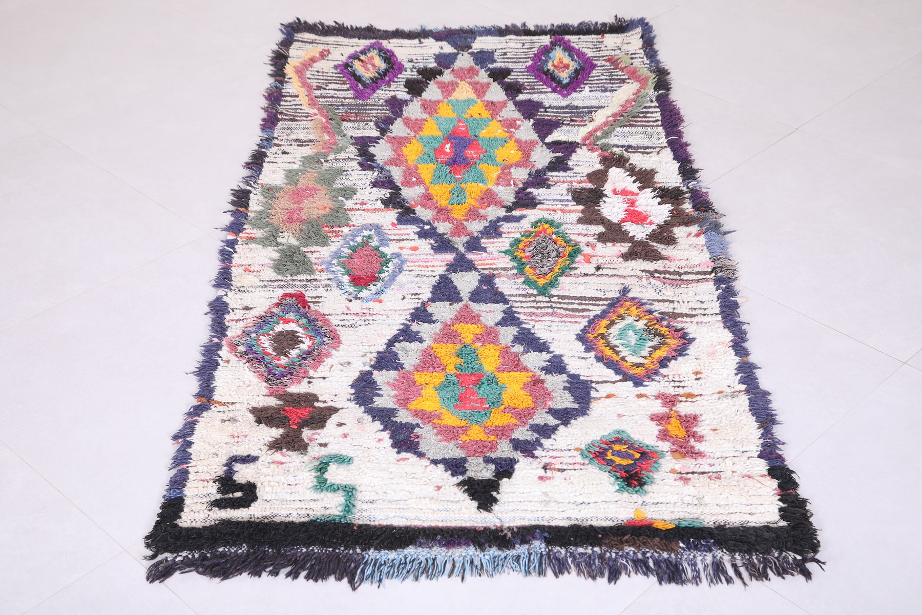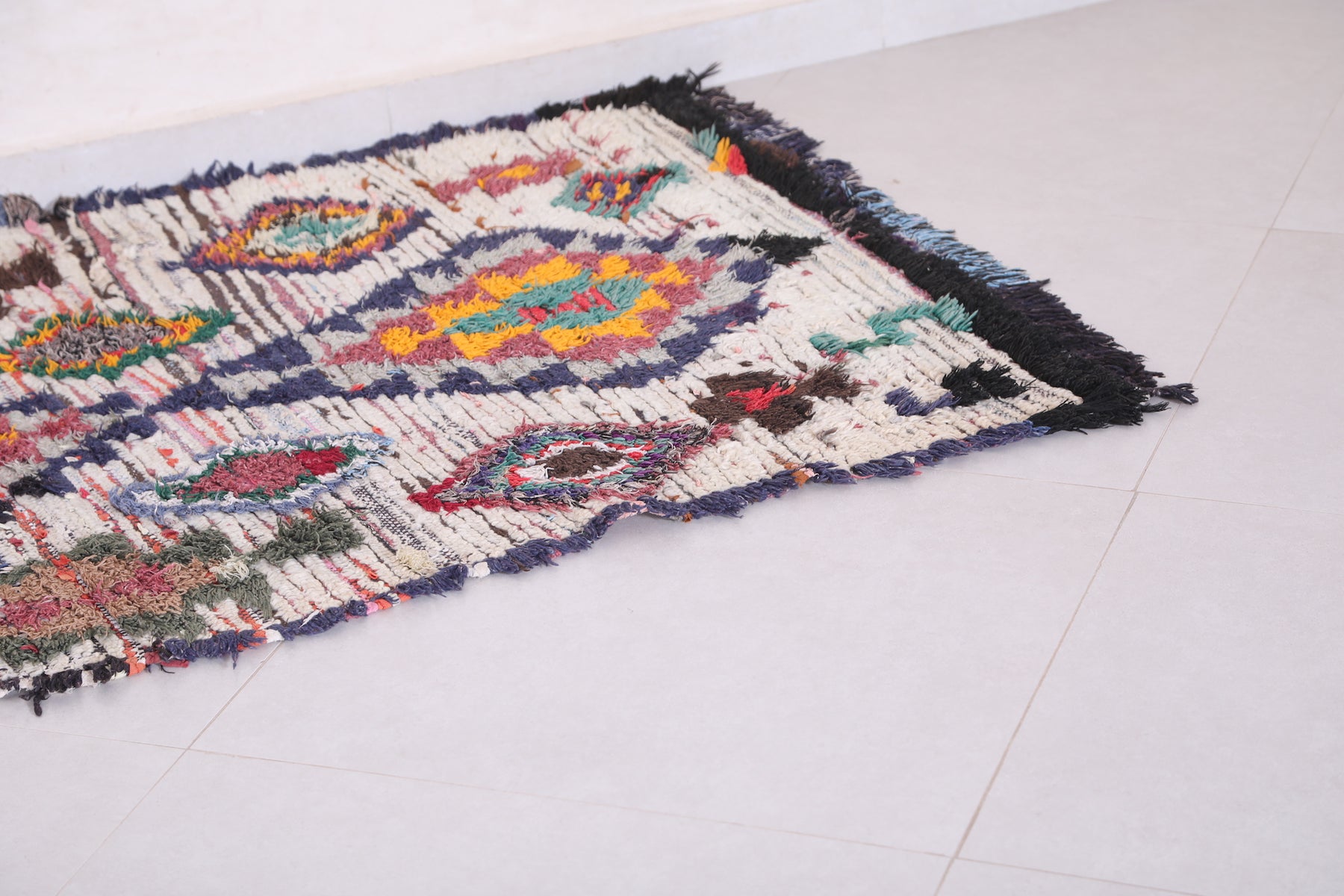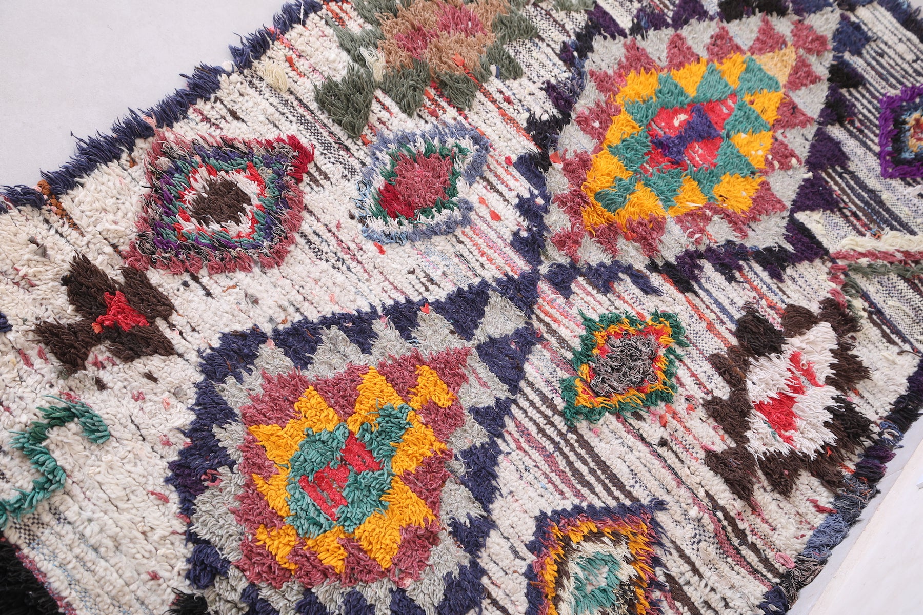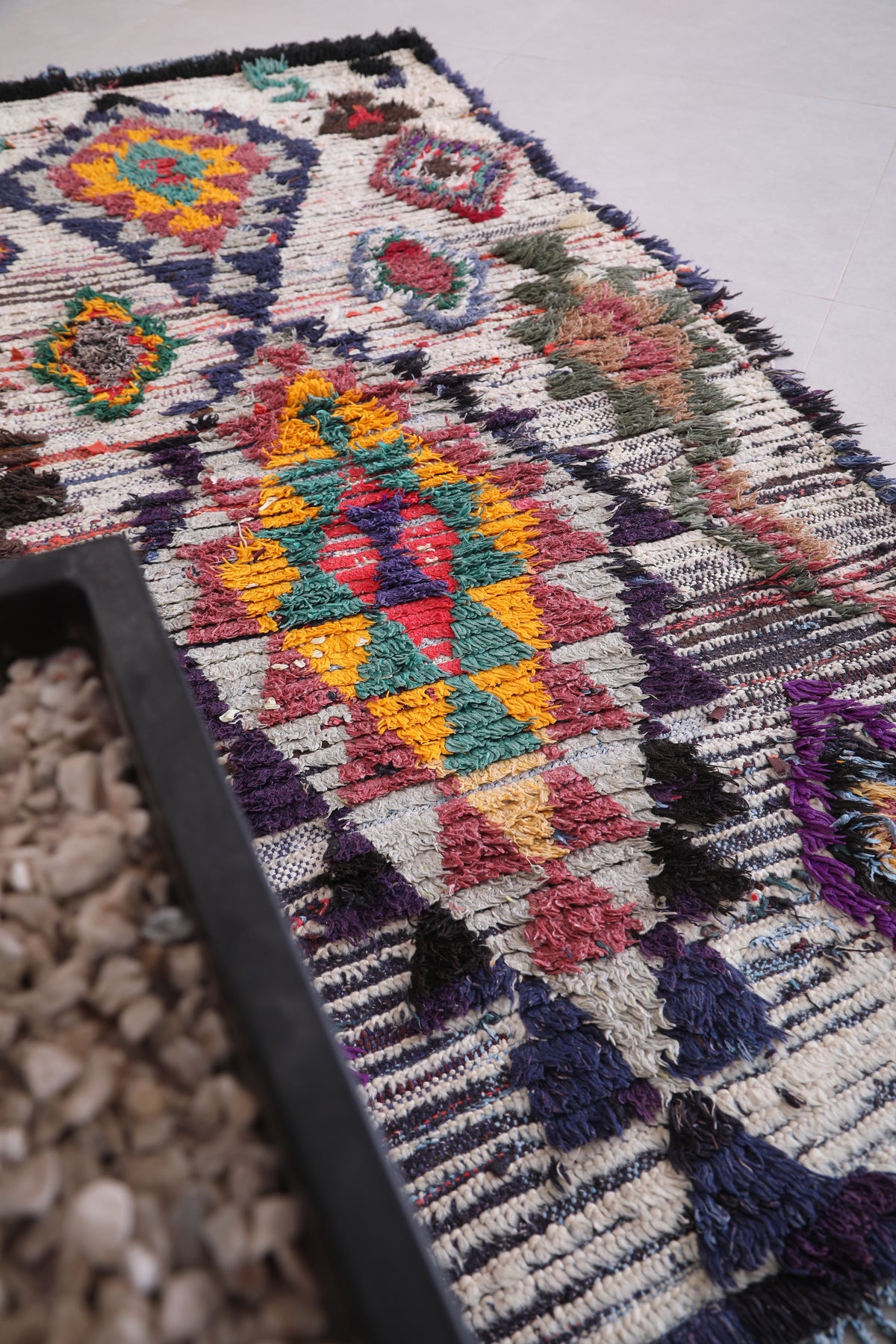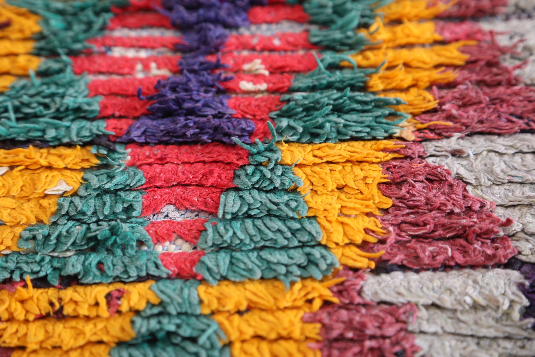 • Handwoven in Morocco using traditional Berber Boucherouite techniques