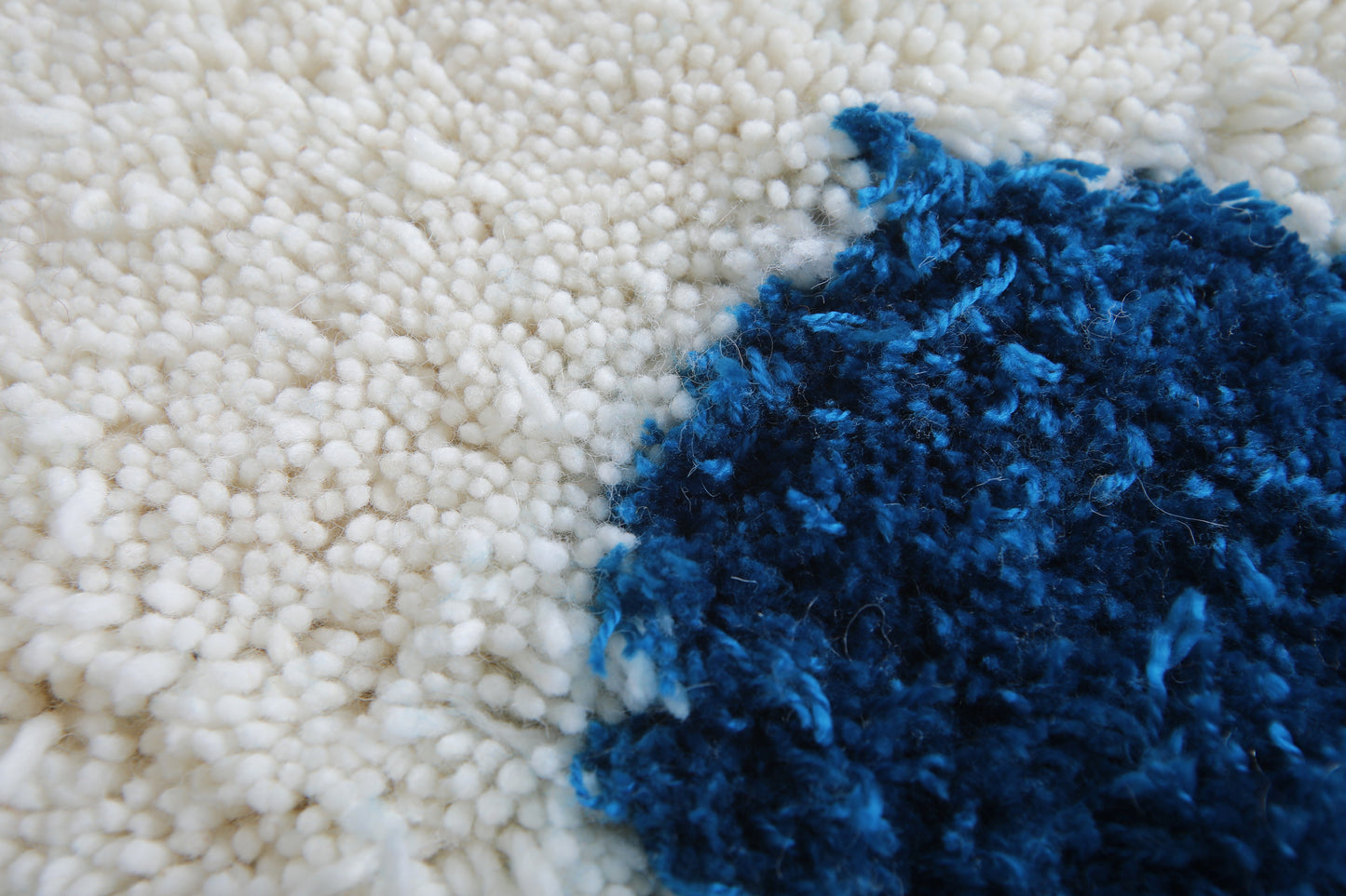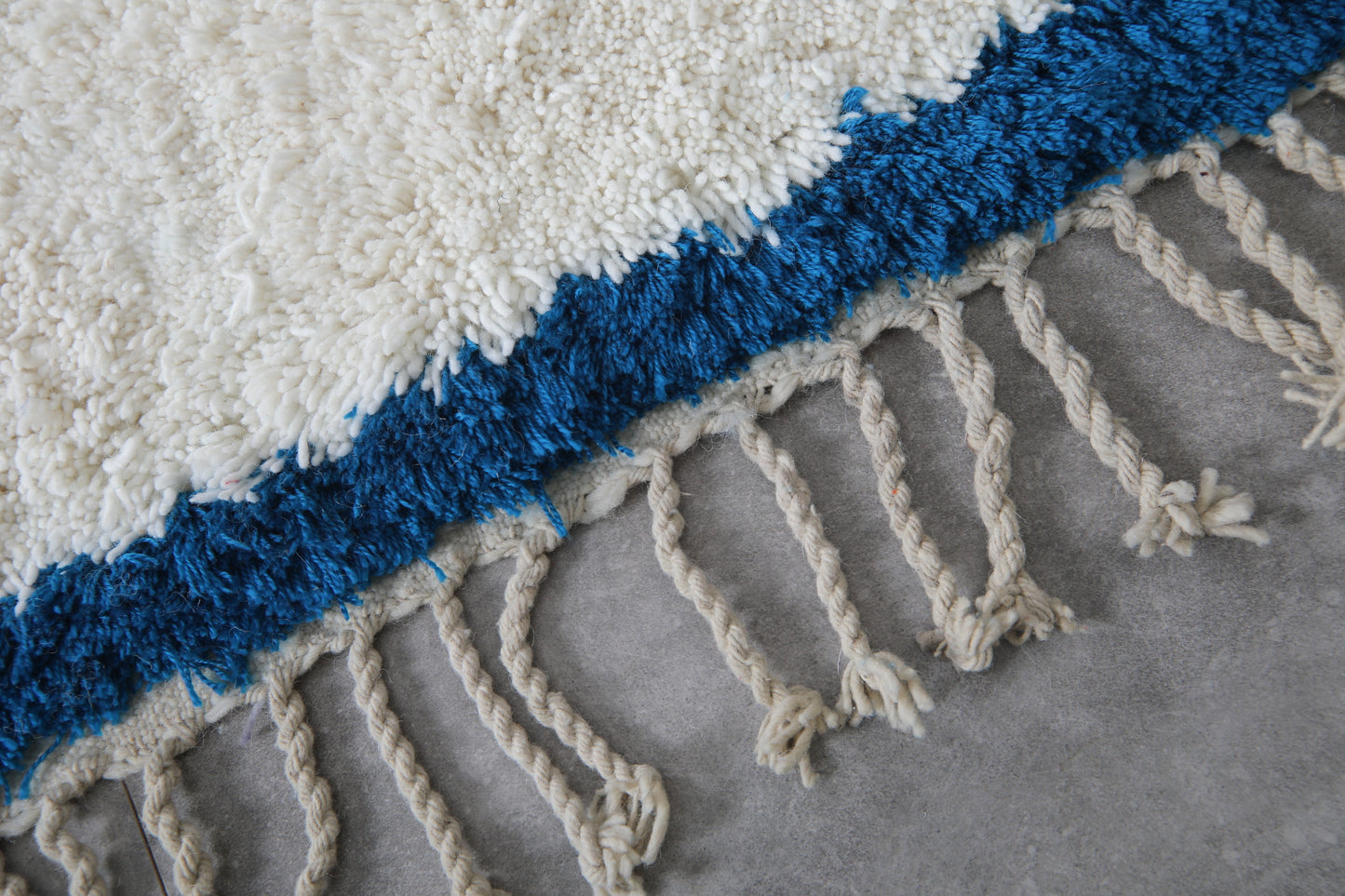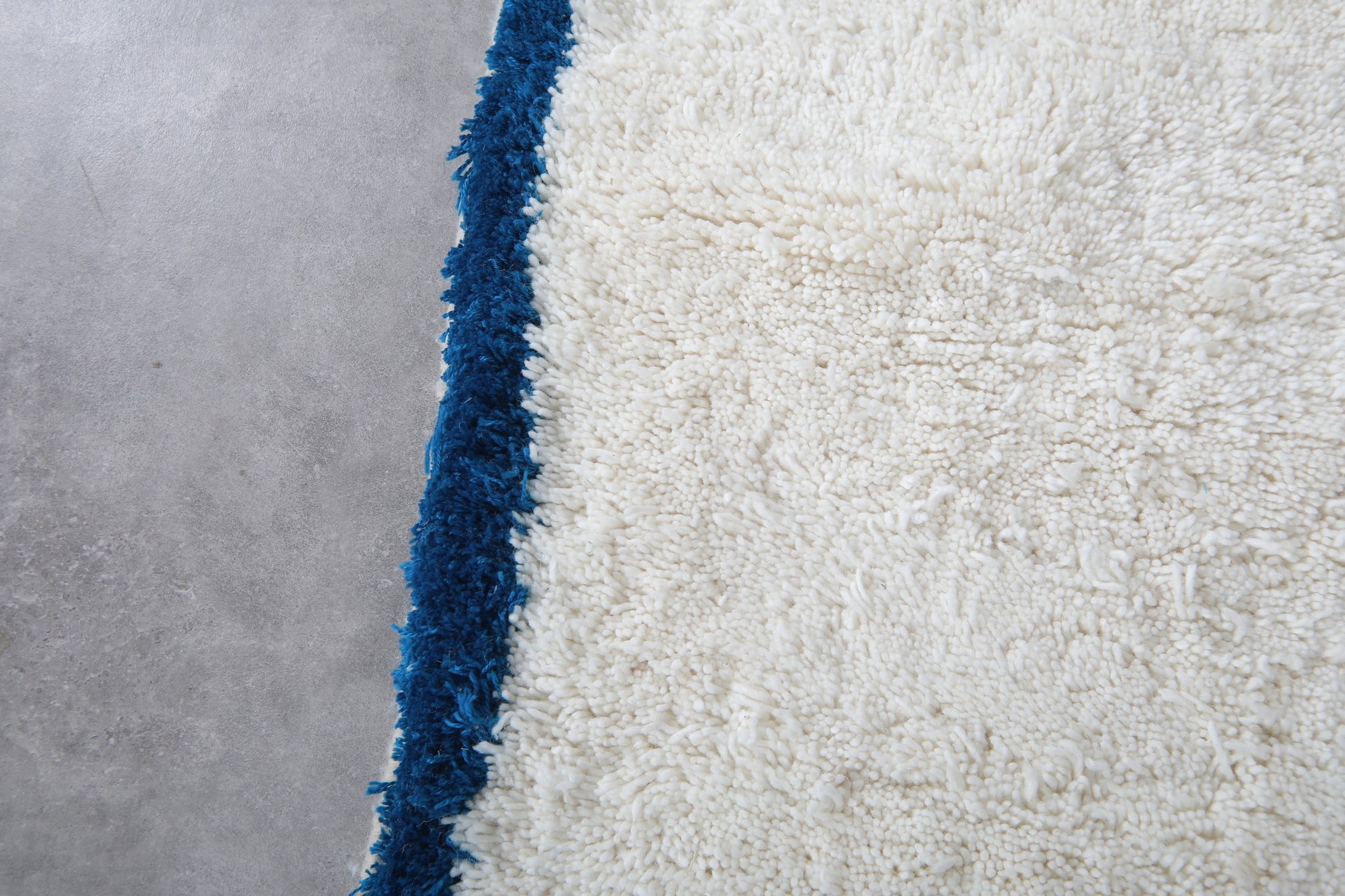 Custom size minimalist white Moroccan wool rug with bold blue accents