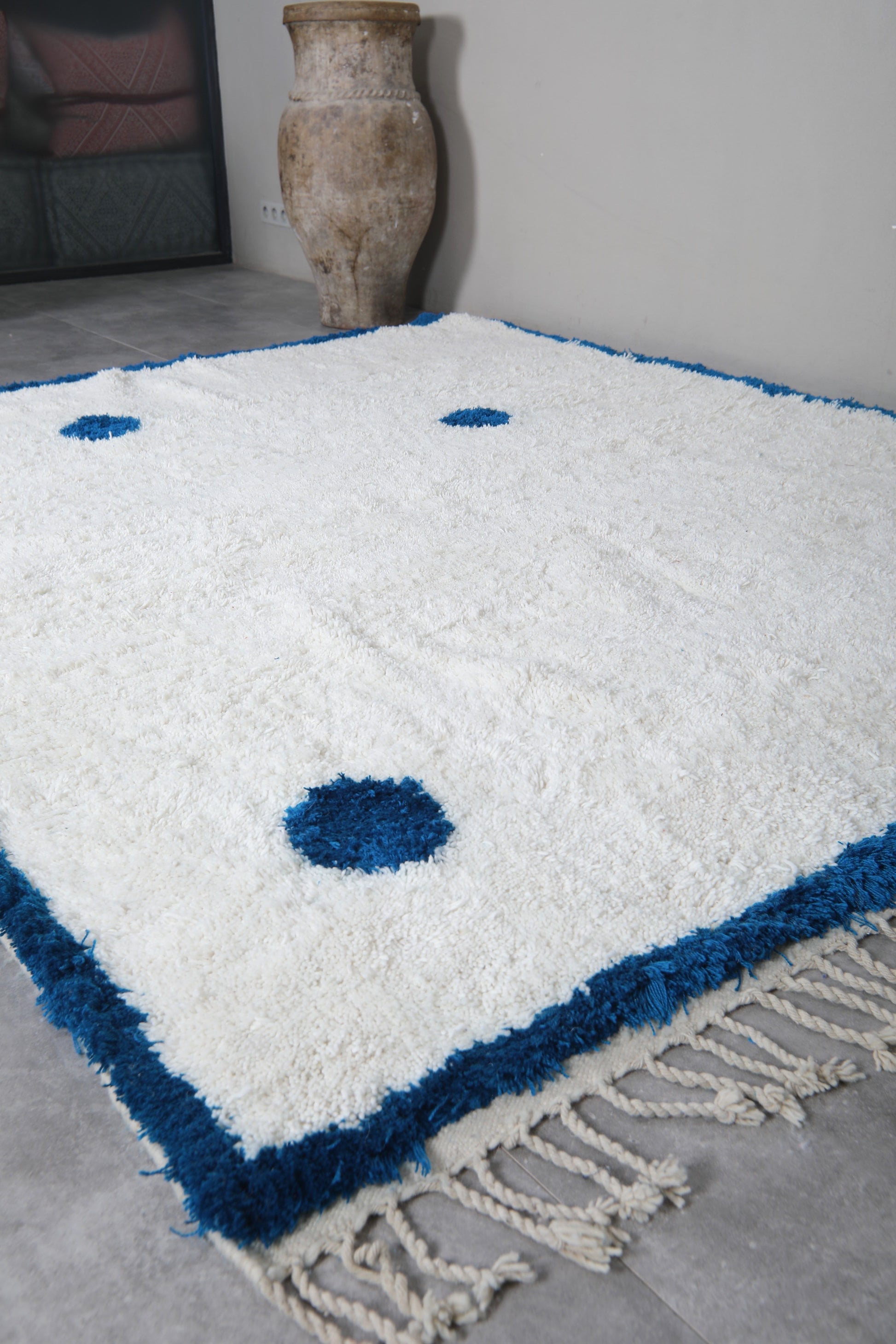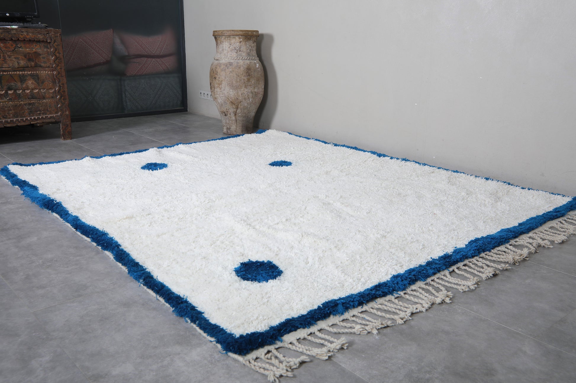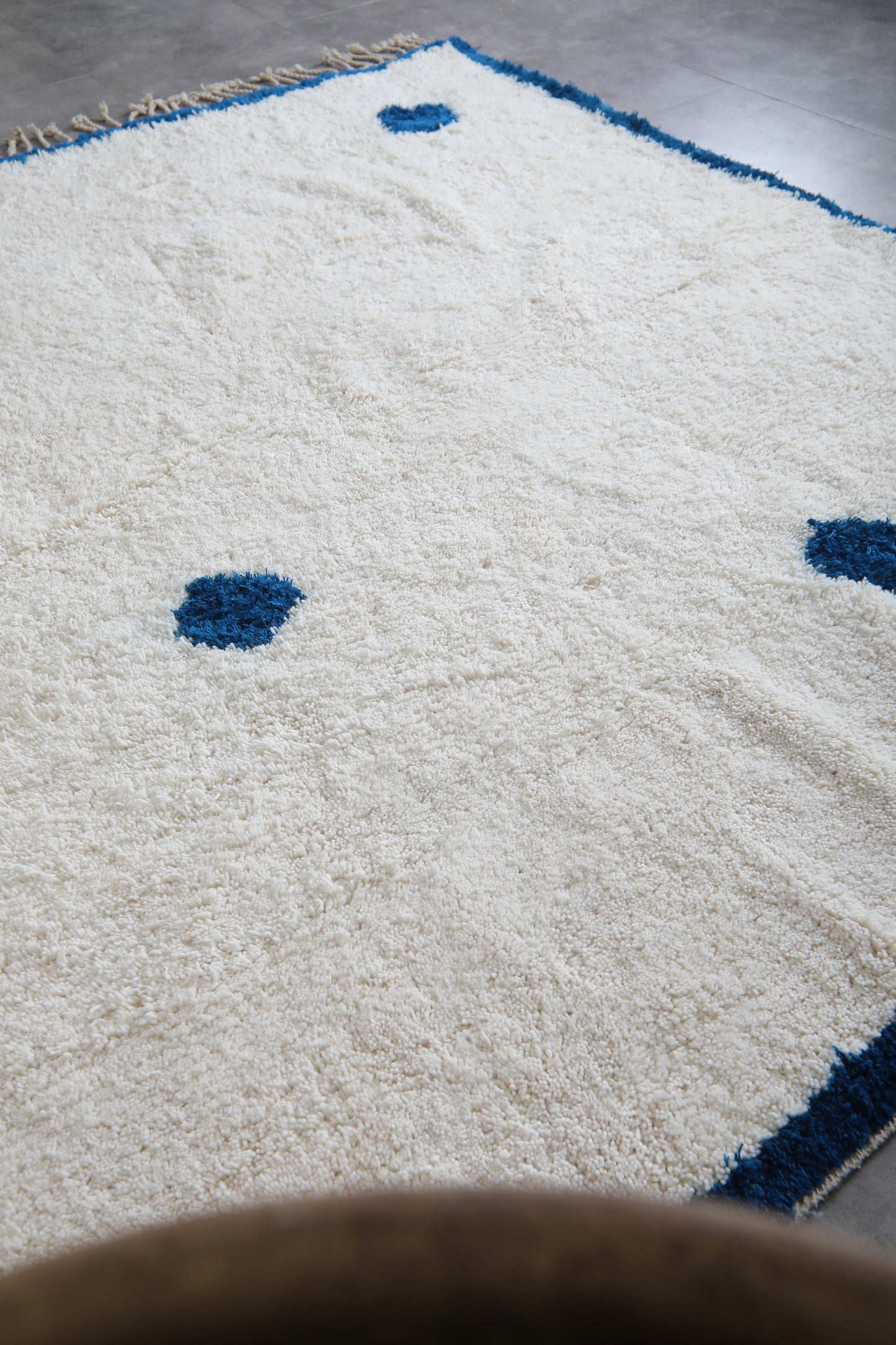 This Moroccan wool rug showcases a refined minimalist design that effortlessly combines tradition and modernity. Handwoven from high-quality wool, it features a soft white background that brings lightness to any space. The rug is framed with a deep blue border, adding a bold contrast, while three scattered blue diamond-shaped dots create a subtle yet artistic statement. Its clean and uncluttered design makes it a versatile piece, perfect for modern, Scandinavian, or bohemian interiors. The plush texture offers warmth and comfort underfoot, while the unique pattern adds just the right amount of character. Ideal for living rooms, bedrooms, or studios.