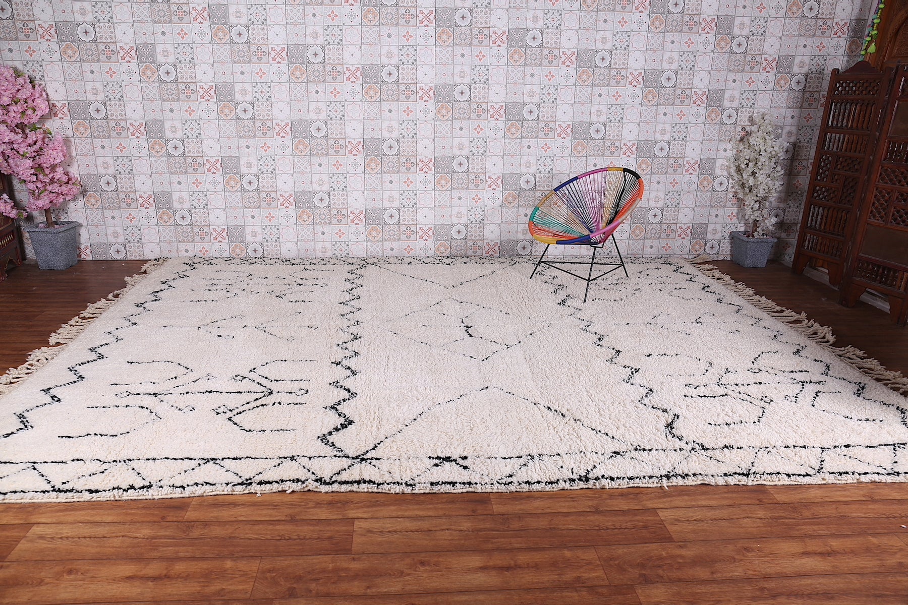 This authentic Beni Ourain rug features a luxurious ivory wool base with intricate black tribal motifs, inspired by traditional Berber symbols. Handwoven by Moroccan artisans, its plush texture and bold geometric lines make it a striking centerpiece for boho, modern, or eclectic interiors. The fringed edge and symbolic patterns tell a story of heritage and craftsmanship, adding warmth and cultural depth to any living room or bedroom space.