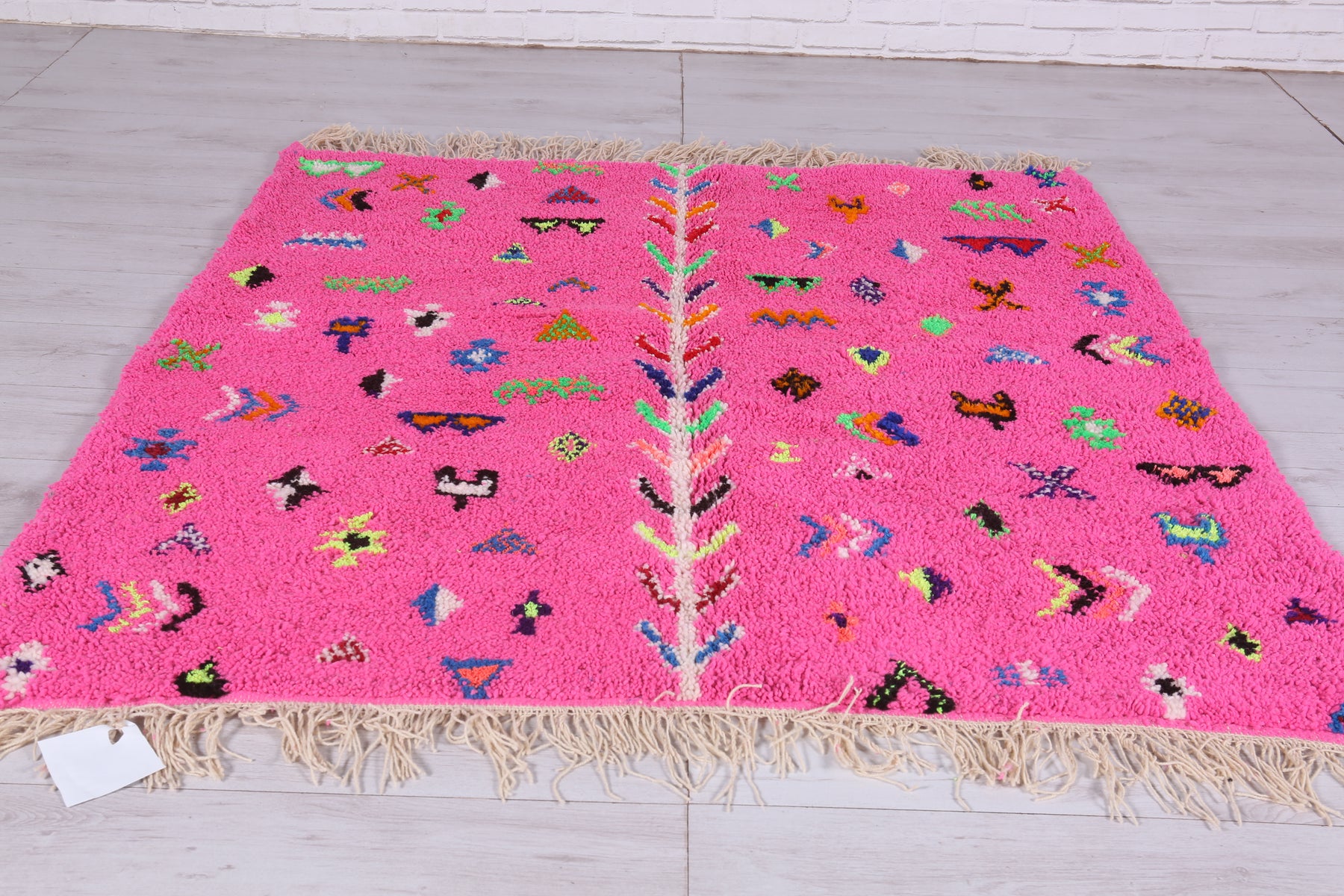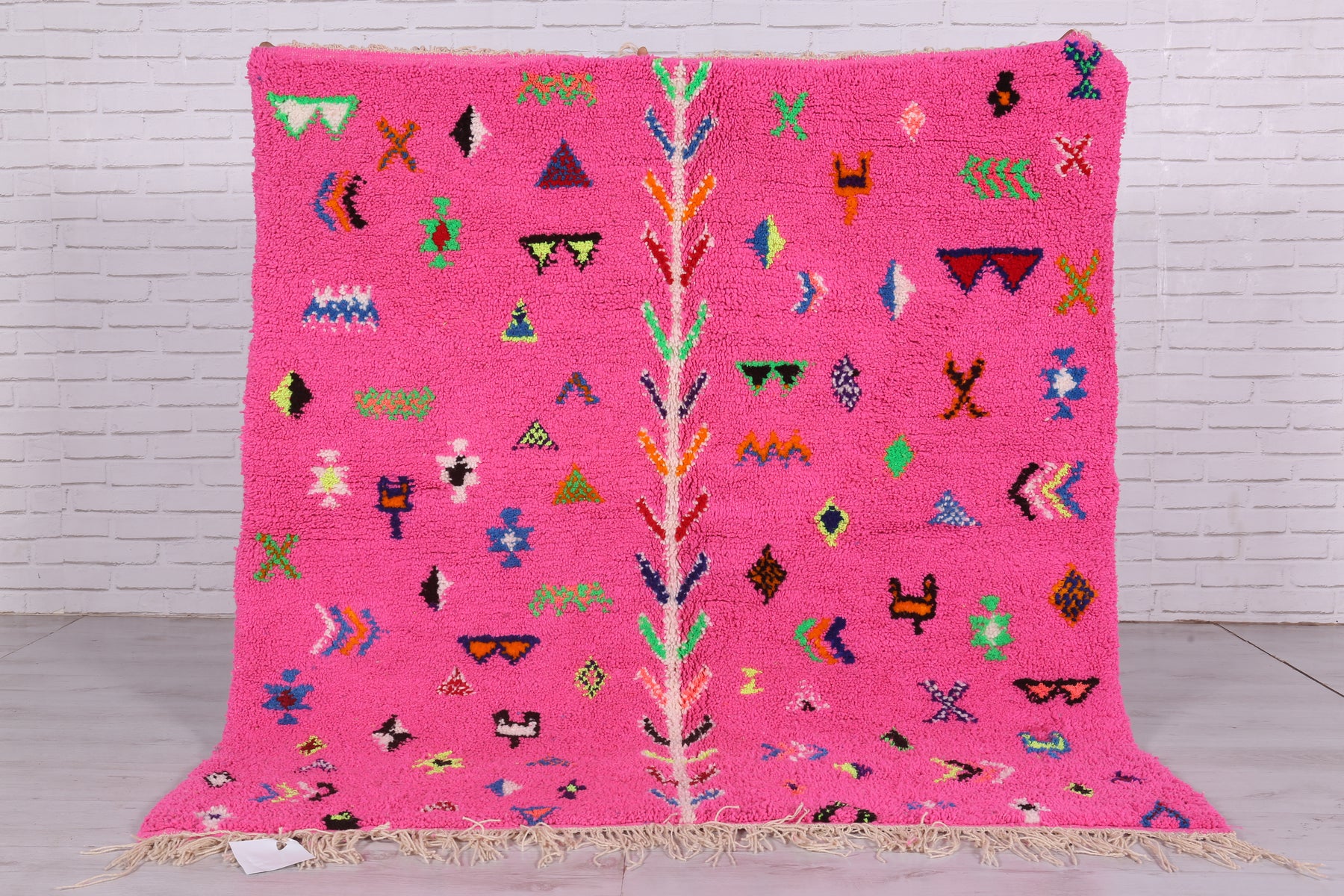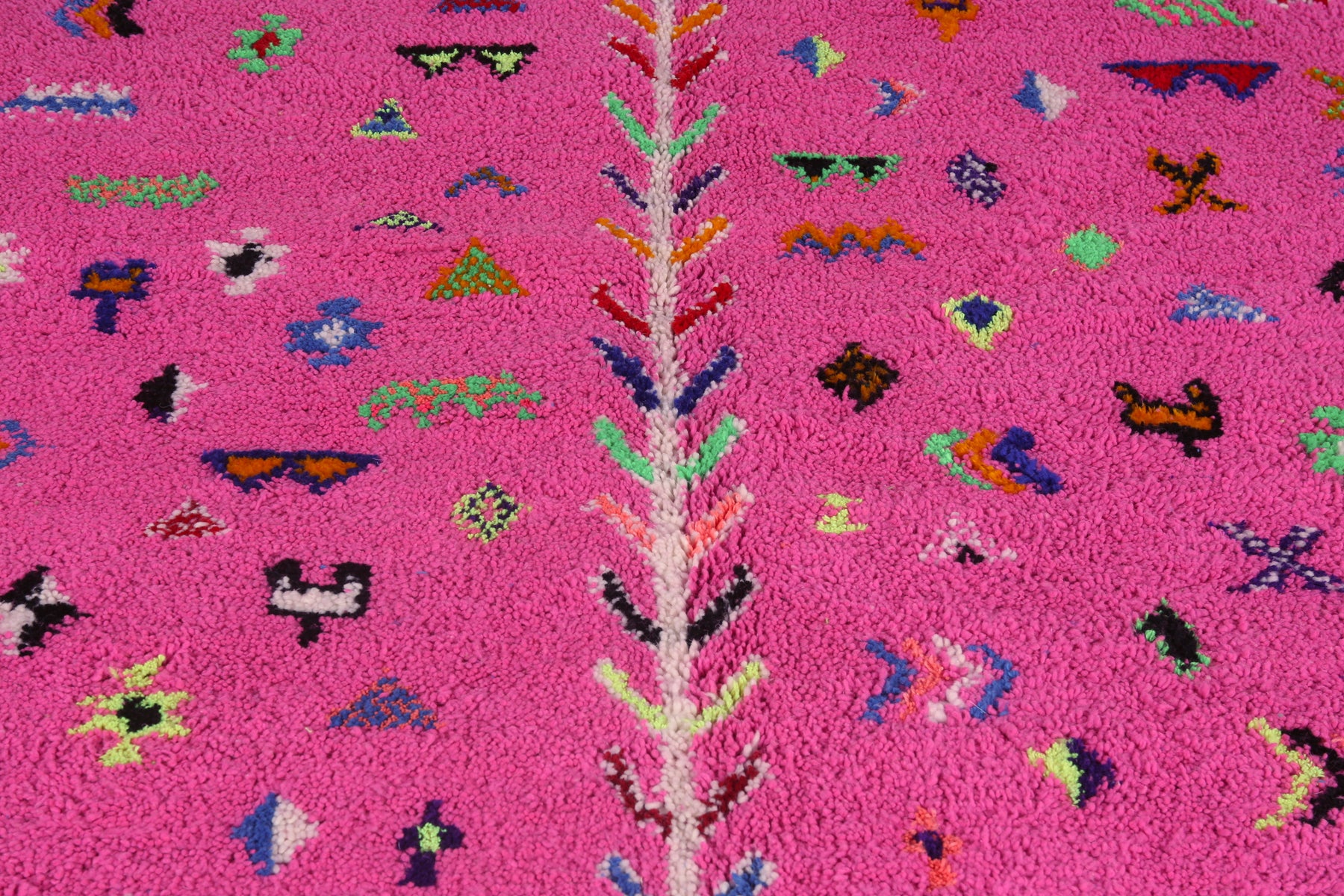 Infuse your space with vibrant energy using this handmade Moroccan rug, featuring a lively pink base adorned with colorful Berber motifs. Crafted from high-quality wool, this unique Berber-style rug brings a playful bohemian touch to any room. Perfect for eclectic interiors, kids' rooms, or as a statement piece, this rug is both eye-catching and authentically artisanal. Elevate your home with Moroccan tradition and bold design in one stunning piece.