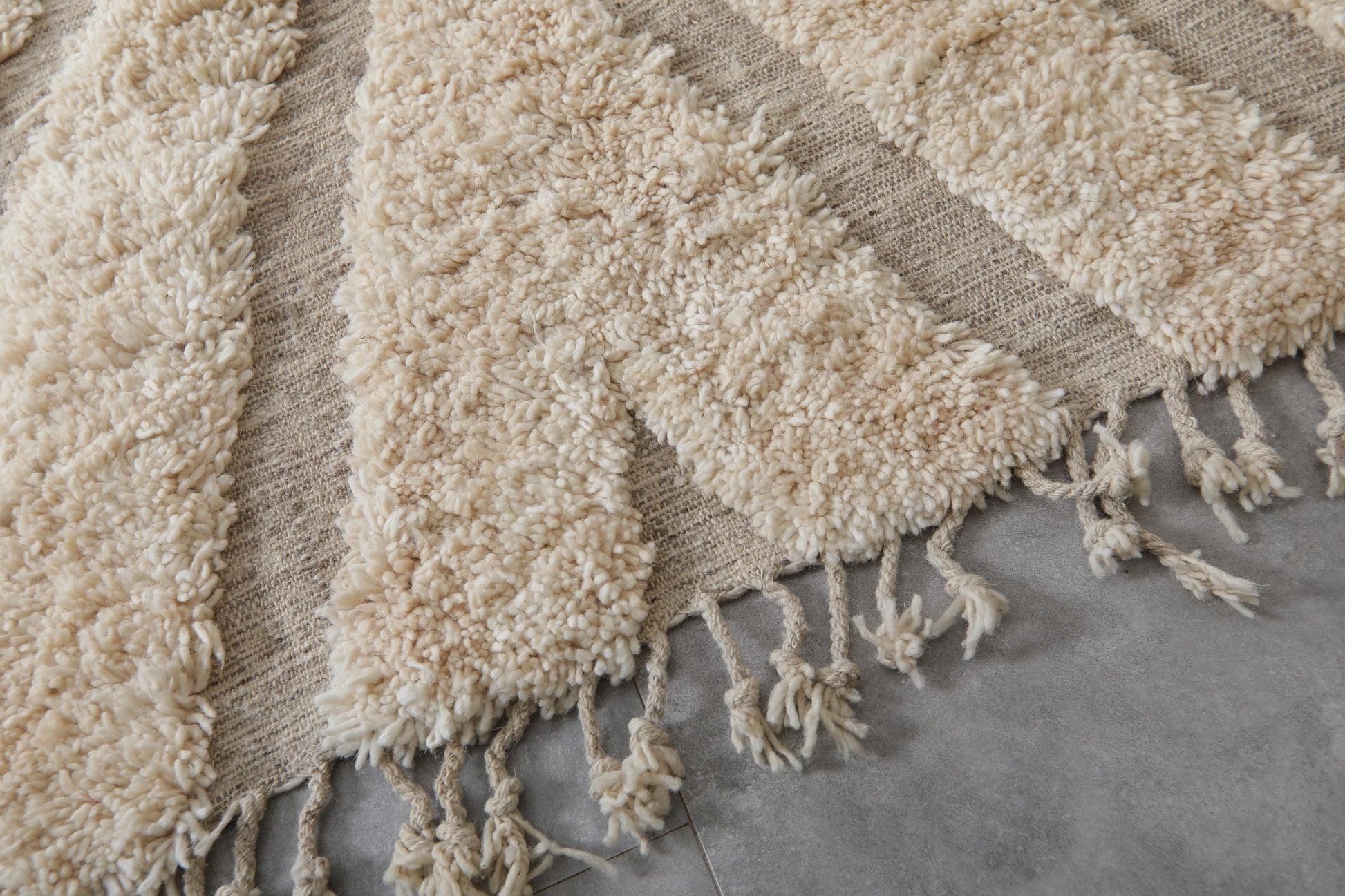 Its contemporary concentric pattern in soft ivory and beige tones creates a visual statement that is both bold and understated — making it the perfect centerpiece for modern, bohemian, or minimalist spaces. The thick, plush pile ensures ultimate comfort, while the hand-knotted fringe adds an extra touch of authenticity.