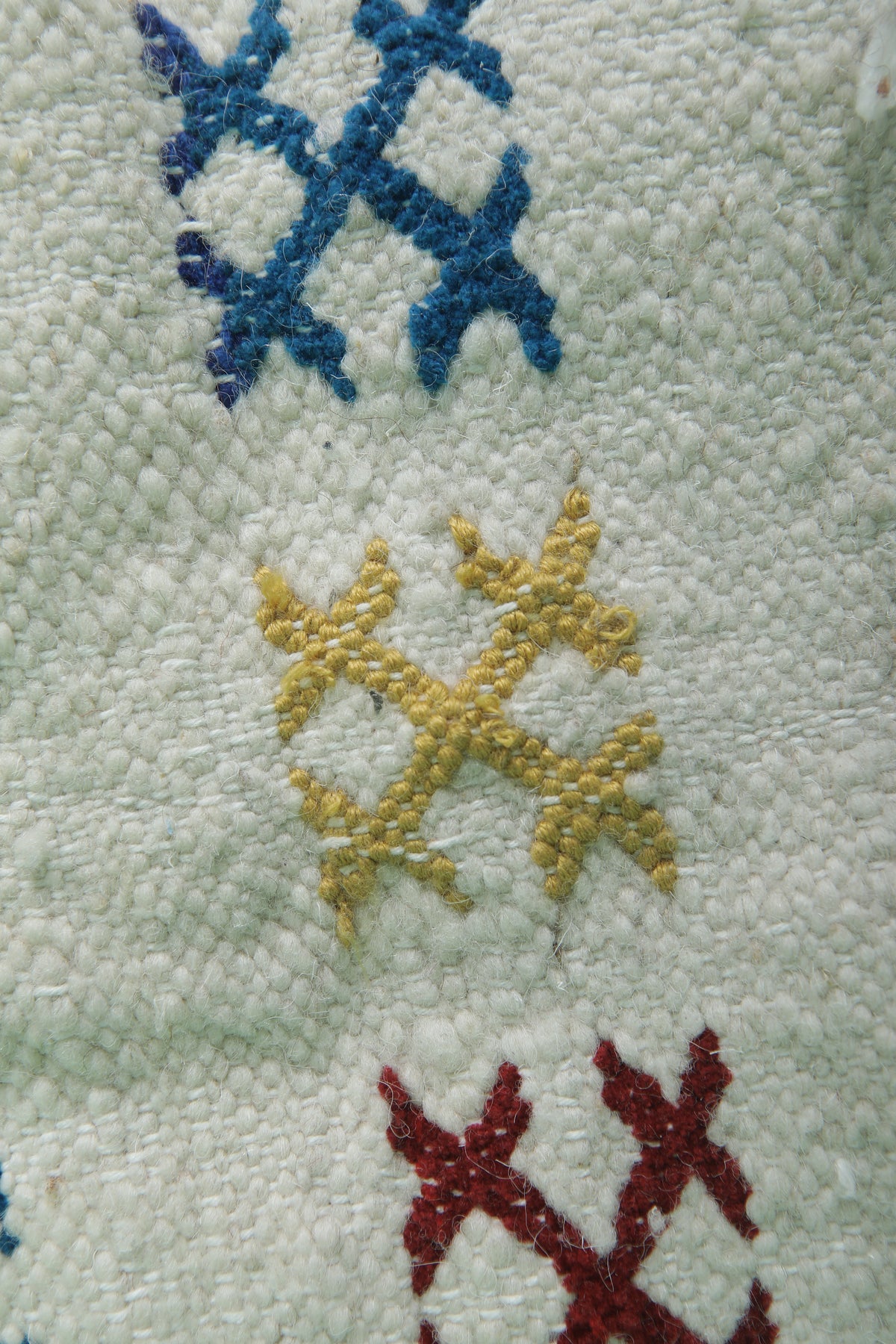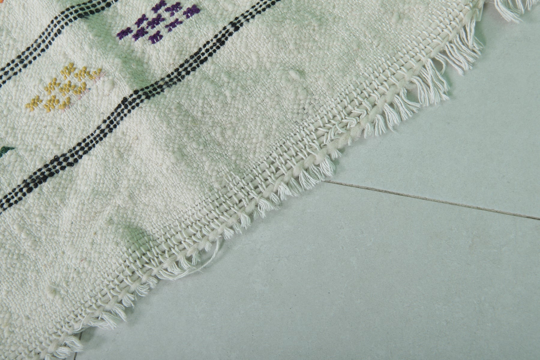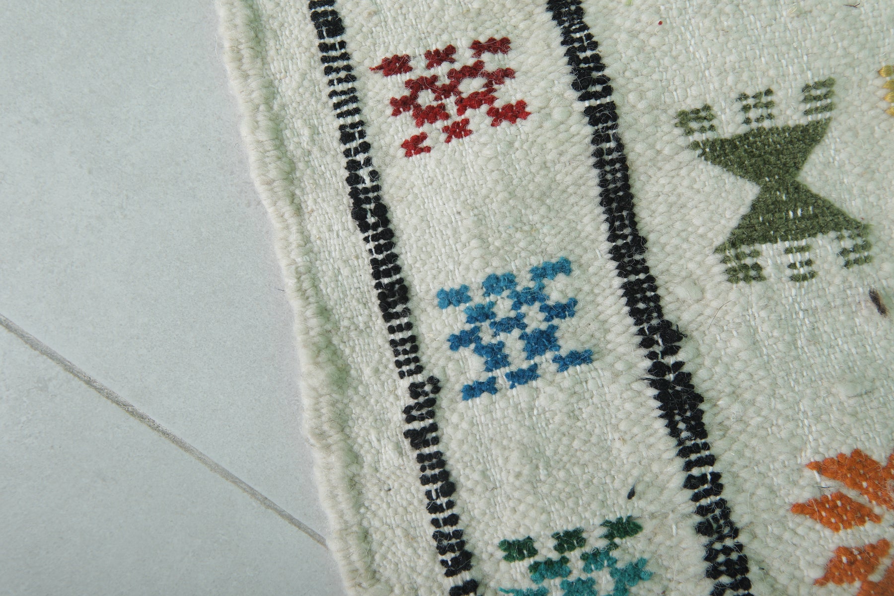 This 3 x 4.9 feet Vintage Moroccan Berber Kilim Rug showcases vibrant geometric patterns in rich multicolored hues, blending authentic Moroccan craftsmanship with timeless heritage. Handwoven from premium natural fibers, it offers durability, lightweight flexibility, and a bold aesthetic, making it ideal as a rug, wall hanging, or statement décor piece.