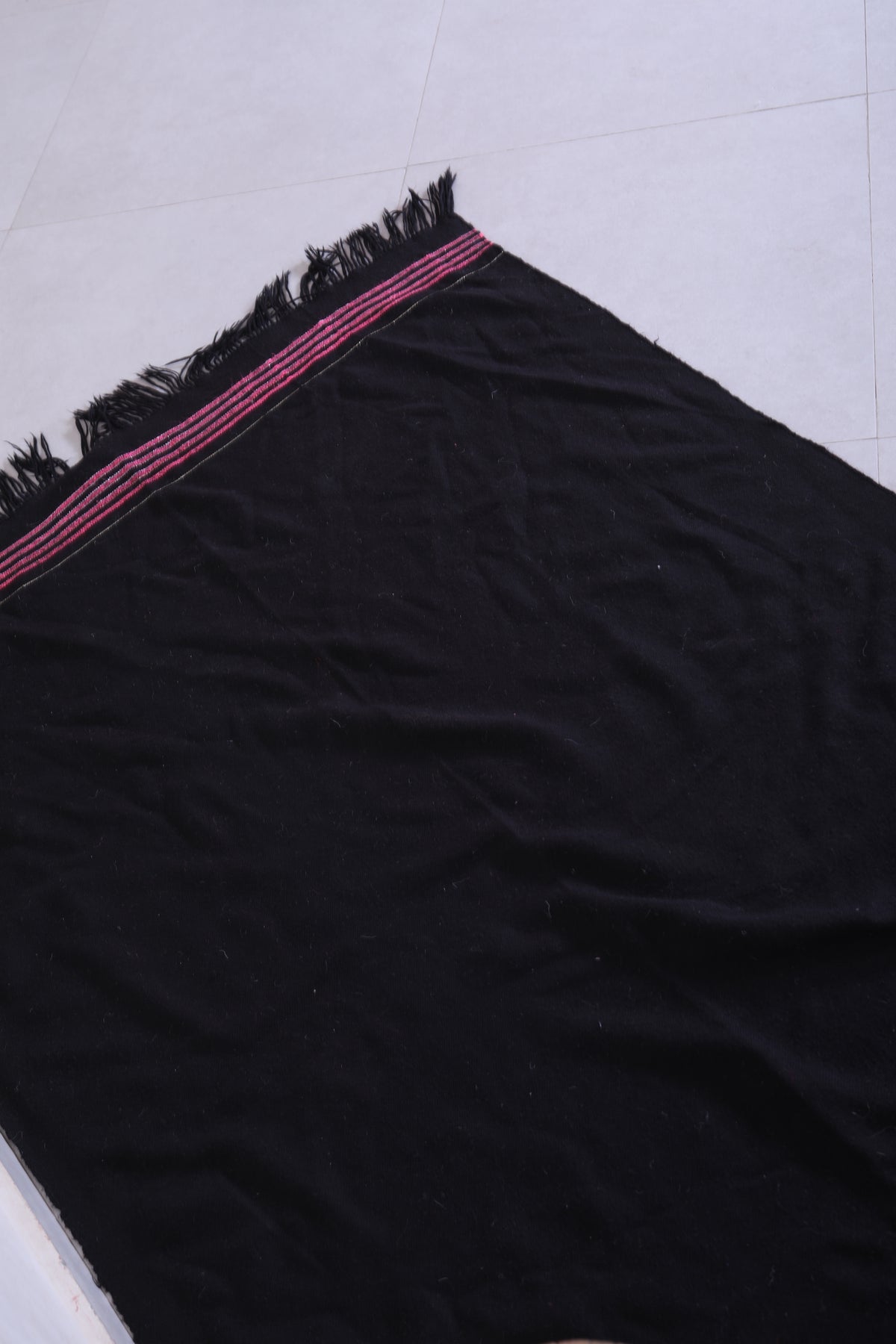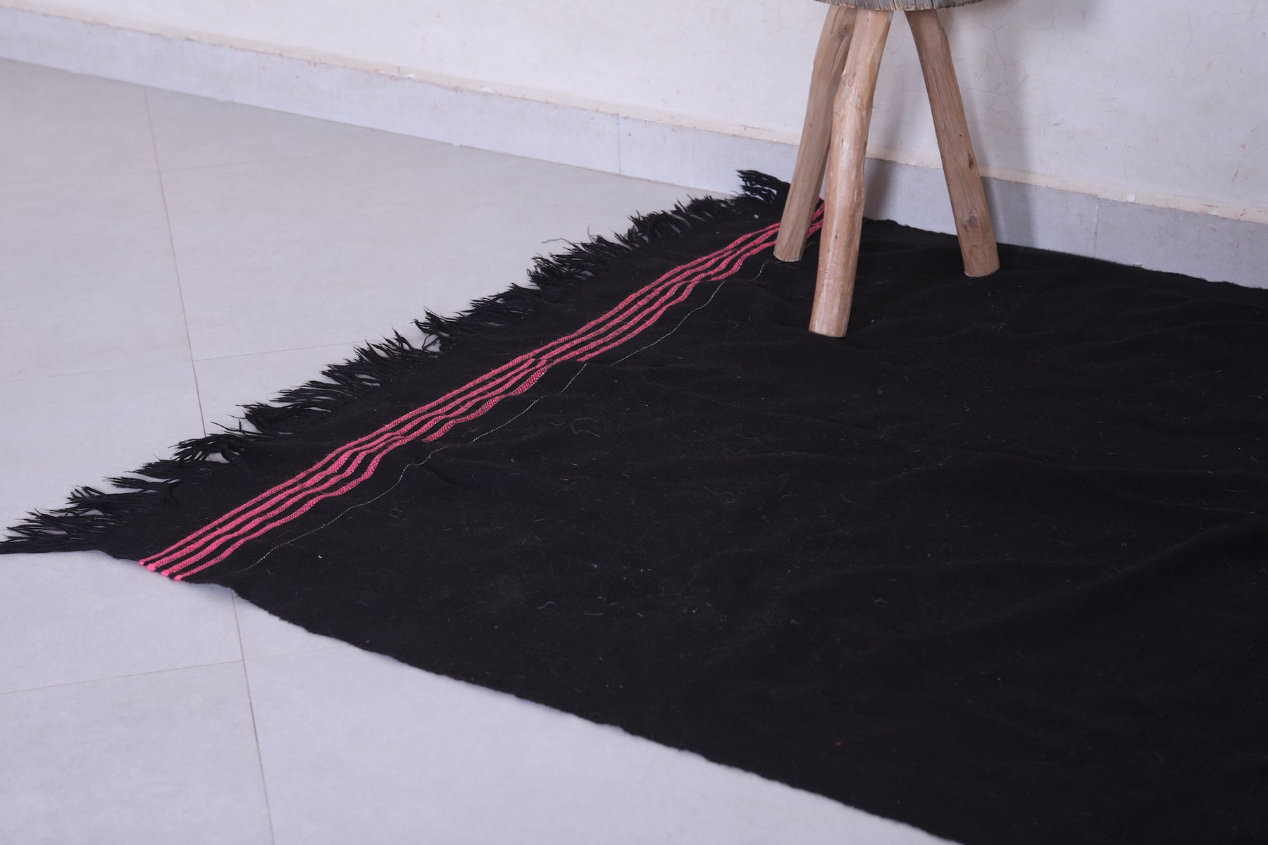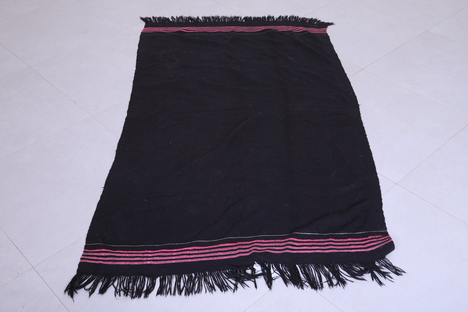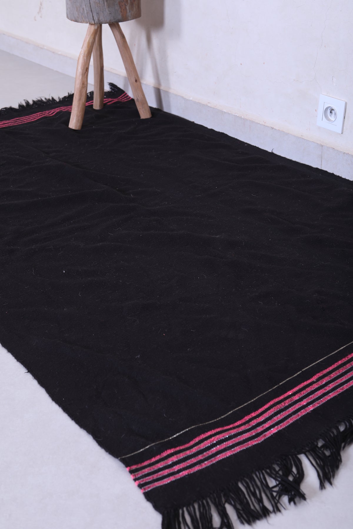 This 3.4 x 5.8 feet vintage Moroccan Kilim rug features a sleek black design with subtle stripe accents, blending minimalist elegance with traditional craftsmanship. Handwoven from premium wool, it offers exceptional durability and softness, making it ideal for bedrooms, entryways, or cozy living areas.