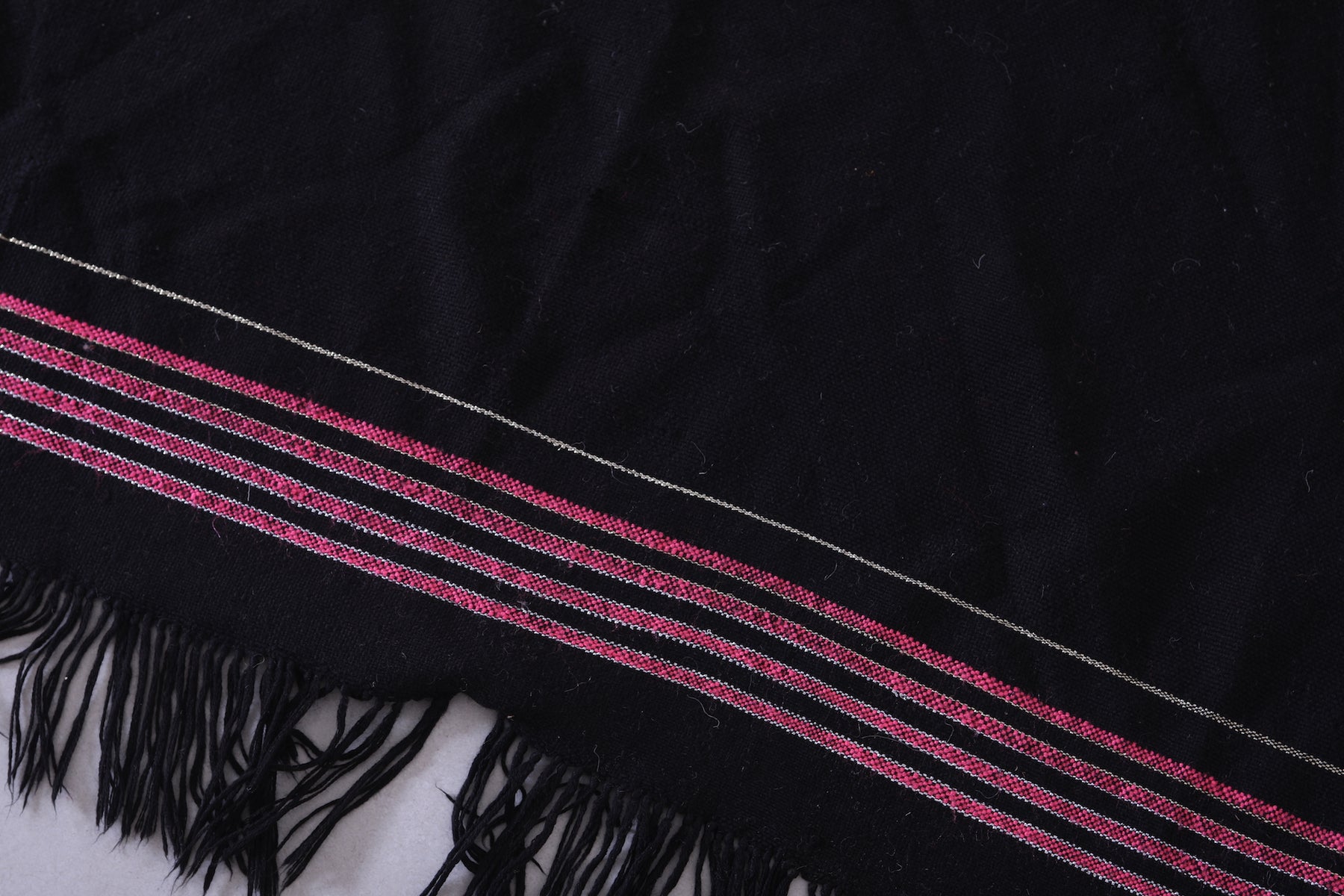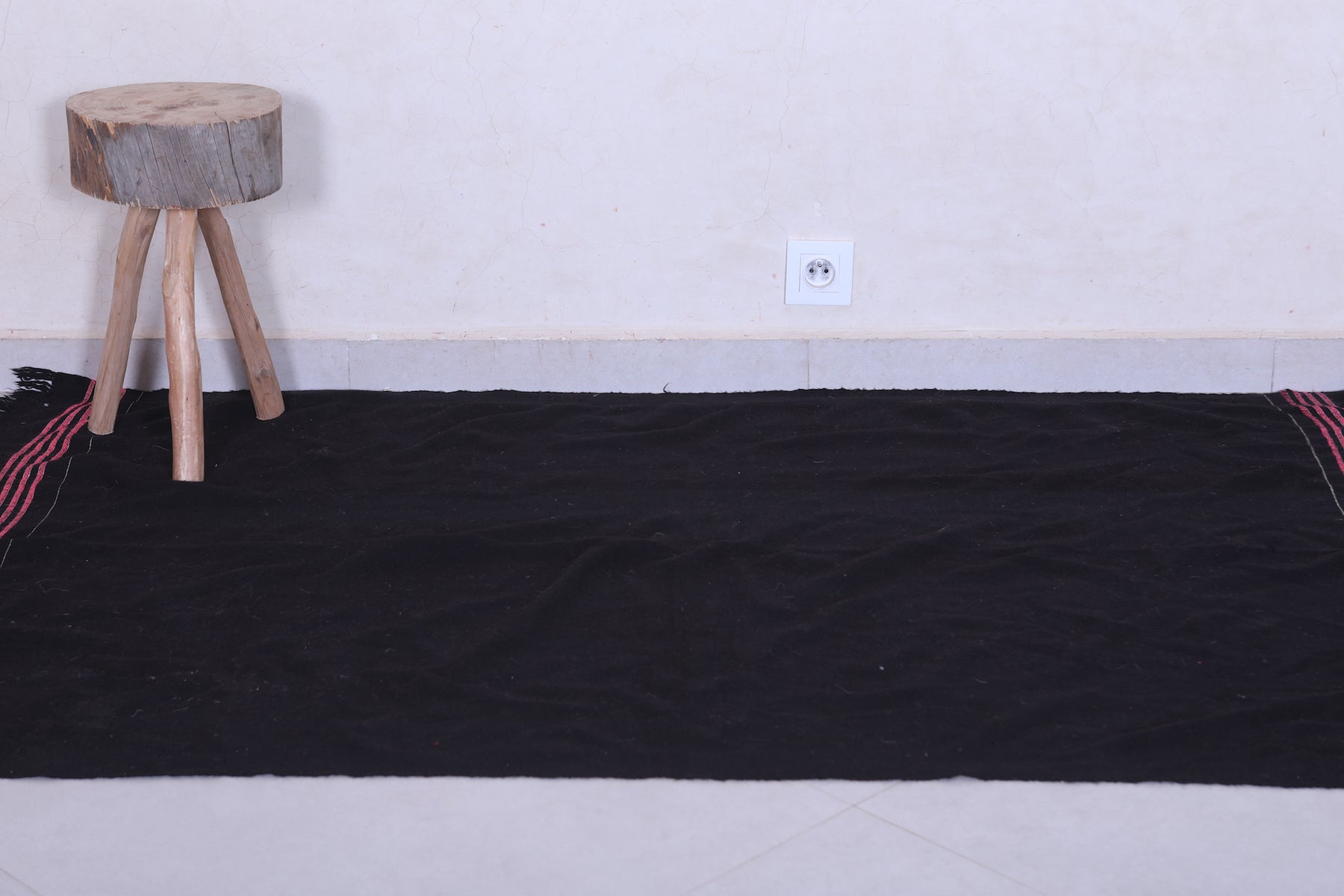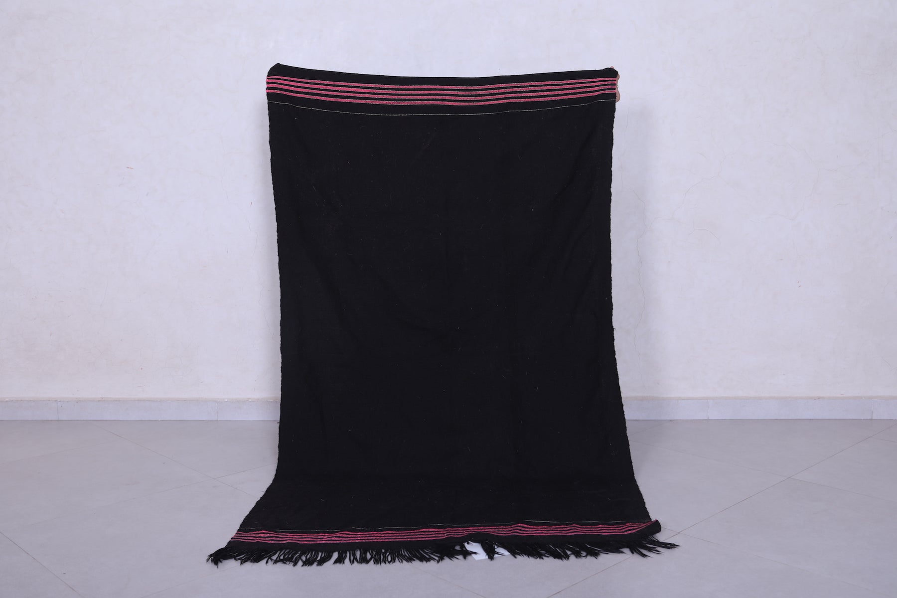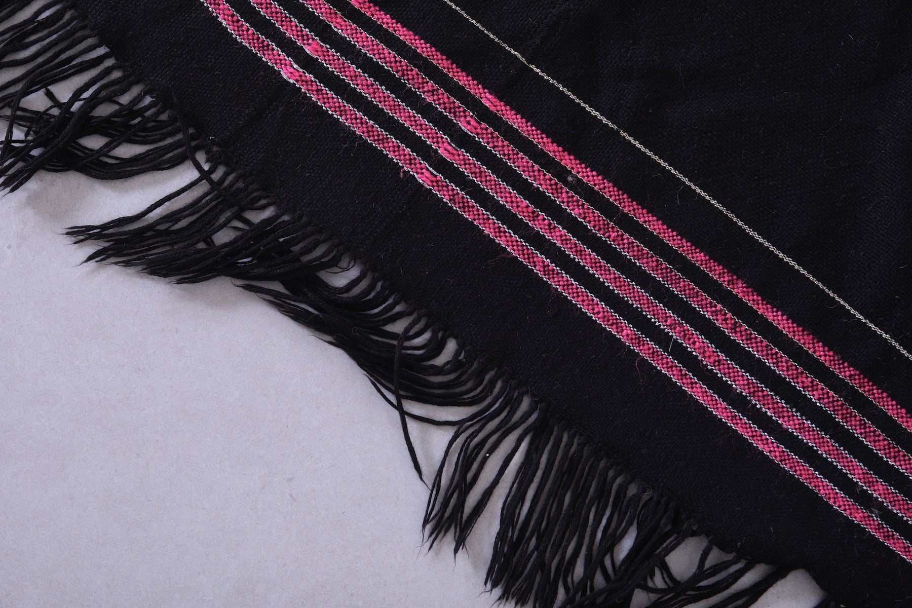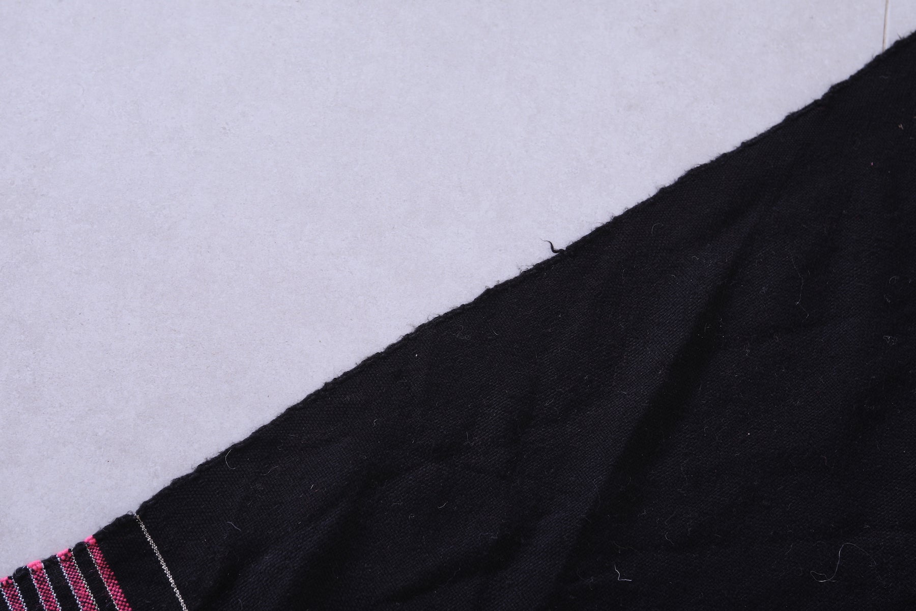 This 3.4 x 5.8 feet vintage Moroccan Kilim rug features a sleek black design with subtle stripe accents, blending minimalist elegance with traditional craftsmanship. Handwoven from premium wool, it offers exceptional durability and softness, making it ideal for bedrooms, entryways, or cozy living areas.