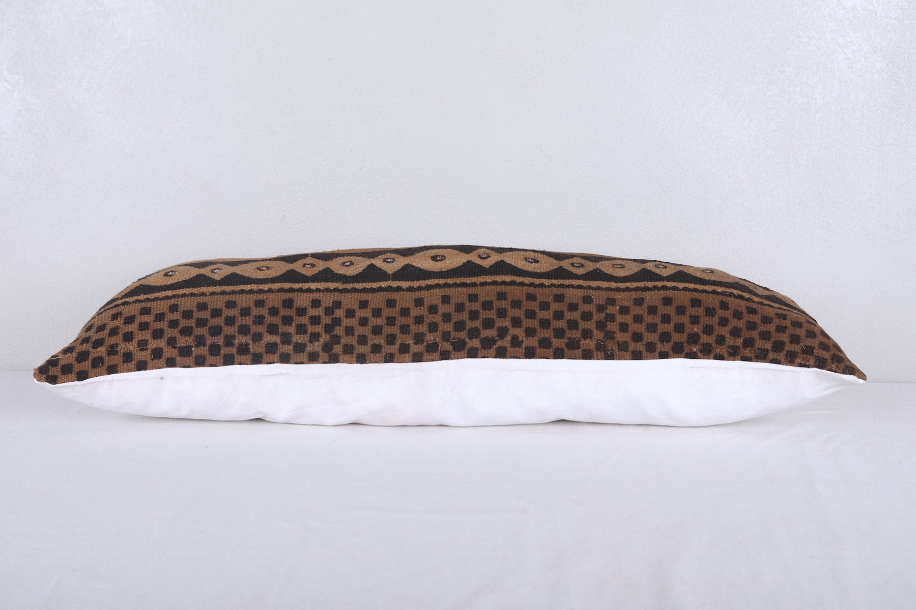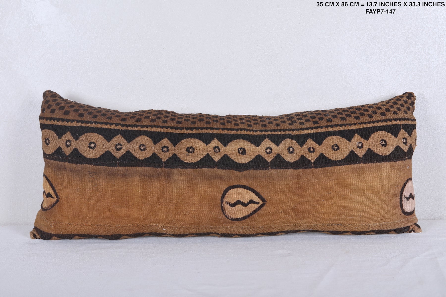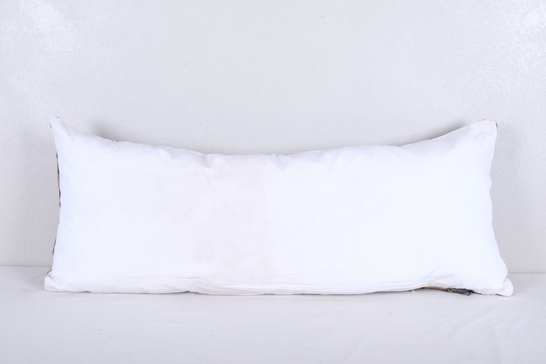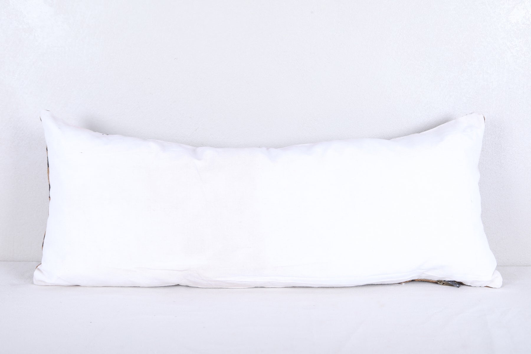 This vintage moroccan kilim pillow measures 13.7 inches by 33.8 inches and is handwoven with wool and cotton by skilled craftsmen. Its intricate patterns emphasize the beauty of traditional tannery craftsmanship, providing texture and unique character to your space. Enjoy the timeless artistry of moroccan kilim for your home décor.