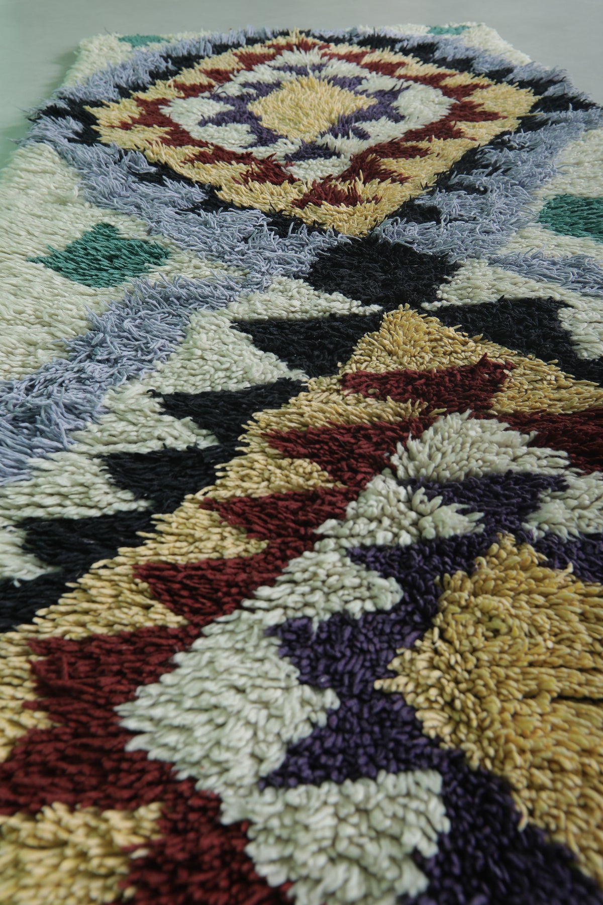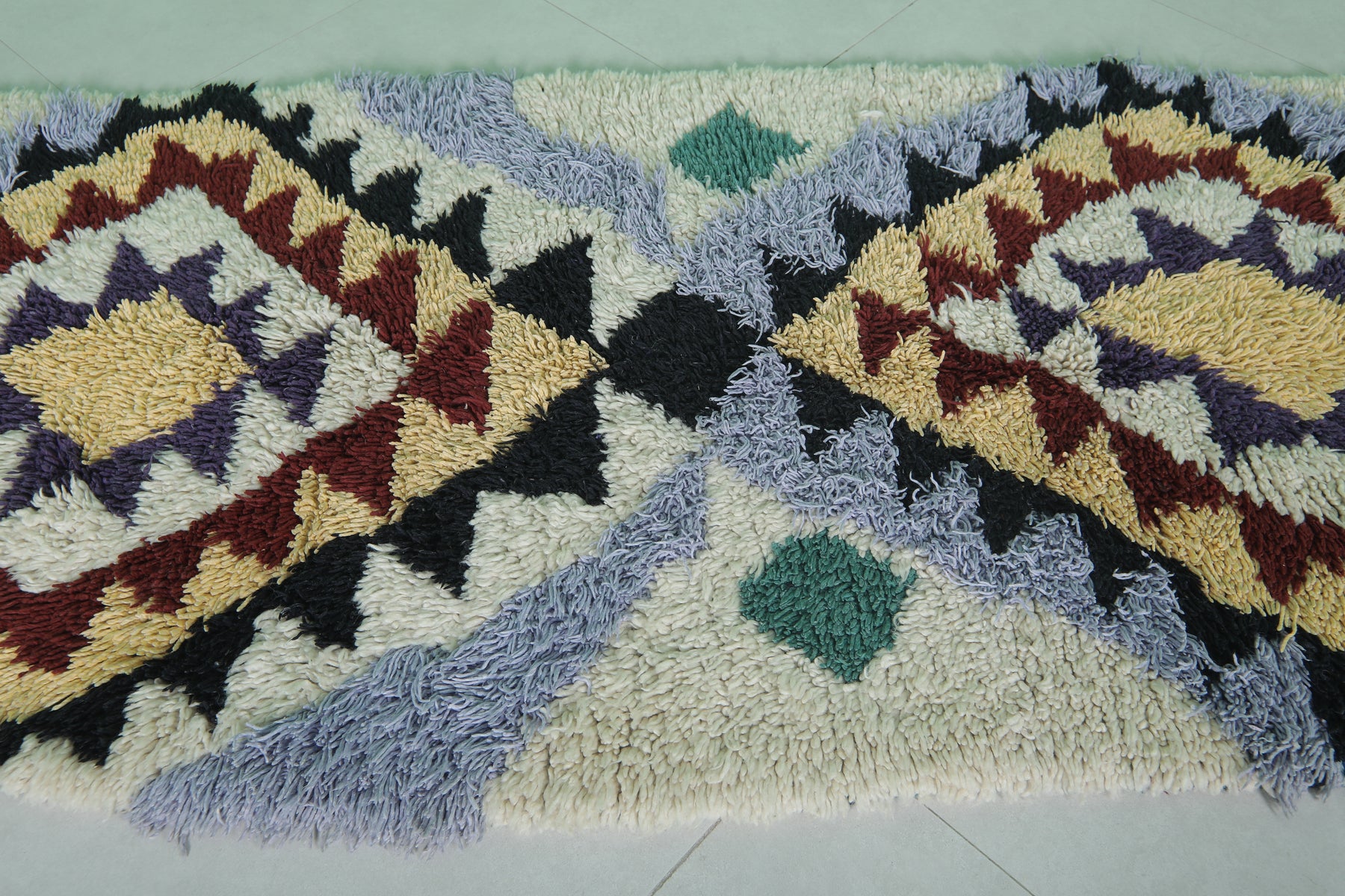 Elevate your hallway or narrow spaces with this exquisite Vintage Moroccan Runner Rug, featuring intricate geometric diamond patterns in vibrant tones of mustard, burgundy, lilac, and green. Measuring 3.4 x 8 ft, this handwoven masterpiece blends warmth, durability, and timeless beauty.