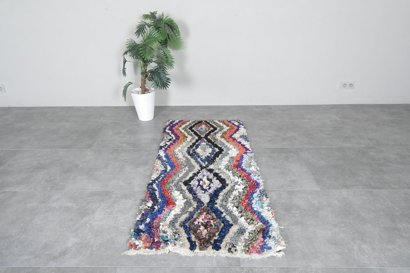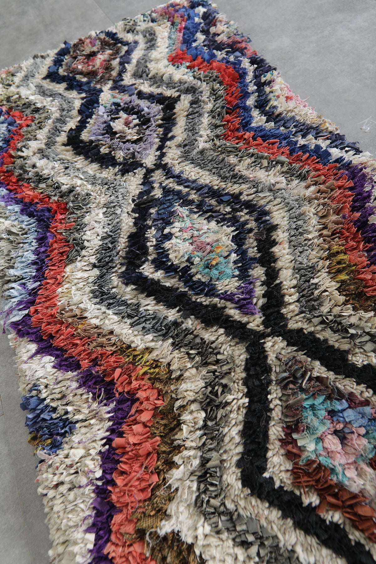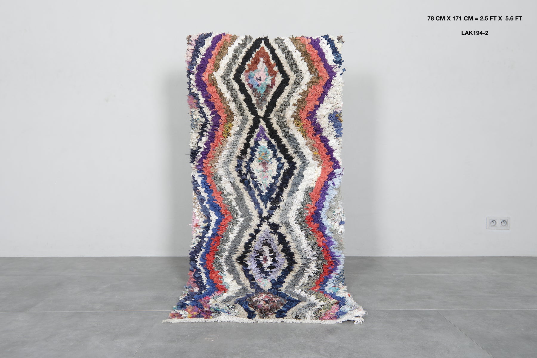 This authentic Boucherouite rug measures 2.5 x 5.6 feet and is handcrafted in Morocco. Its vibrant colors and unique tribal design make for a beautiful addition to any home. Made with traditional techniques, this vintage rug is perfect for adding warmth and character to your living space.
