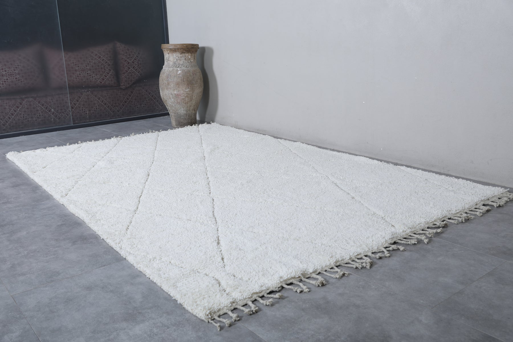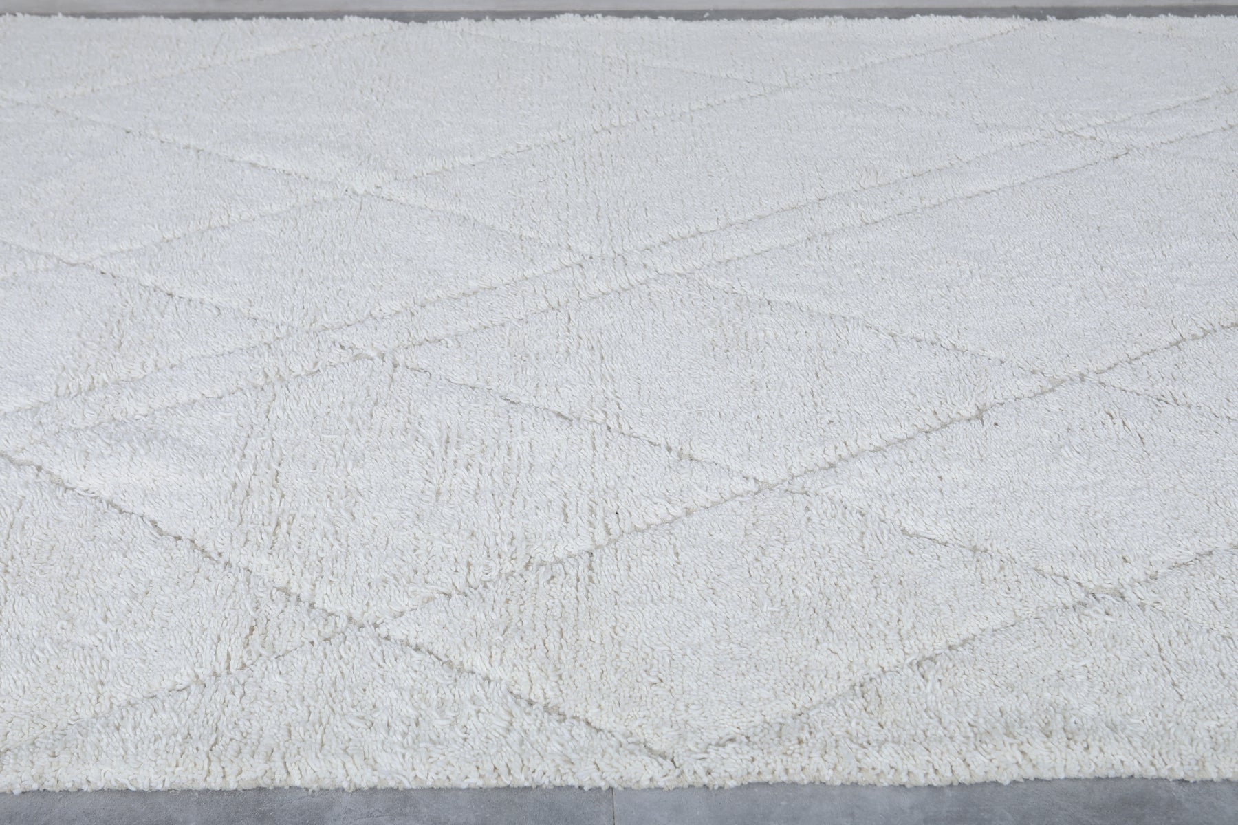 Bring warmth, texture, and timeless elegance to any room in your home with this white Beni Ourain rug, handwoven by Berber artisans of the Atlas Mountains in Morocco. Woven from 100% natural wool, this sumptuous rug presents a creamy white surface with soft, subtle diamond motifs — a classic hallmark of traditional Beni Ourain design.