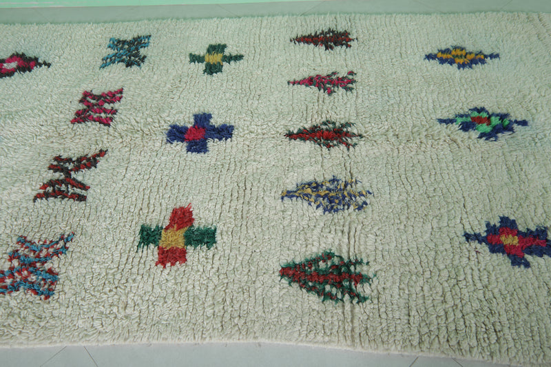 Elevate your space with the charm of this handmade Azilal Moroccan rug, measuring 4.4 x 8.1 feet. The rug’s soft beige background is adorned with vibrant, symbolic motifs in a variety of colors, showcasing the artistic expression of Azilal craftsmanship. This versatile piece fits seamlessly into modern, bohemian, or eclectic interiors, adding a touch of authenticity and warmth. Its intricate designs and artisanal quality make it a timeless décor addition for any room in your home.