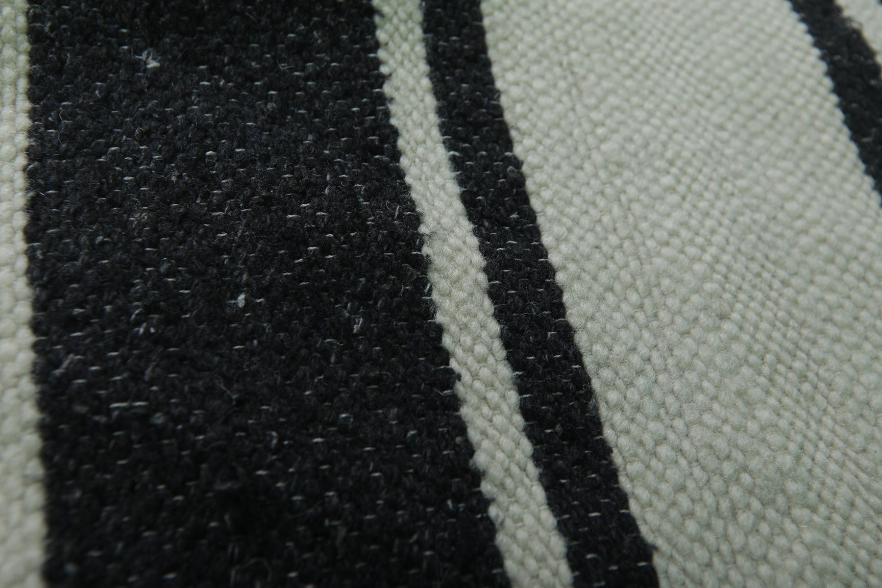 This 5.5 x 11 feet Beige and Black Runner Kilim Rug is a handwoven Moroccan masterpiece, blending natural beige tones with bold black stripes for a striking yet timeless aesthetic. Perfect for hallways, elongated spaces, or layering in a modern or bohemian interior, this kilim rug adds warmth and texture to any room.