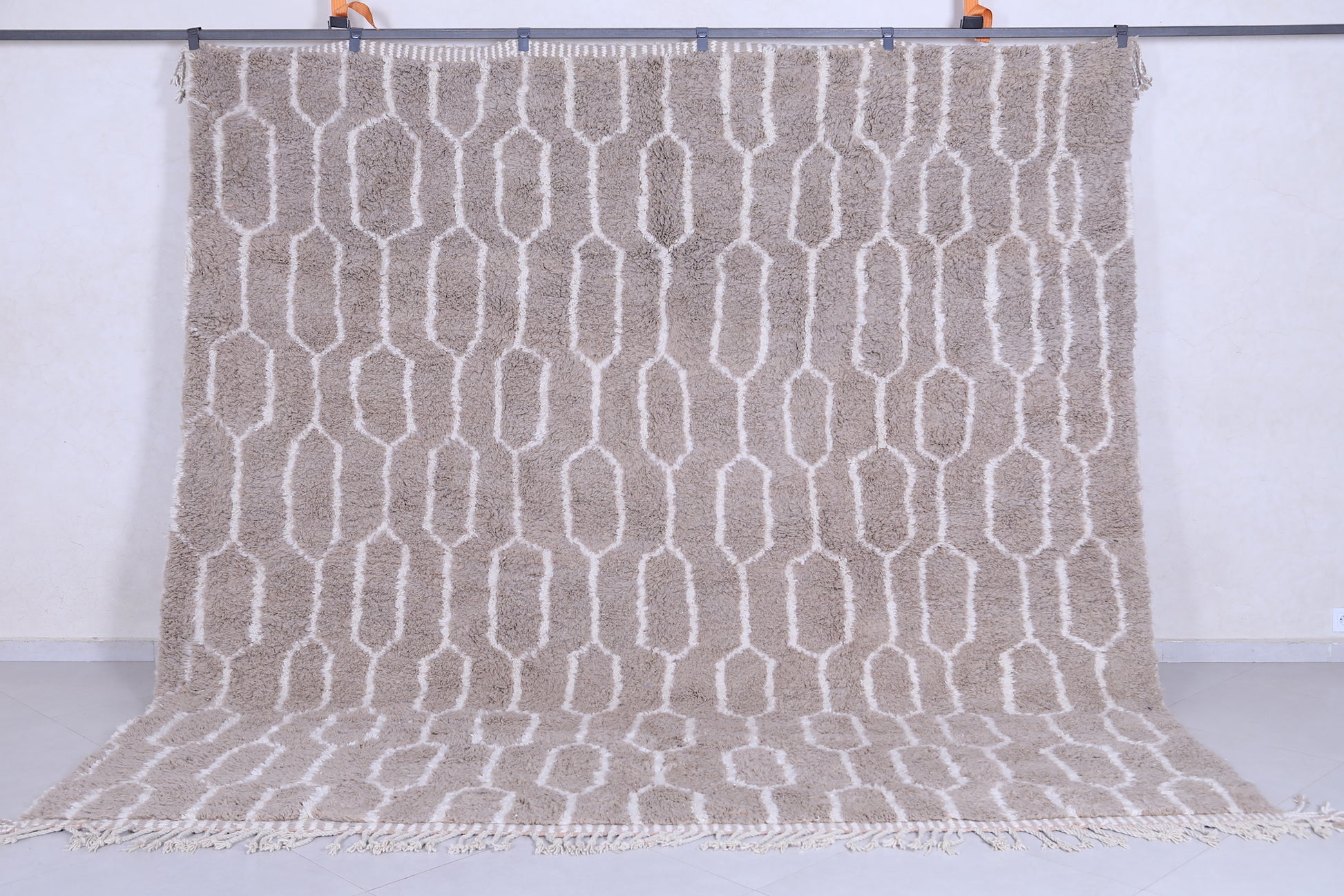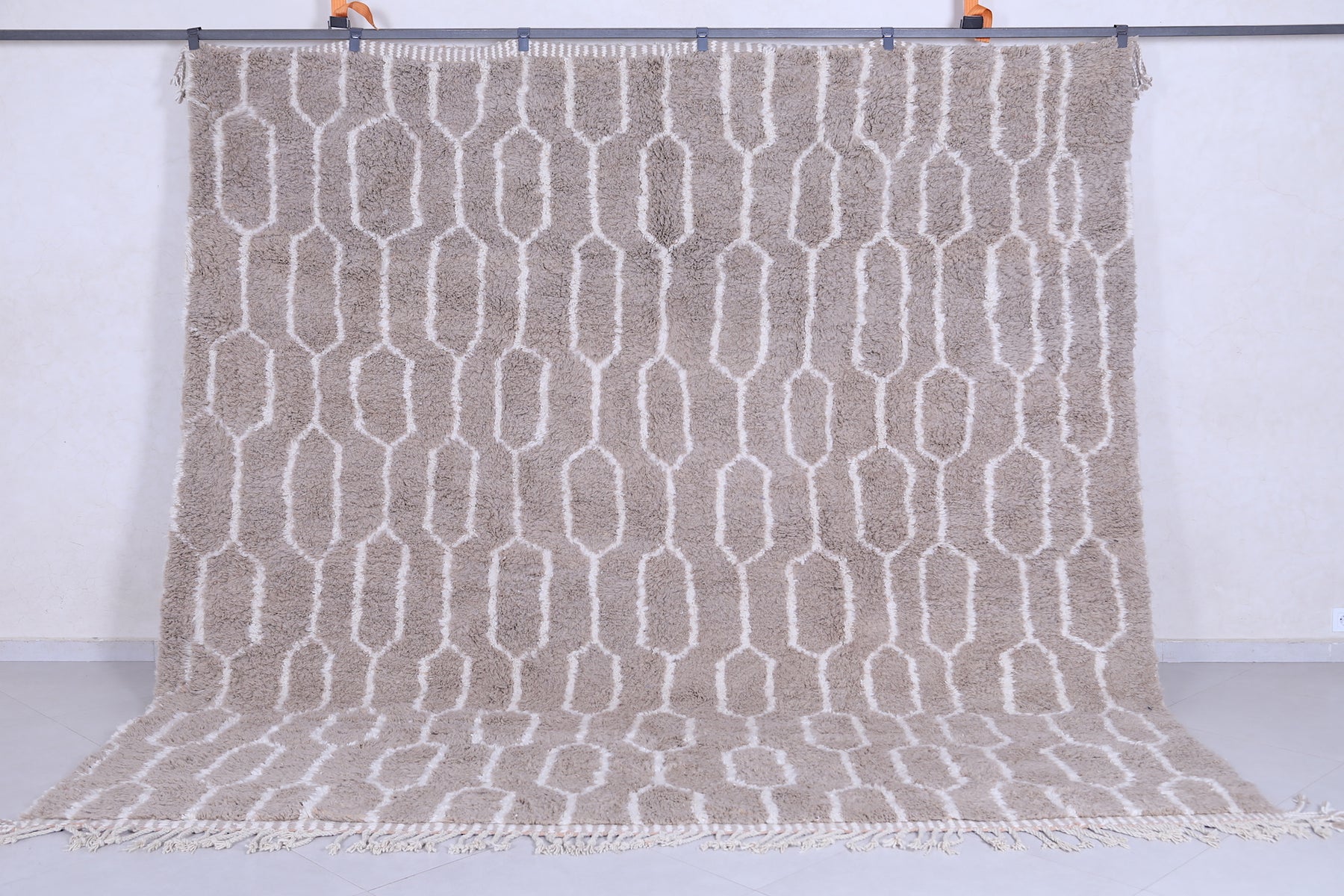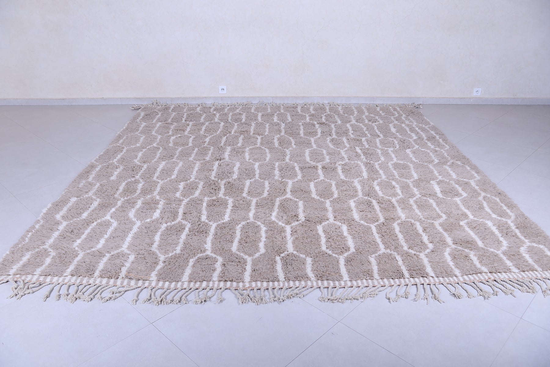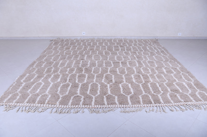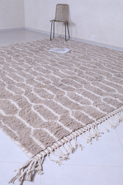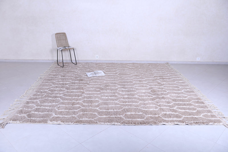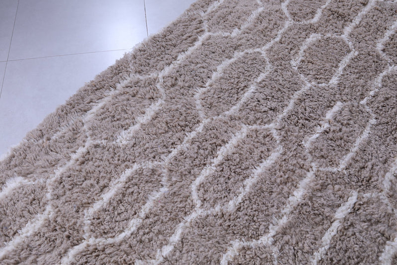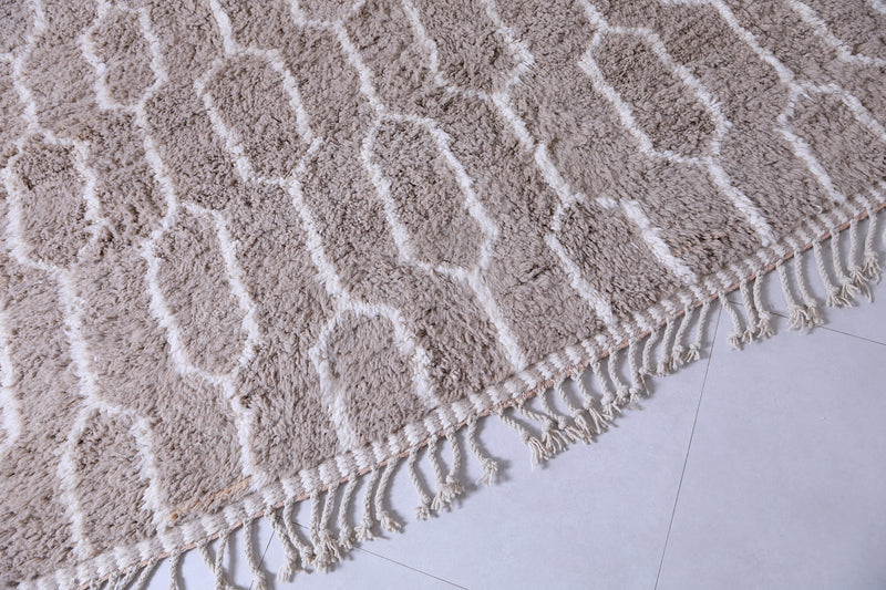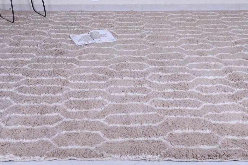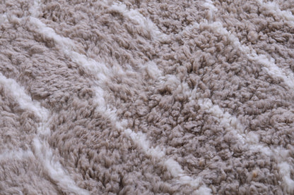 Elevate your interior with this handmade geometric Moroccan rug featuring a soft beige base and intricate white patterns. Expertly crafted from premium wool, this Berber-inspired rug offers a perfect blend of tradition and modern design. Ideal for neutral, boho, or minimalist décor, its plush texture and durable quality make it a standout piece for living rooms, bedrooms, or offices. Add timeless Moroccan charm and warmth to your space with this one-of-a-kind artisan rug.
