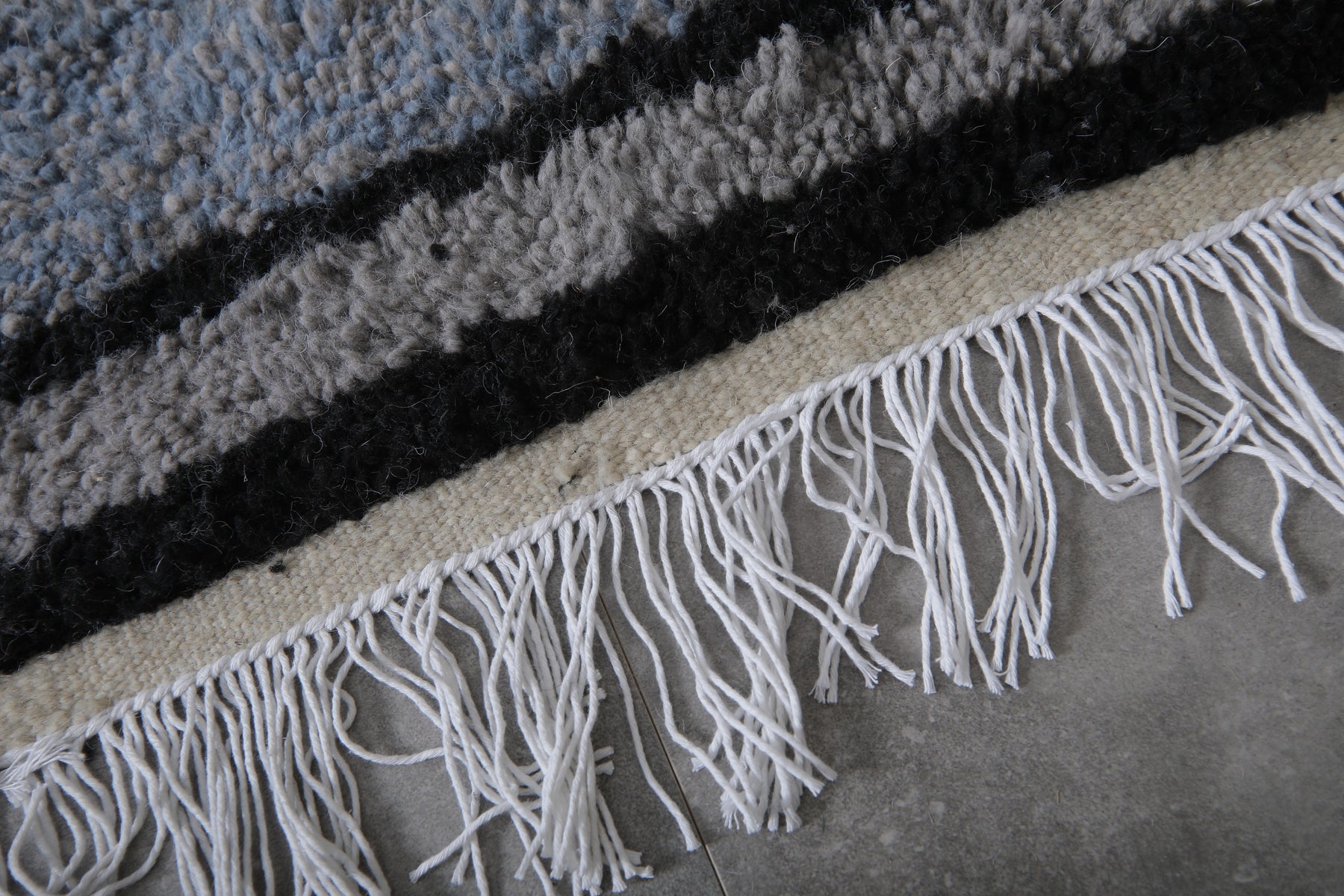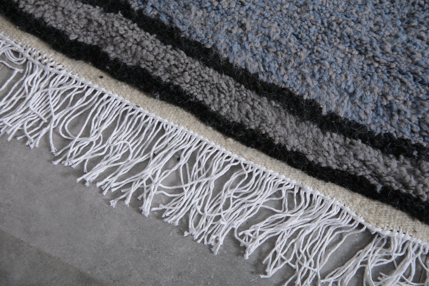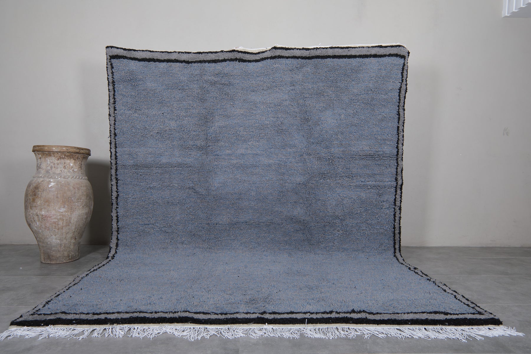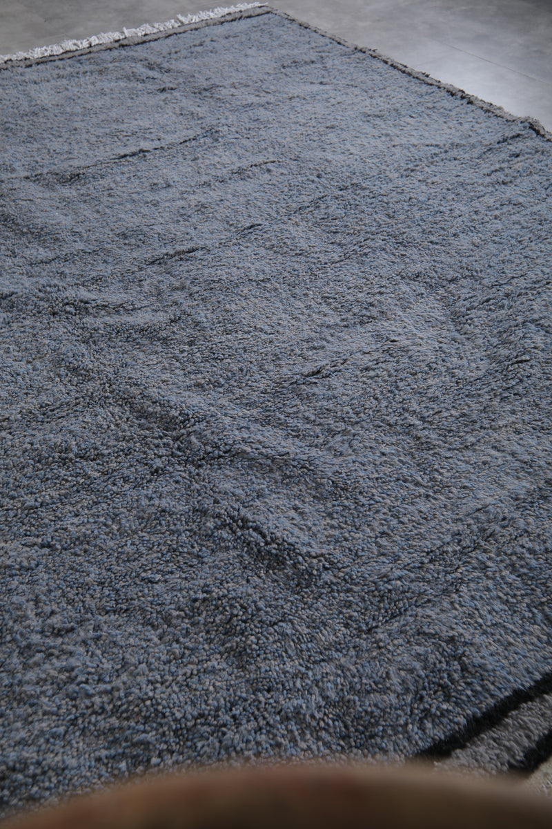 This handcrafted Moroccan wool rug features a stunning slate blue hue with bold black borders and delicate white fringes, creating a timeless and contemporary design. Perfect for modern interiors, this plush rug brings warmth, texture, and a sophisticated pop of color to any living room, bedroom, or office space. Ethically made by skilled artisans, this one-of-a-kind piece blends traditional craftsmanship with minimalist style, making it a standout accent for your home décor. Ideal for those seeking a high-quality, durable, and visually striking Moroccan rug.