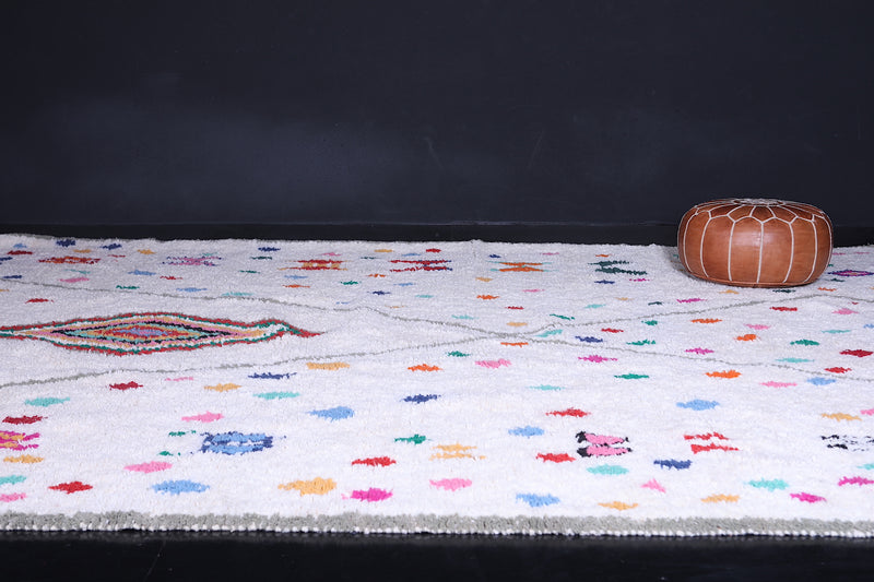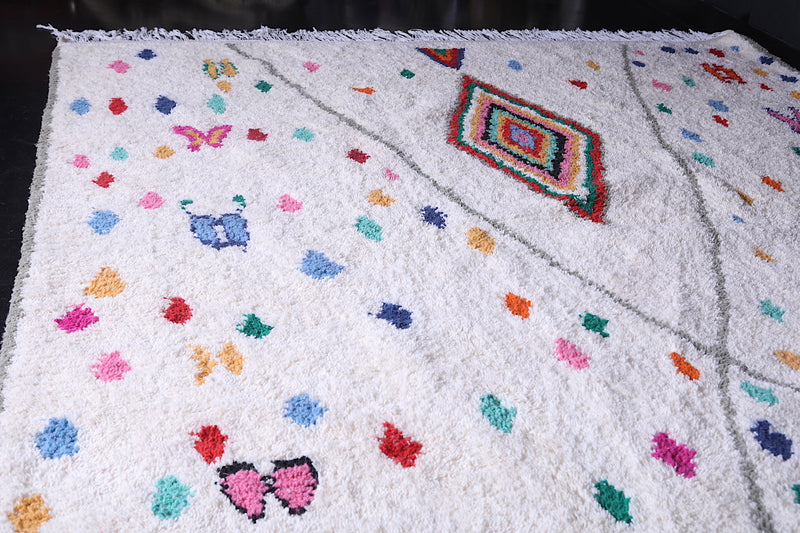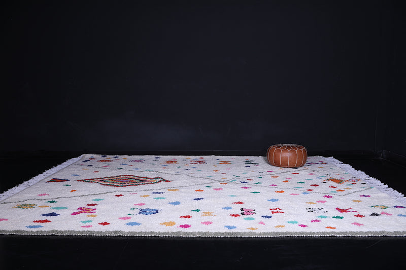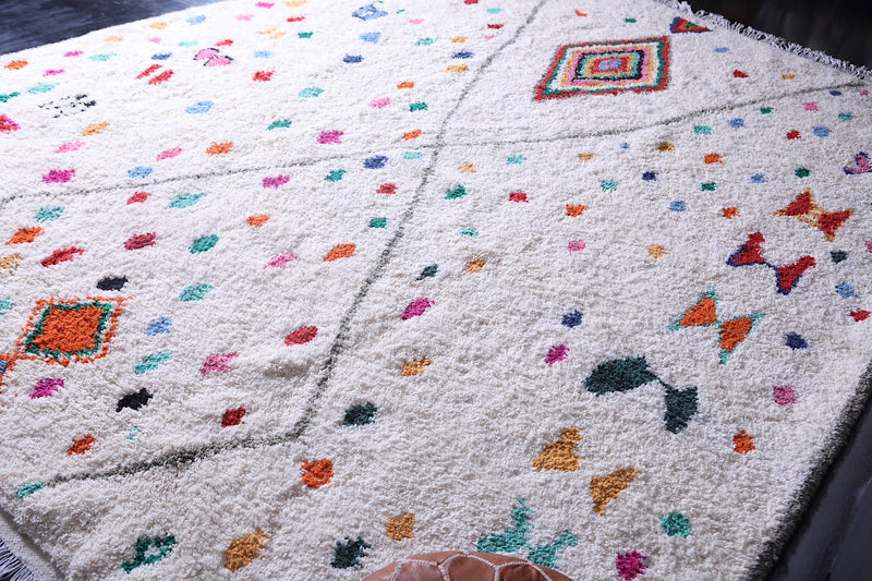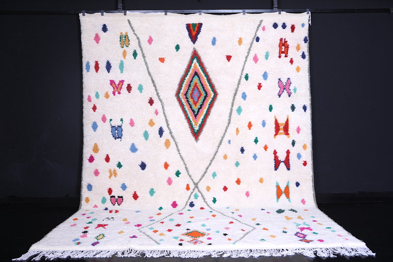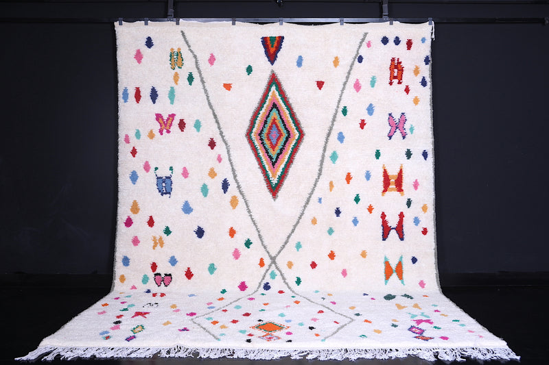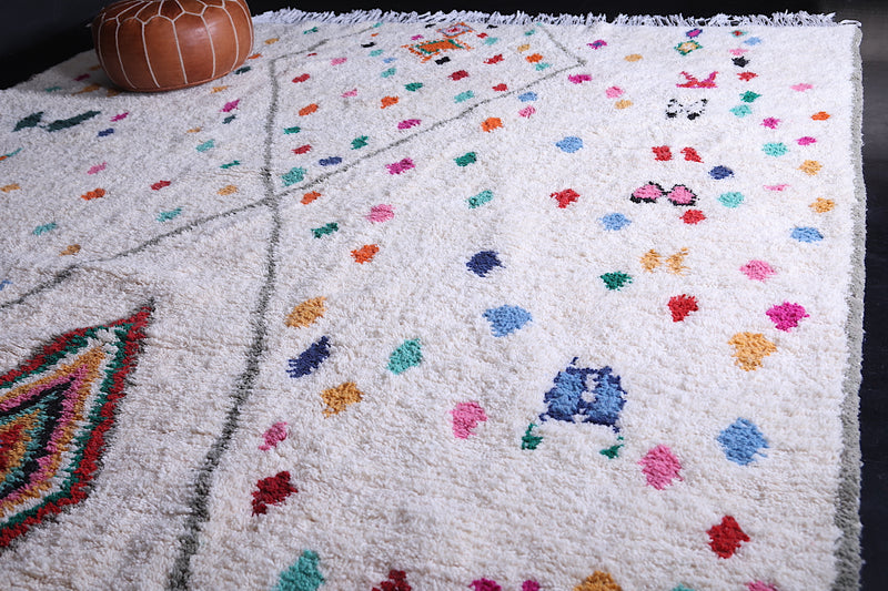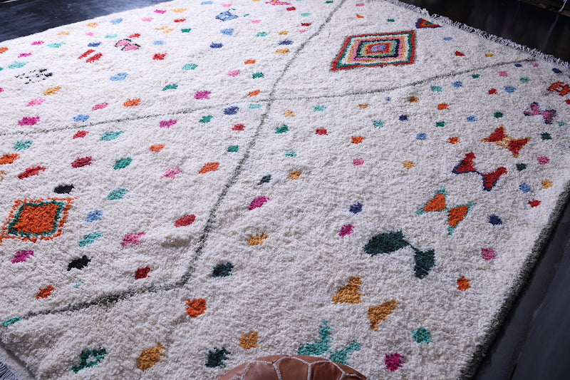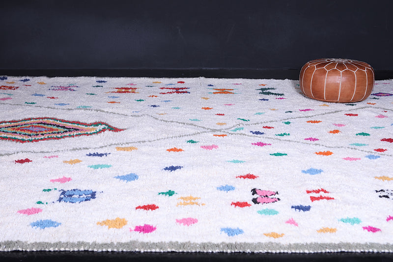 Celebrate tradition and craftsmanship with this vibrant Beni Ourain Moroccan Rug, handwoven by skilled artisans using premium-quality wool. This custom Berber rug features a striking array of colorful geometric and tribal motifs on a neutral background, creating a unique centerpiece for any space.