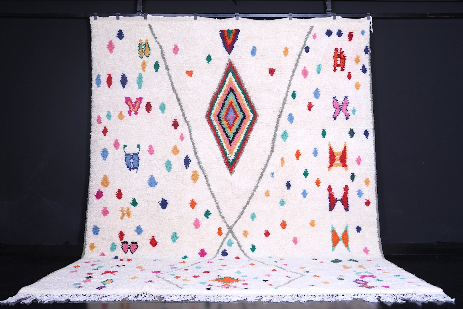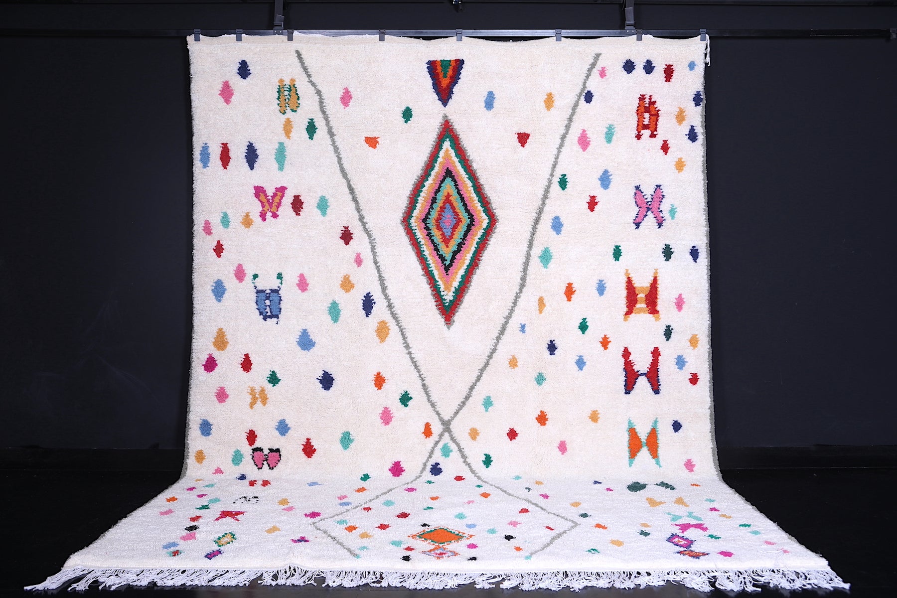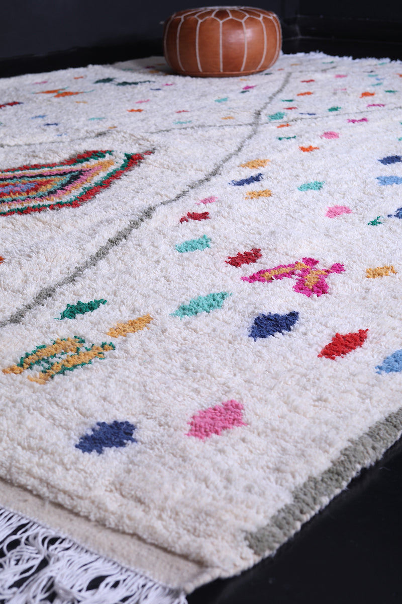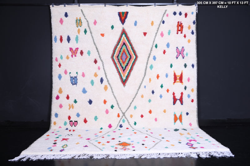 Celebrate tradition and craftsmanship with this vibrant Beni Ourain Moroccan Rug, handwoven by skilled artisans using premium-quality wool. This custom Berber rug features a striking array of colorful geometric and tribal motifs on a neutral background, creating a unique centerpiece for any space.