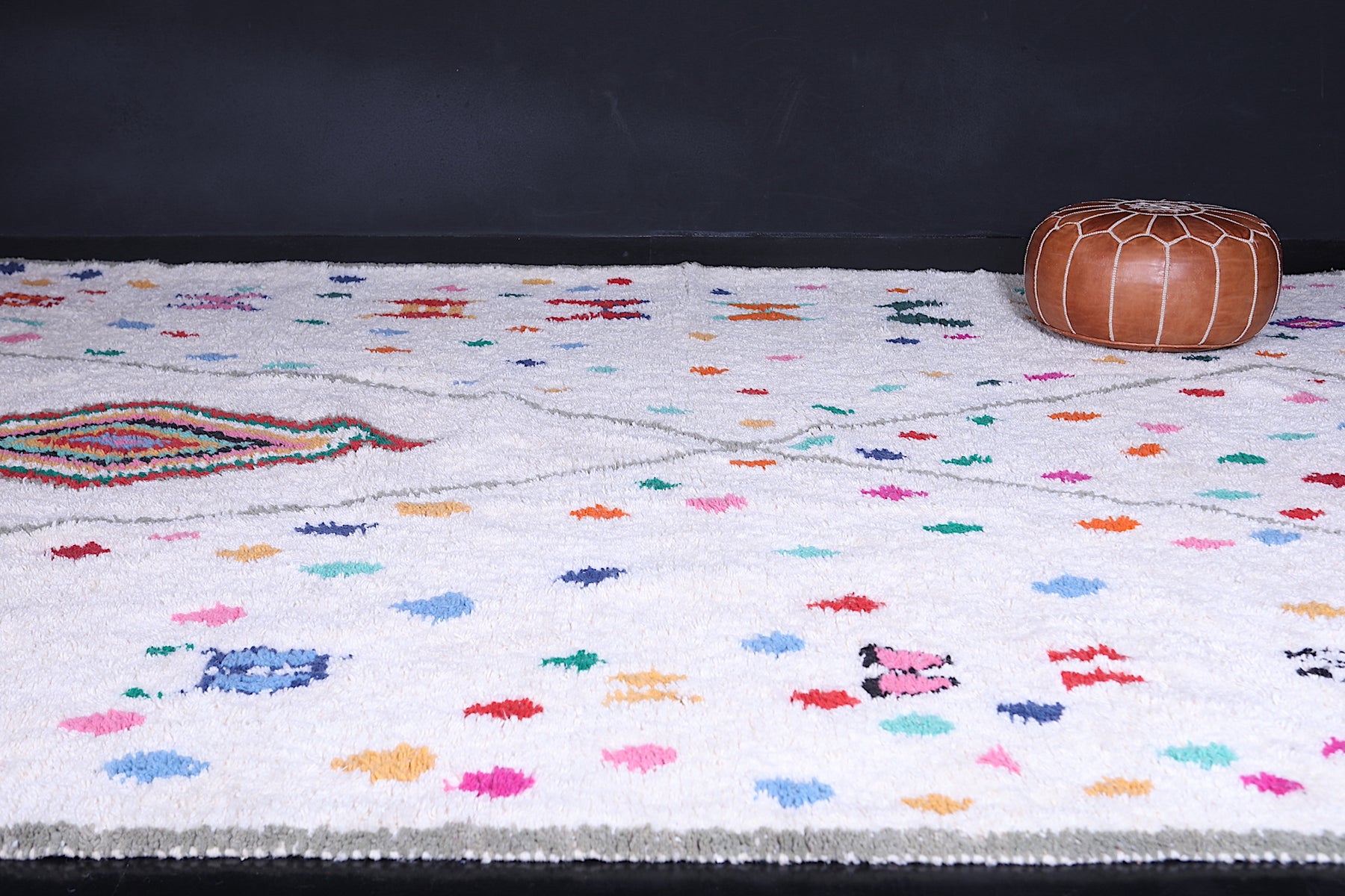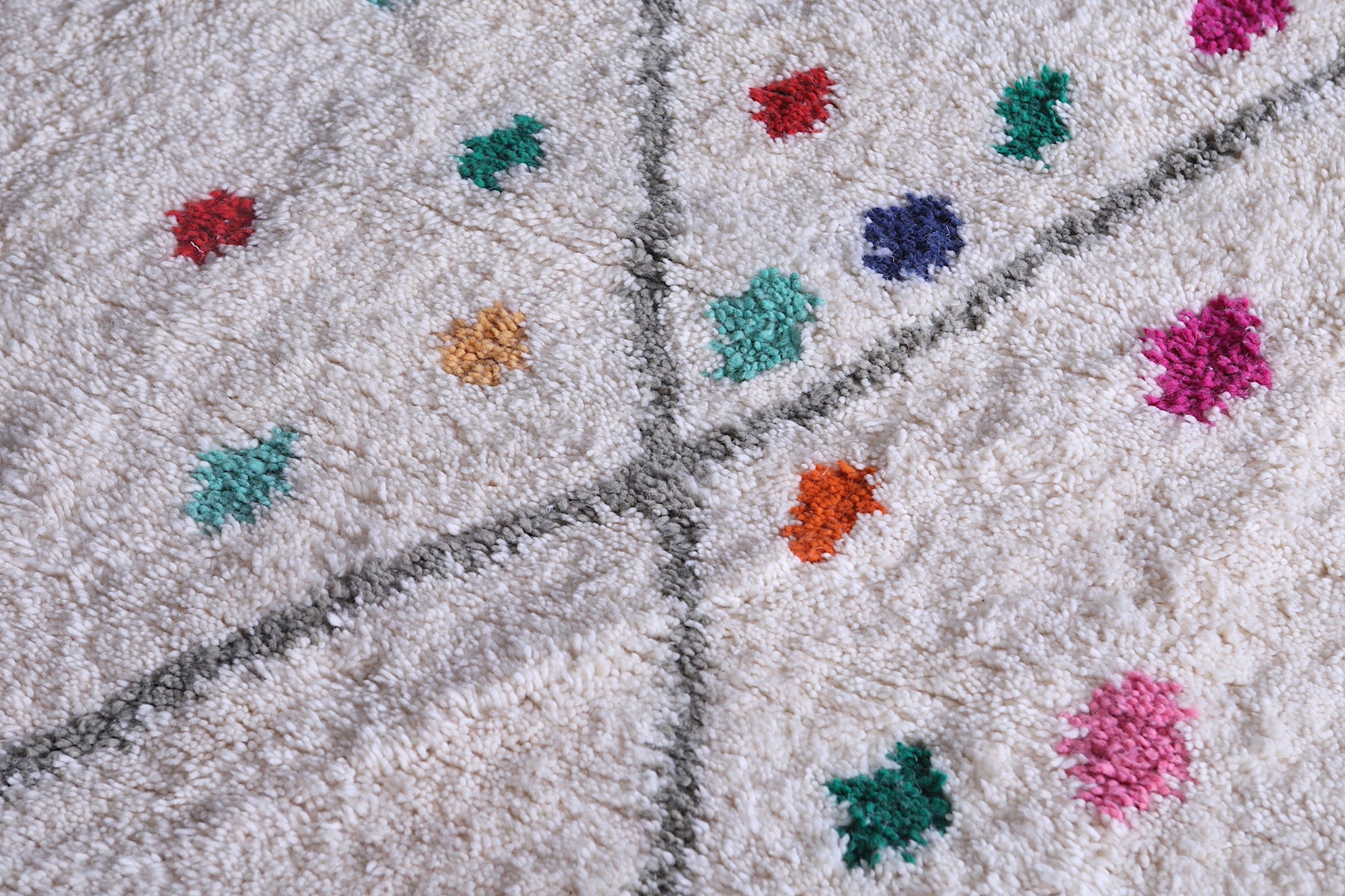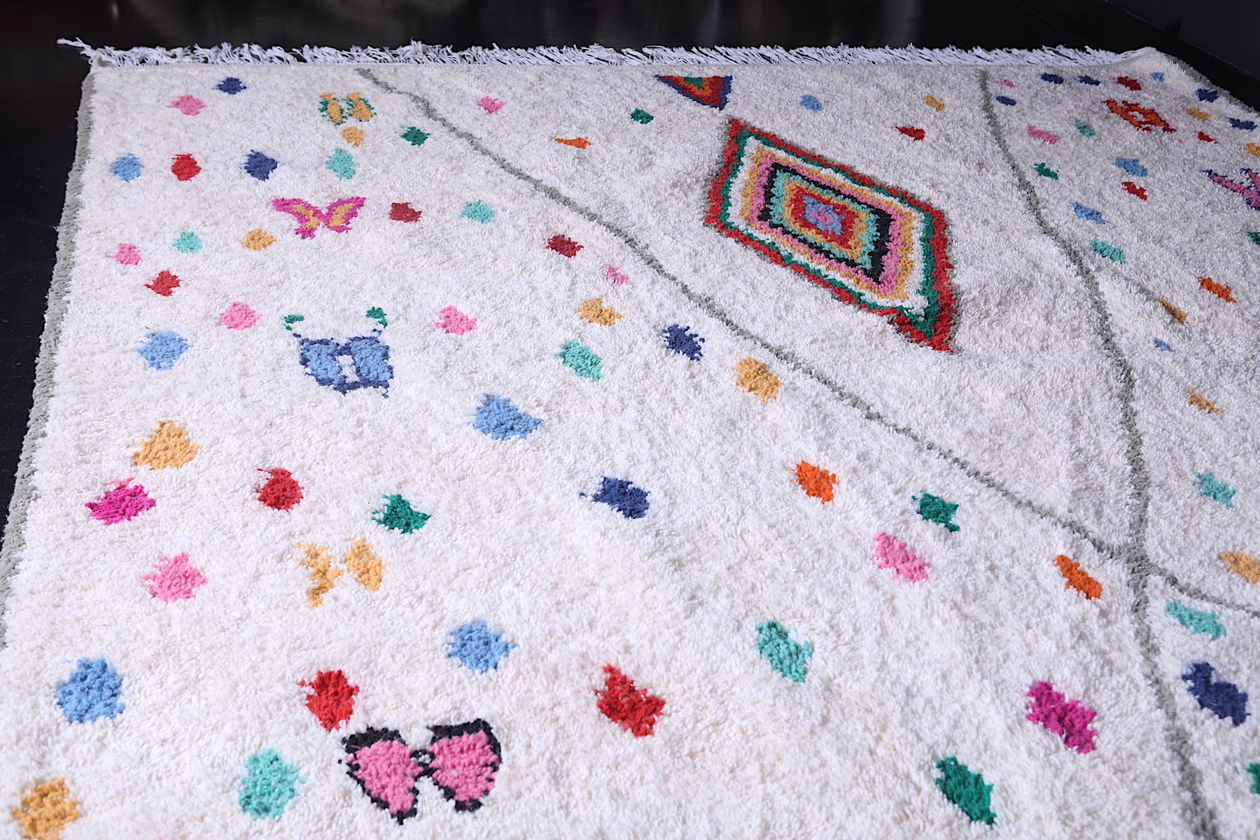 Add a burst of Moroccan charm to your home with this one-of-a-kind Beni Ourain rug that effortlessly blends heritage with joyful artistry.