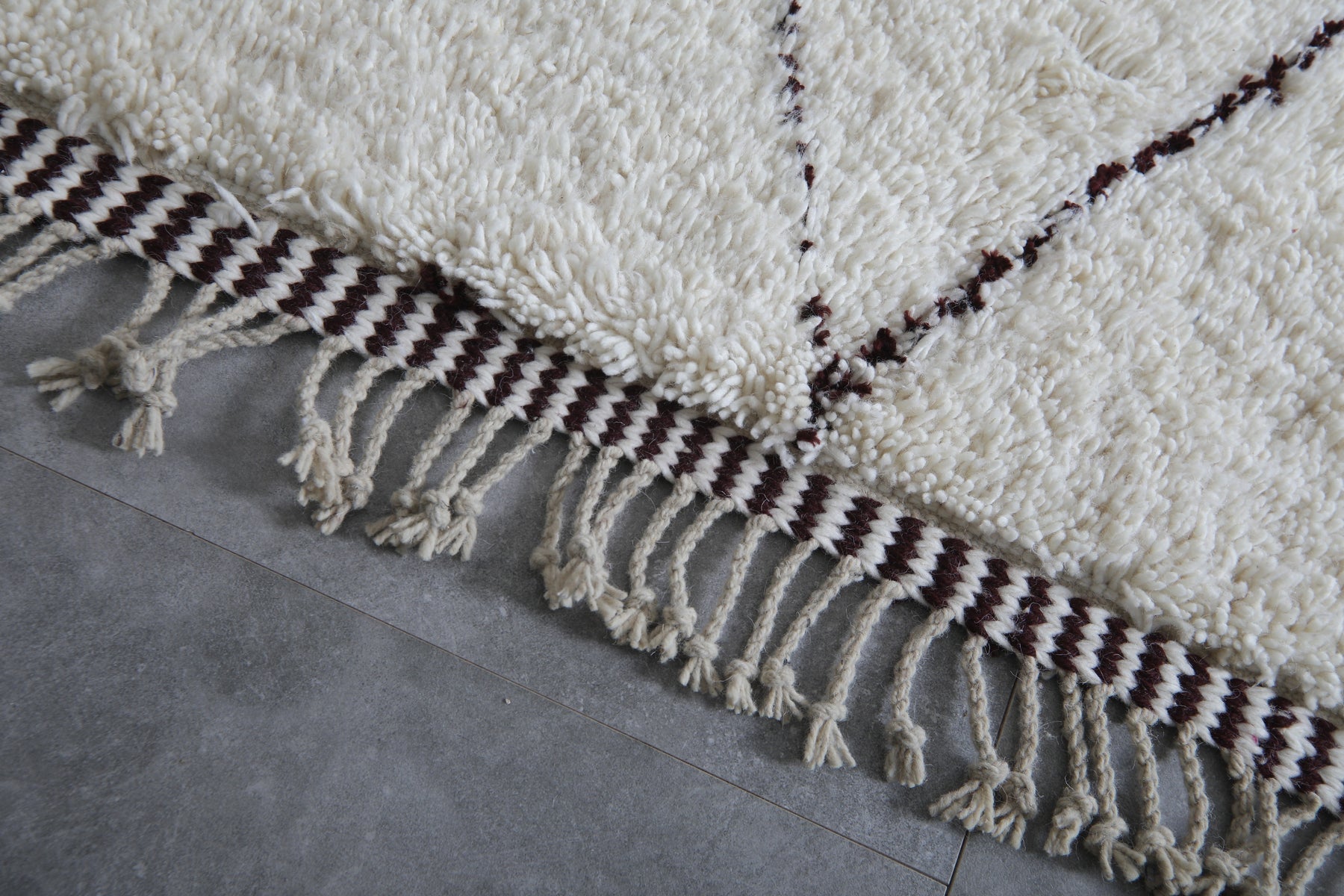 This particular piece features a creamy white base adorned with simple black diamond lines, giving it a clean, graphic look. The organic imperfections in the hand-drawn lines add to its authenticity, showcasing the artisan’s personal touch. Finished with knotted fringe edges, this rug brings both warmth and character to any space.