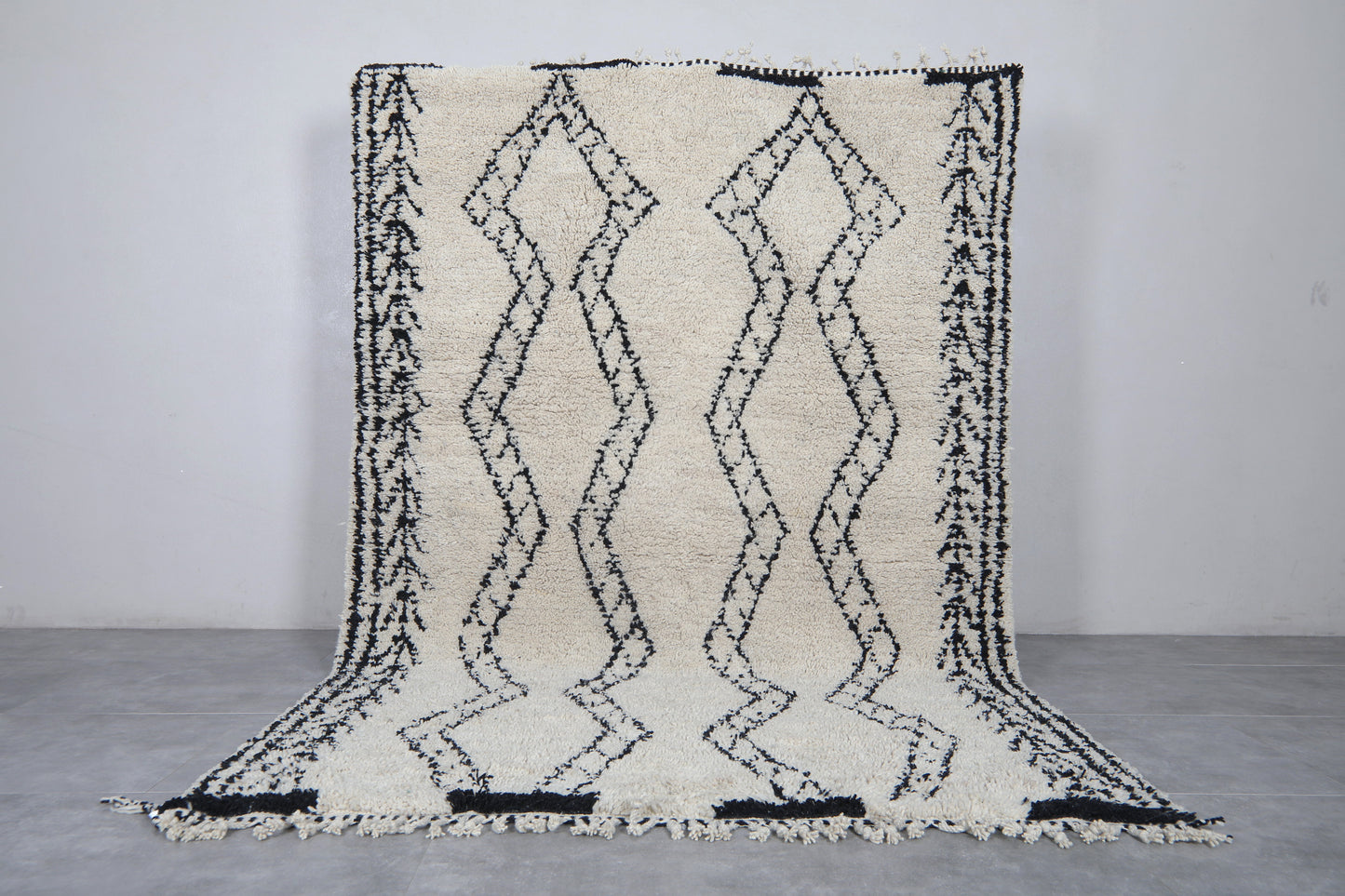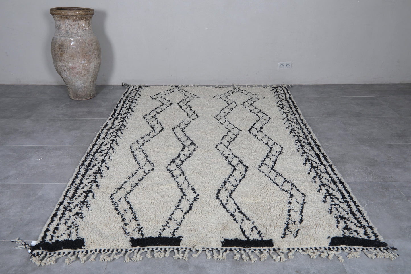 Timeless elegance meets tribal tradition in this Beni Ourain-style Moroccan rug, featuring a plush white wool base adorned with bold black zigzag and diamond motifs. Handwoven by skilled artisans, this high-pile rug is a luxurious and durable centerpiece for any space, combining comfort with rich cultural heritage.