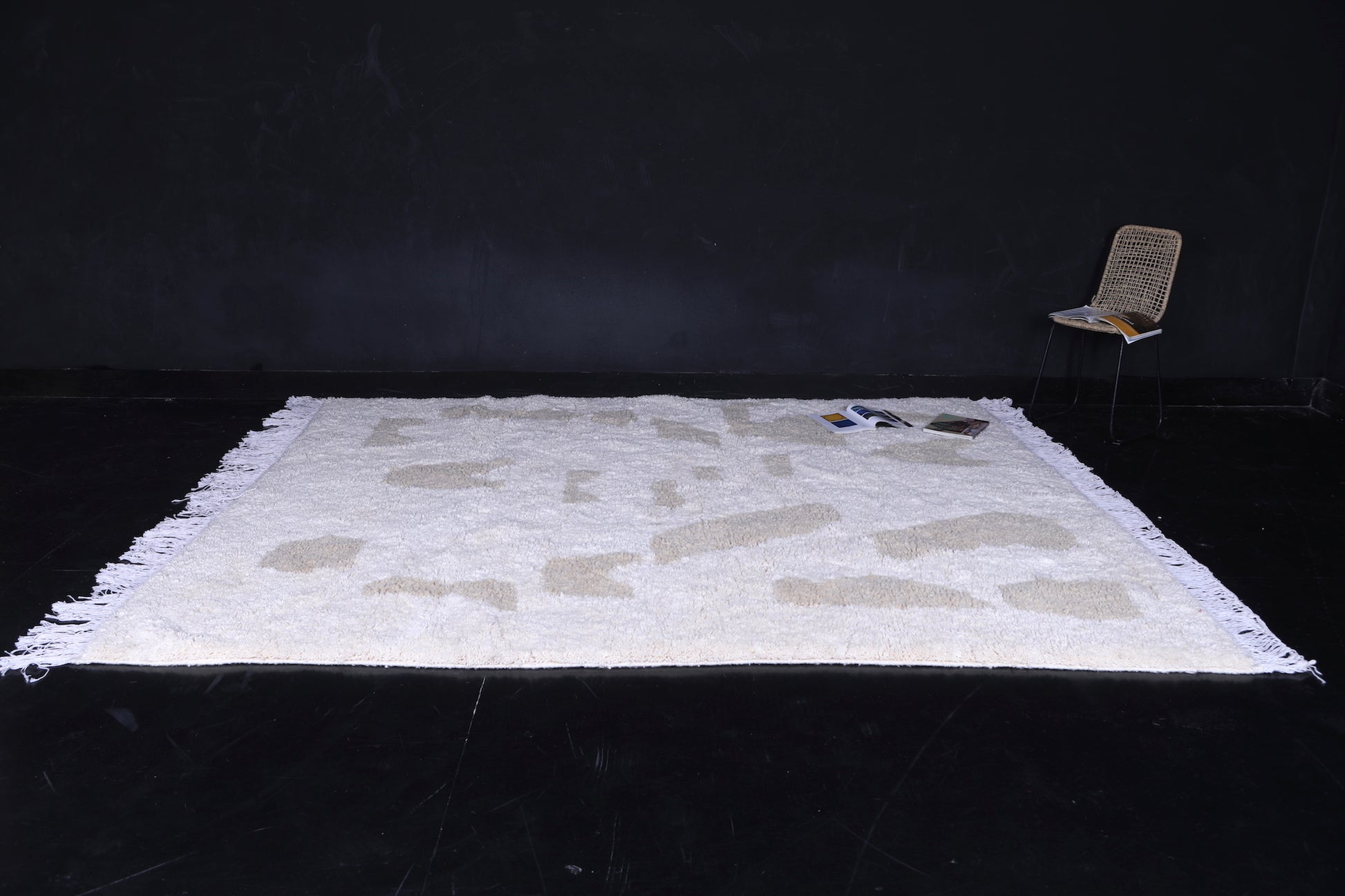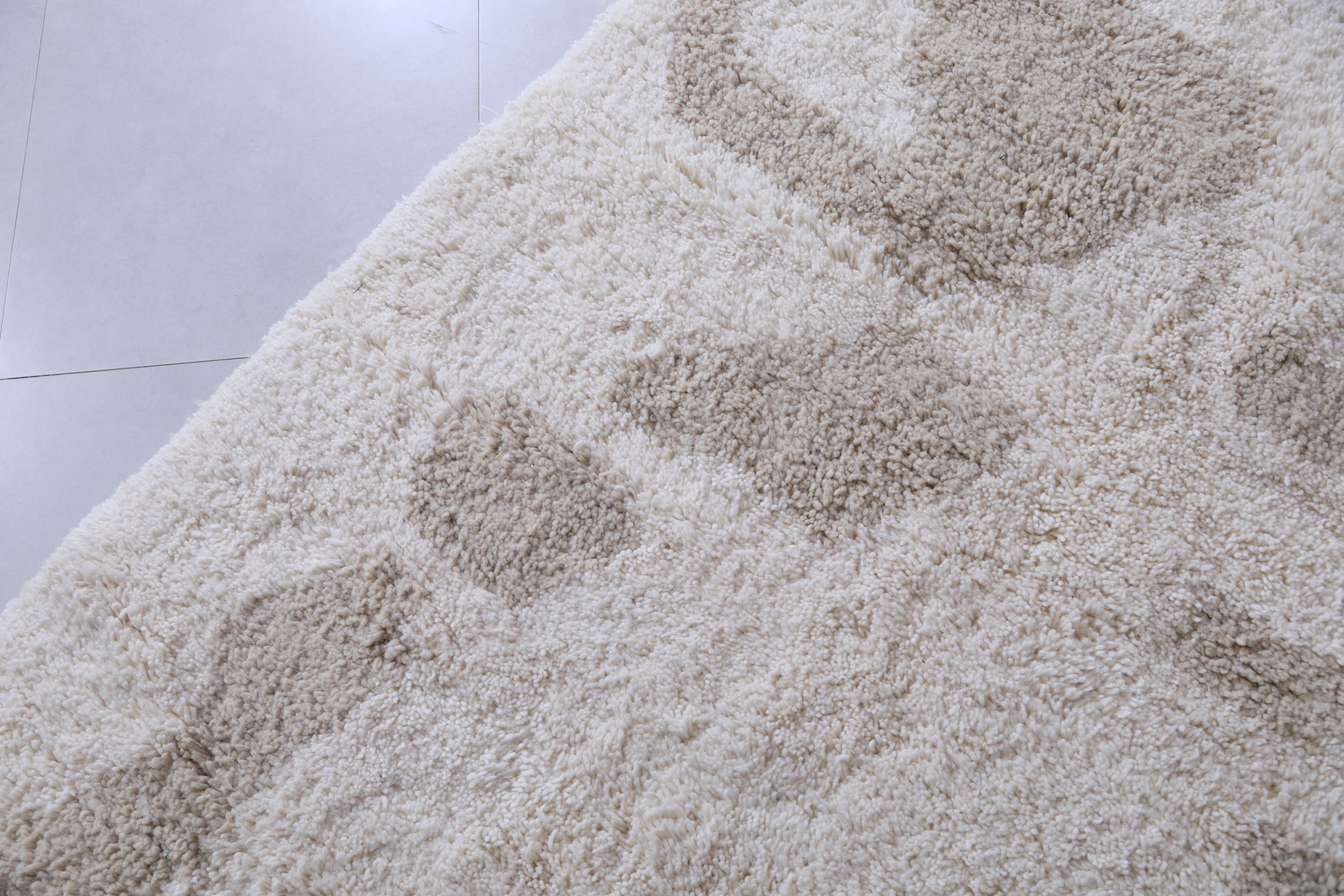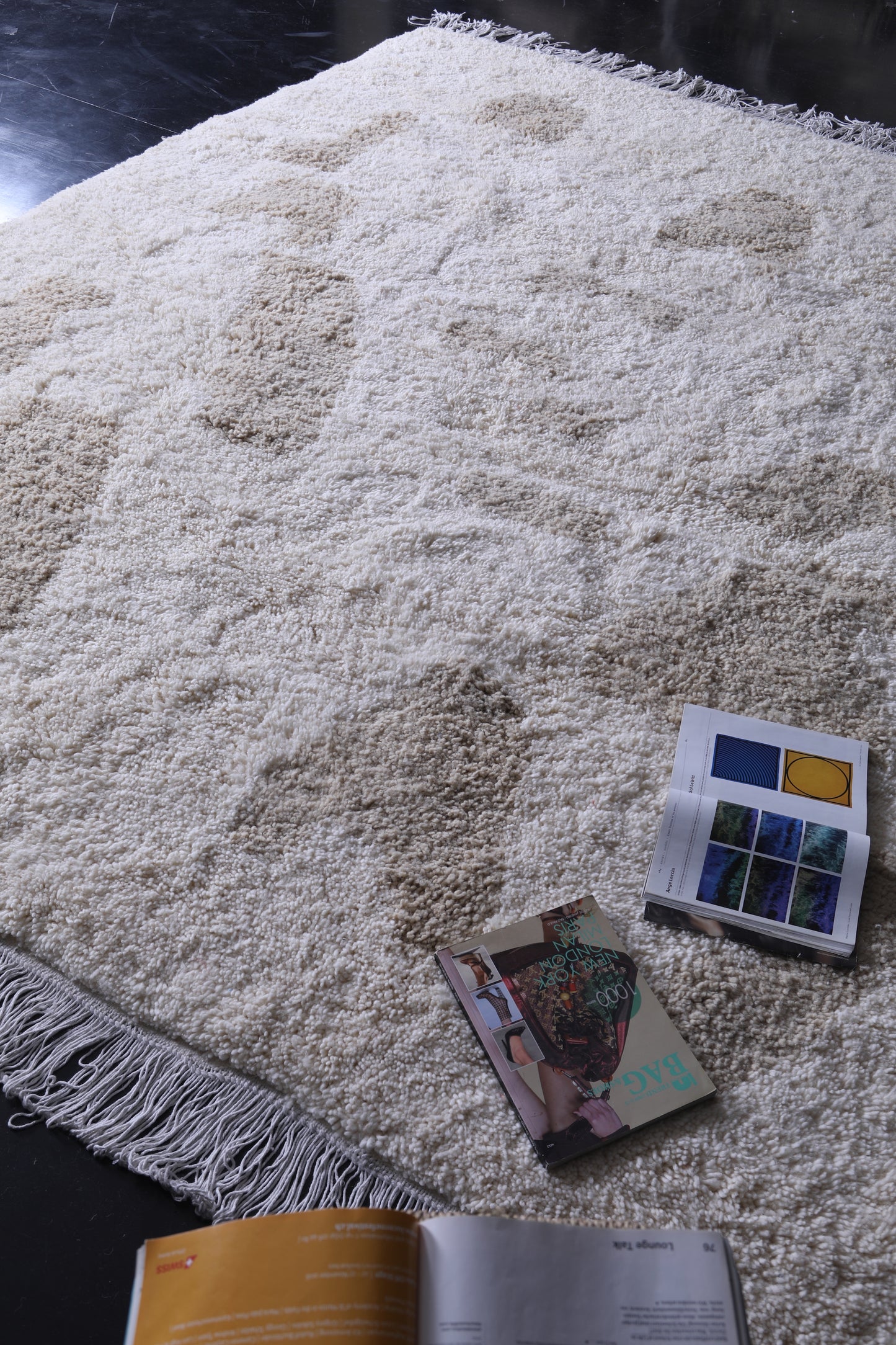 Add a sophisticated touch to your home with this handmade Moroccan wool rug in soft cream and beige tones. Featuring a modern abstract pattern, this minimalist area rug is perfect for contemporary, boho, or Scandinavian-style interiors. Crafted from 100% natural wool by skilled artisans, it offers plush texture, durability, and timeless elegance. Ideal for grounding any space with subtle pattern and neutral warmth.