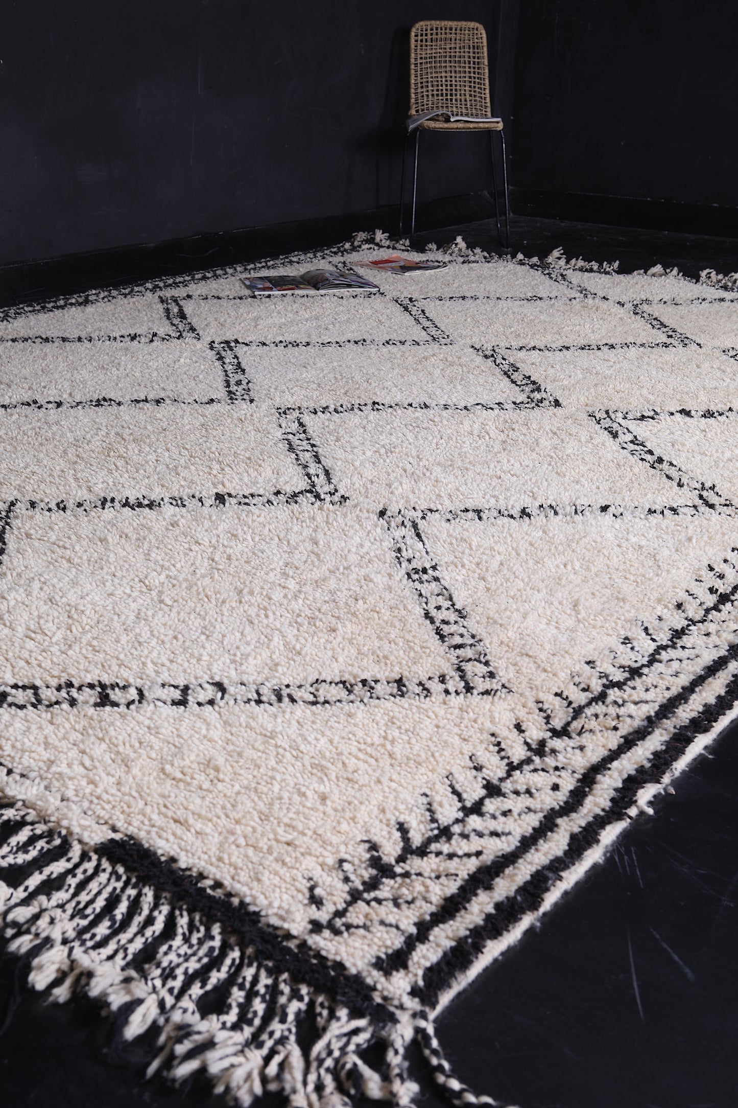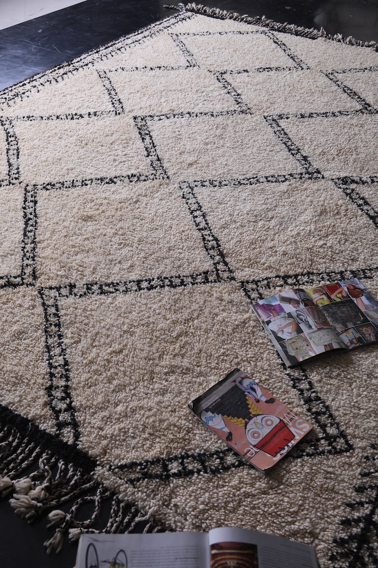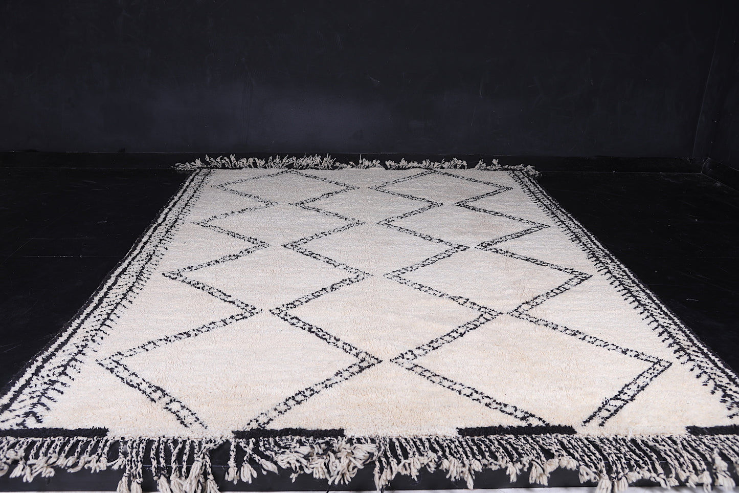 Timeless elegance meets artisan craftsmanship in our Beni Ourain Moroccan Rug, featuring a classic cream base and bold black diamond motif. Handwoven from soft, high-pile wool, this rug showcases traditional Amazigh (Berber) design elements, including a striking geometric lattice and intricately bordered edges that frame the composition beautifully.