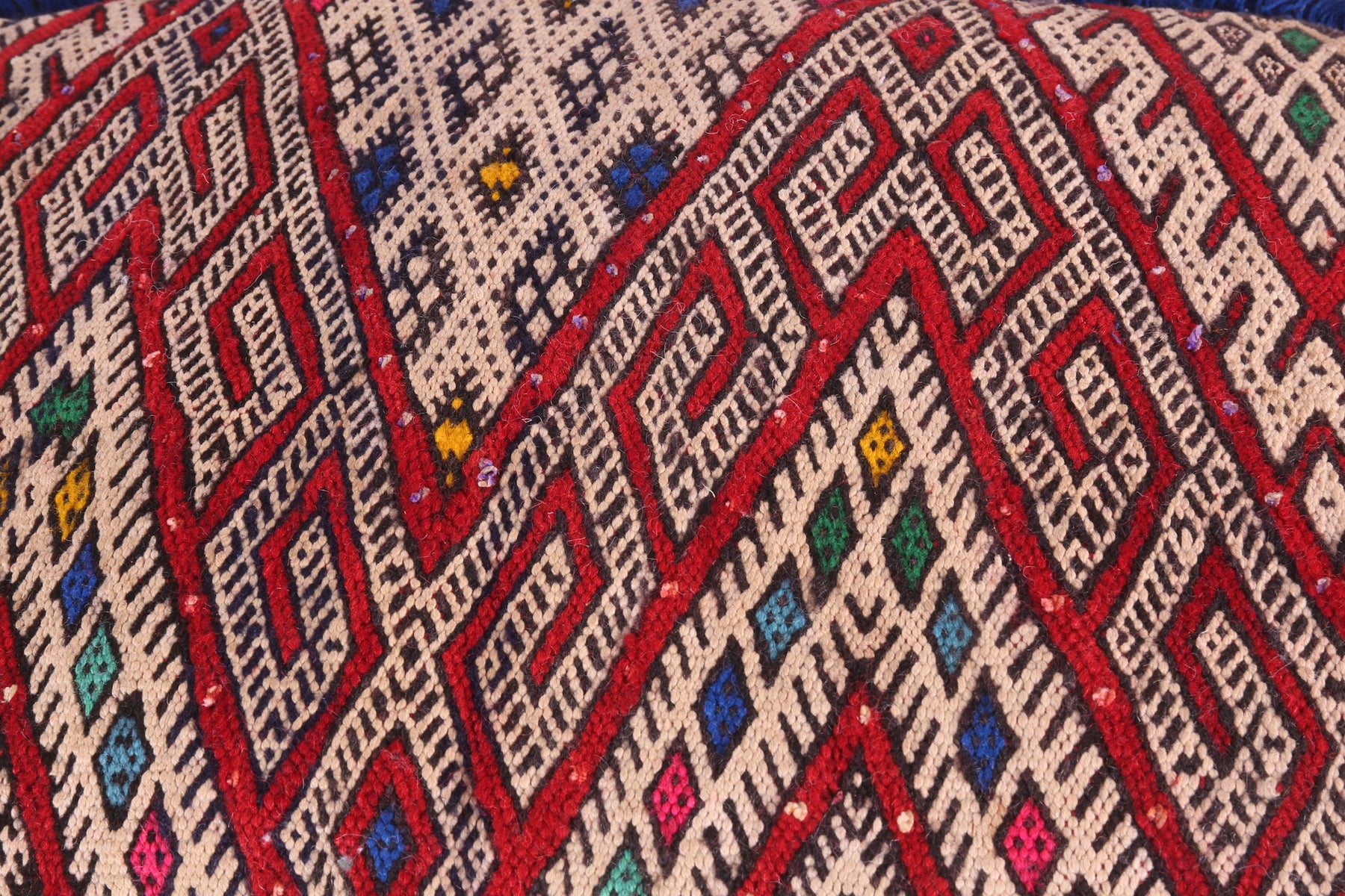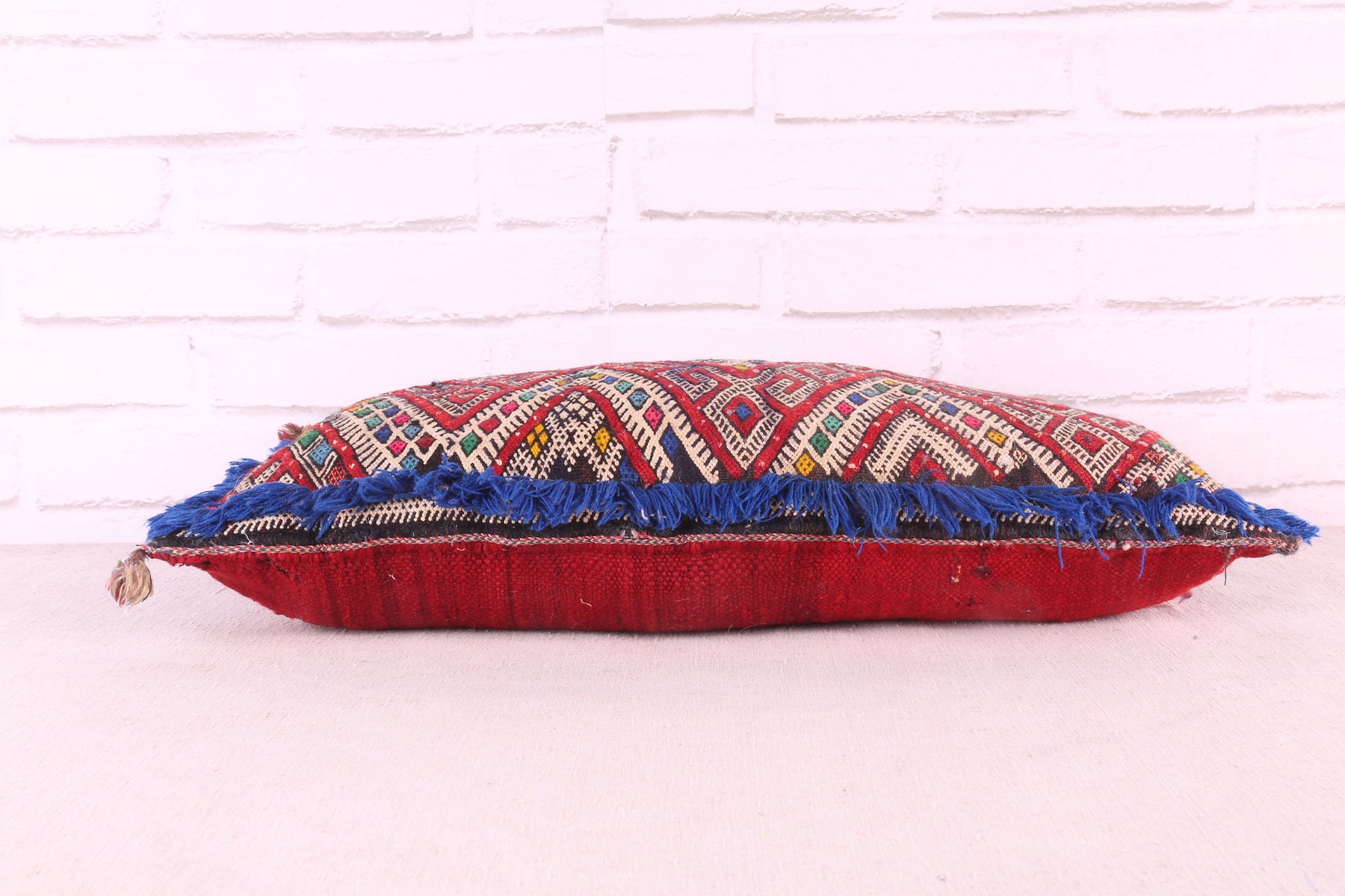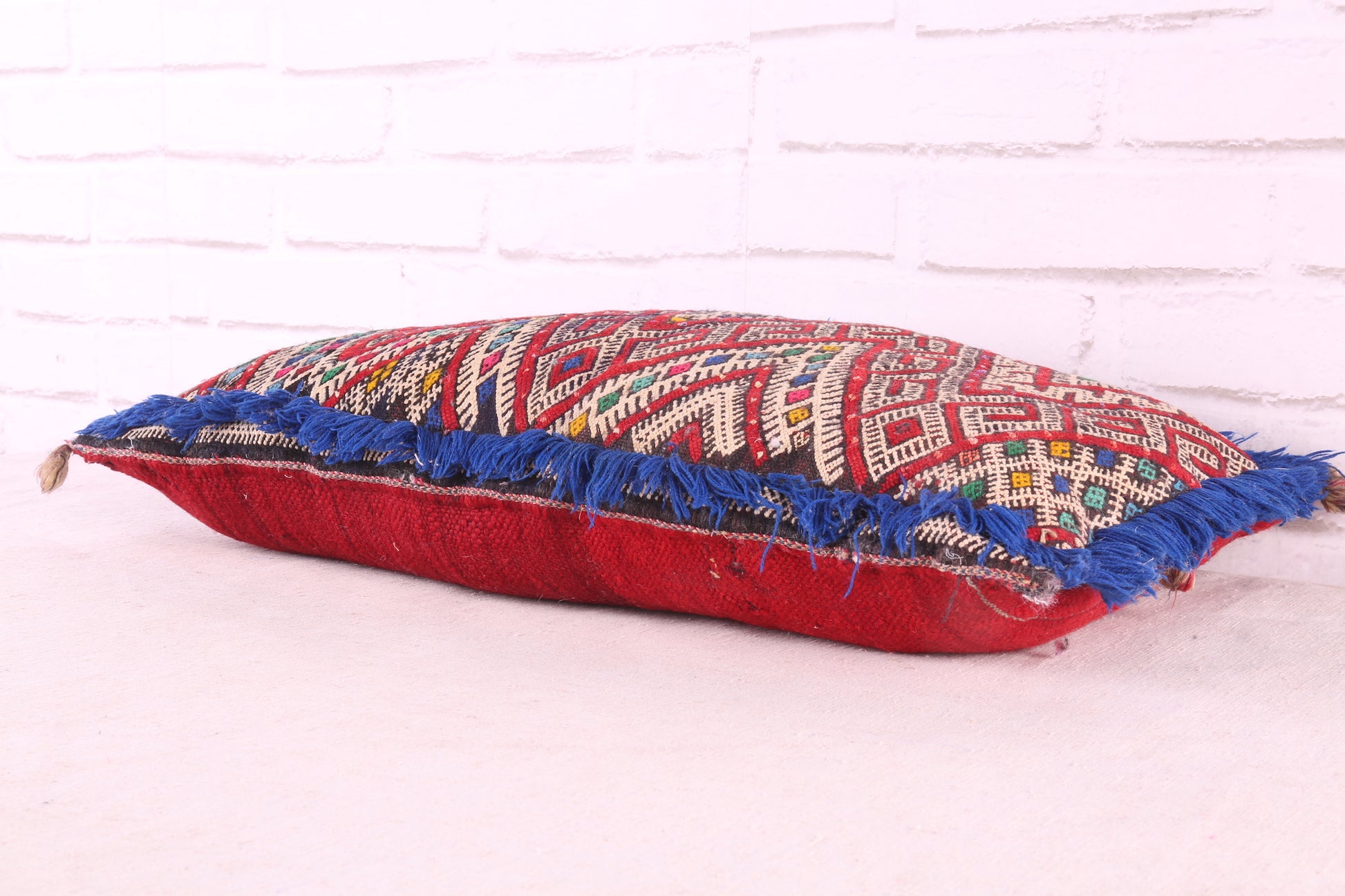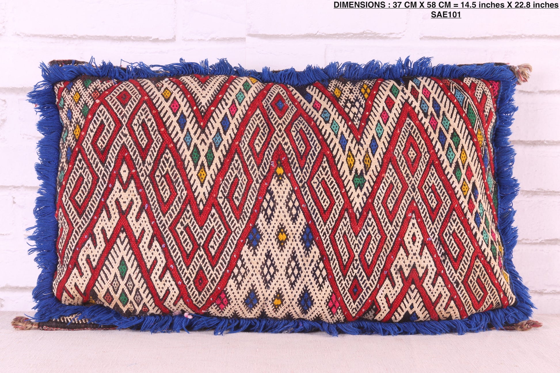 Transform your home into a bohemian paradise with our Boho Moroccan pillow. Measuring 14.5 x 22.8 inches, this berber kilim cushion adds a touch of texture to any room. Its filled design provides both comfort and style, making it the perfect addition to your floor or couch. Elevate your space with this unique bohemian pillow cover rug.