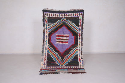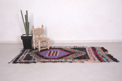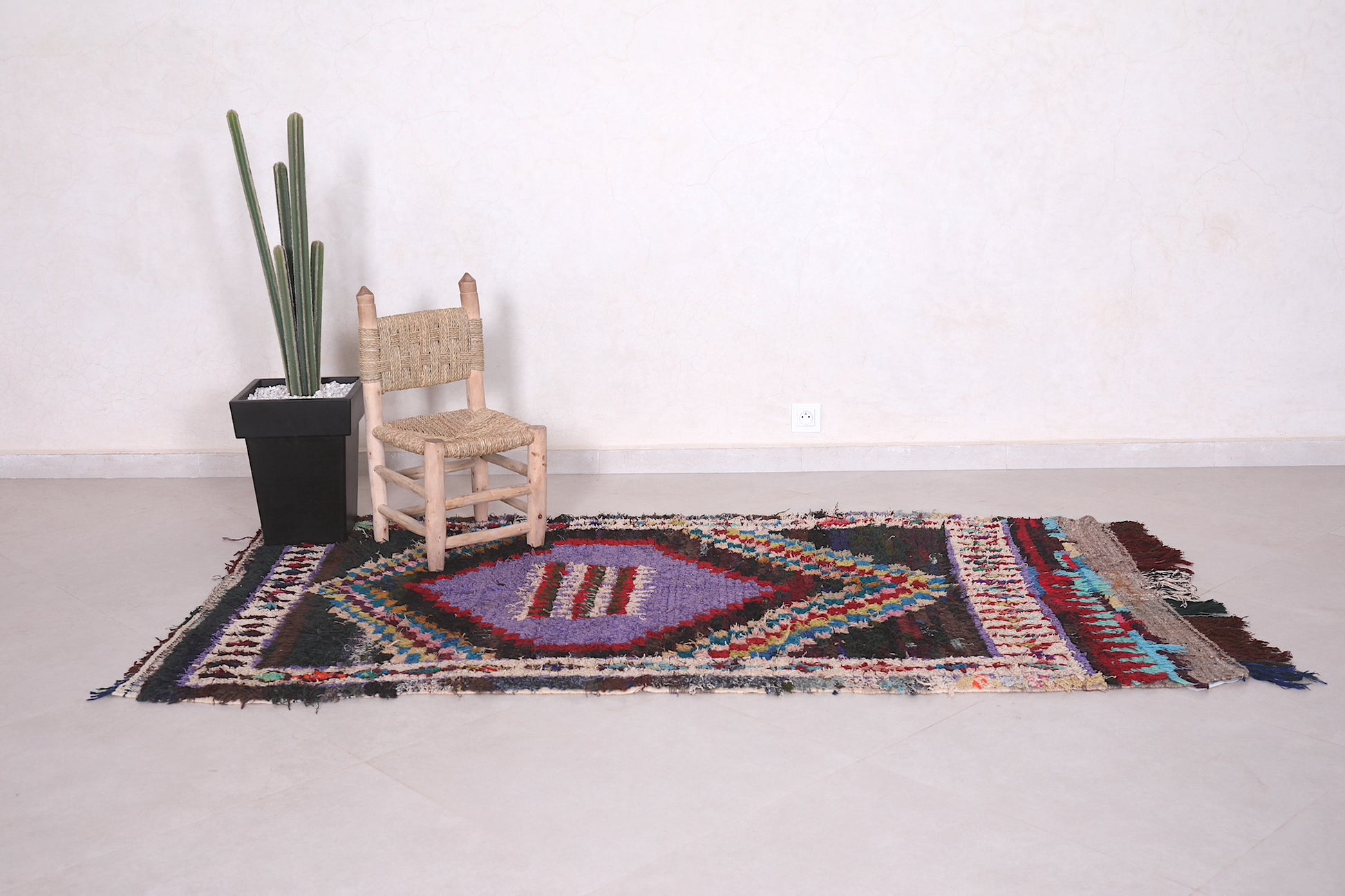 Transform your space with this stunning Berber Boucherouite rug, measuring 3.8 x 6.9 feet. Featuring an intricate diamond centerpiece in bold purple and red, surrounded by vibrant geometric patterns and multicolored accents. Handcrafted with care, this Moroccan rug is a perfect blend of tradition and modern artistry. Its unique design and durable construction make it ideal for adding a touch of culture to your living room, bedroom, or hallway.