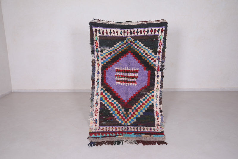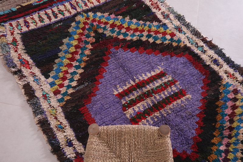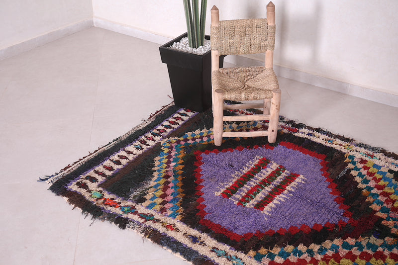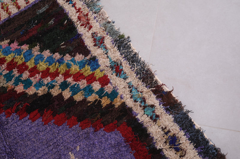 Transform your space with this stunning Berber Boucherouite rug, measuring 3.8 x 6.9 feet. Featuring an intricate diamond centerpiece in bold purple and red, surrounded by vibrant geometric patterns and multicolored accents. Handcrafted with care, this Moroccan rug is a perfect blend of tradition and modern artistry. Its unique design and durable construction make it ideal for adding a touch of culture to your living room, bedroom, or hallway.