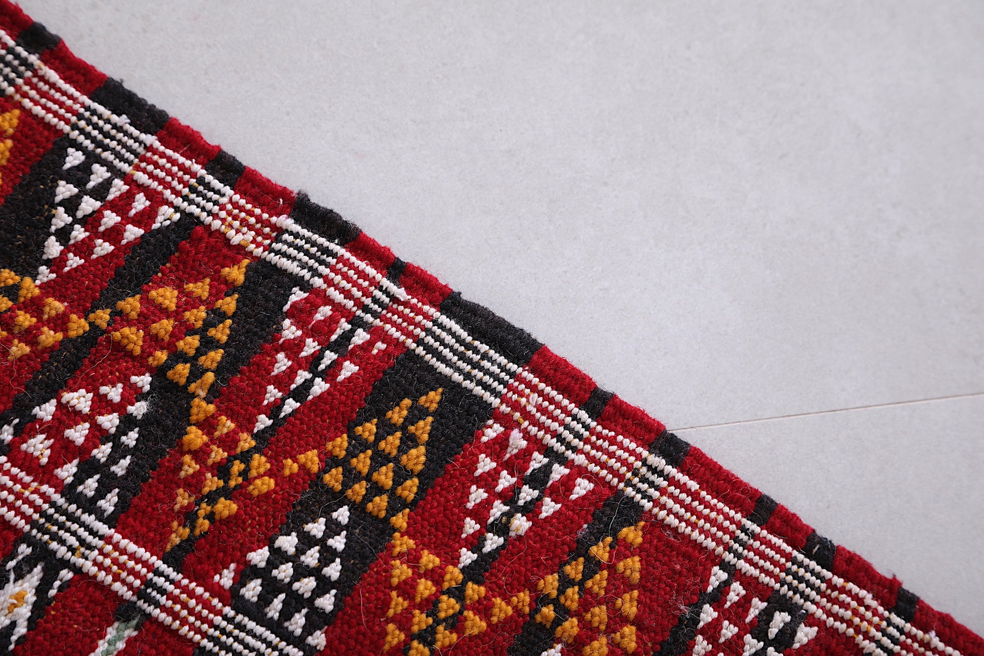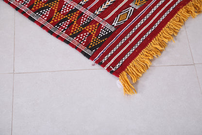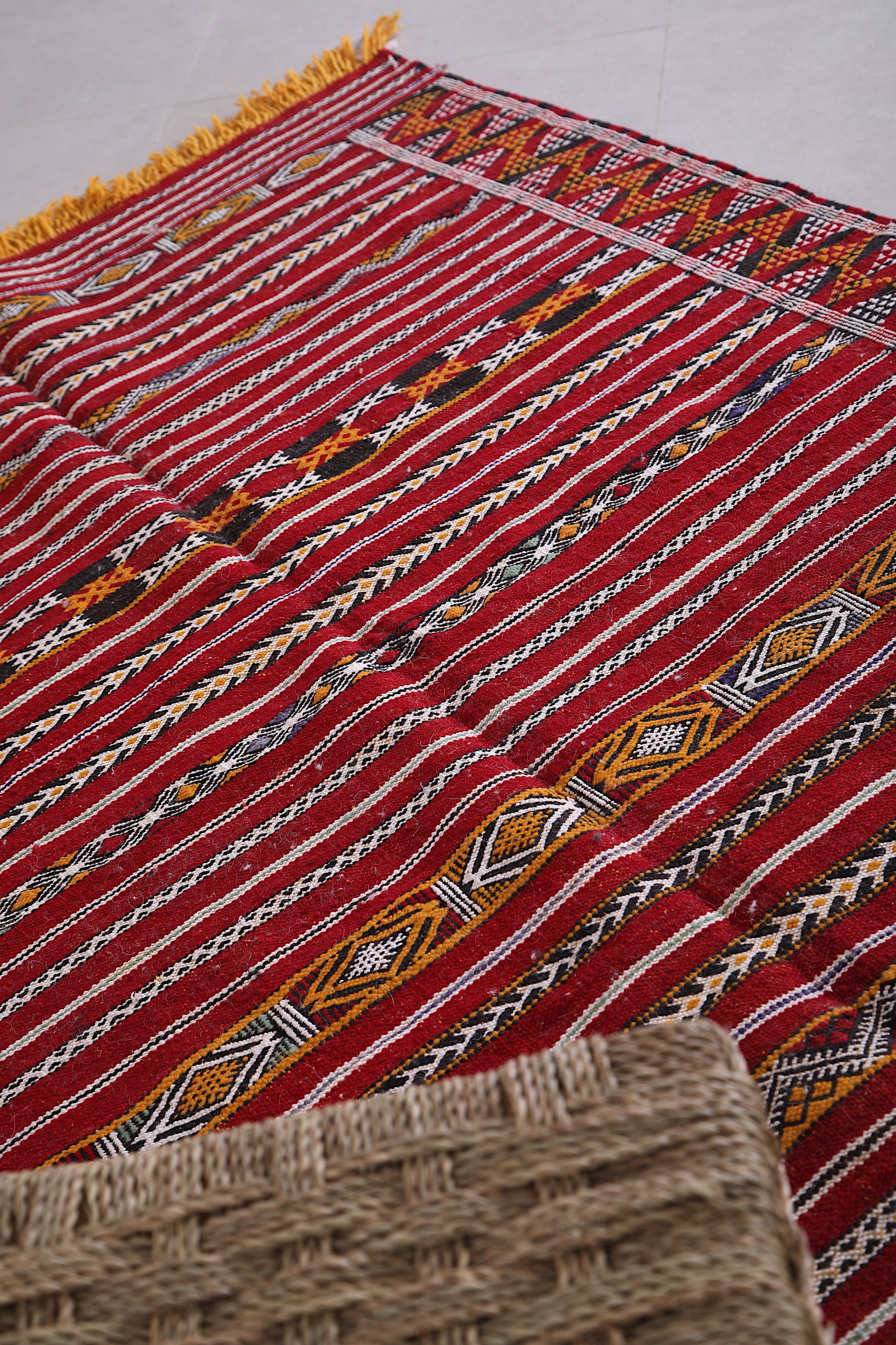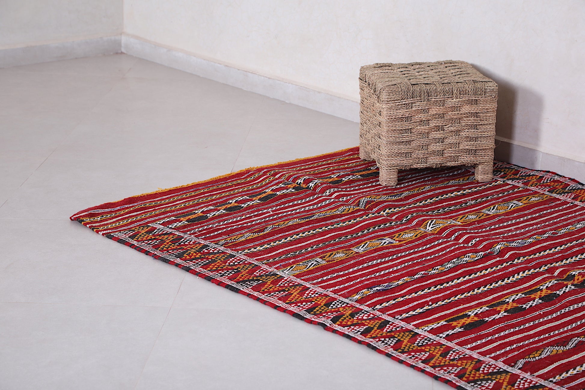 This 4.3 x 6 feet handwoven Berber Kilim rug brings authentic Moroccan artistry to life with its deep red base and intricate multicolor geometric motifs. Ideal for brightening up living rooms, entryways, or as a wall hanging, it adds warmth, tradition, and handmade character to any space.