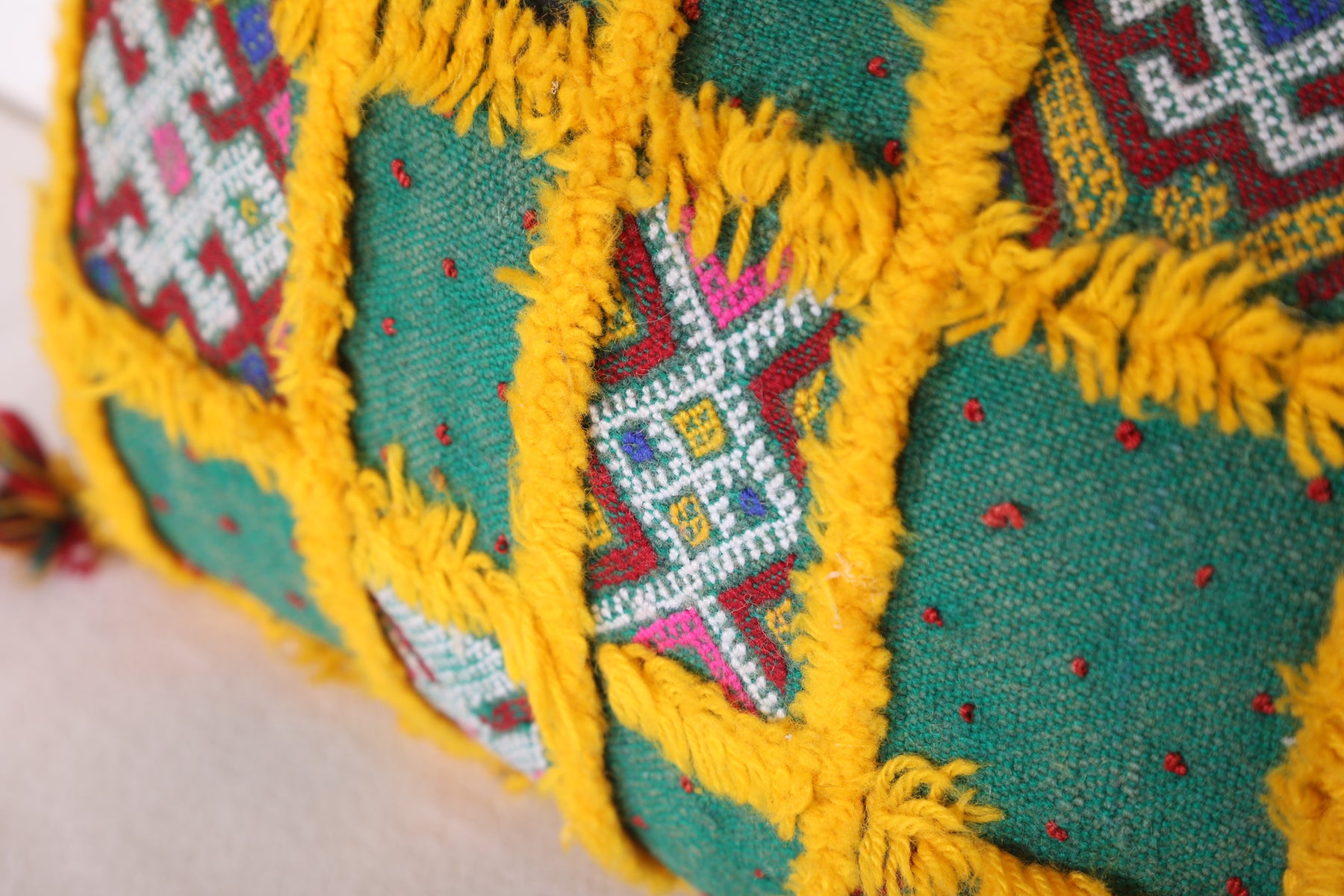 This 14.1 x 19.2 inches Berber Pillow Cover bursts with color and texture, featuring a vibrant green base segmented by shaggy golden yellow borders and multicolor embroidered motifs. Handwoven to bring playful energy and artisanal beauty to your home.