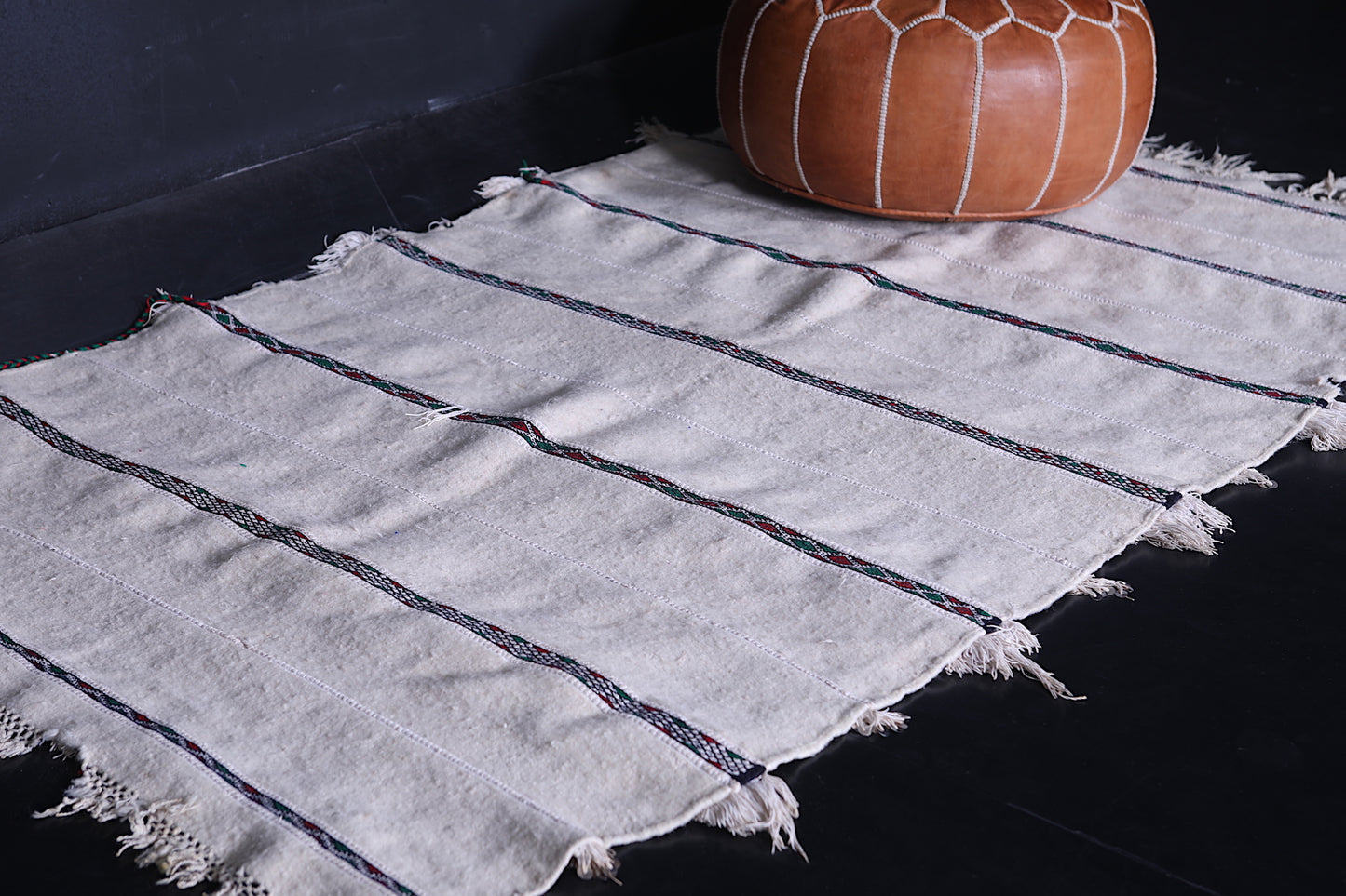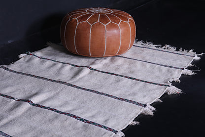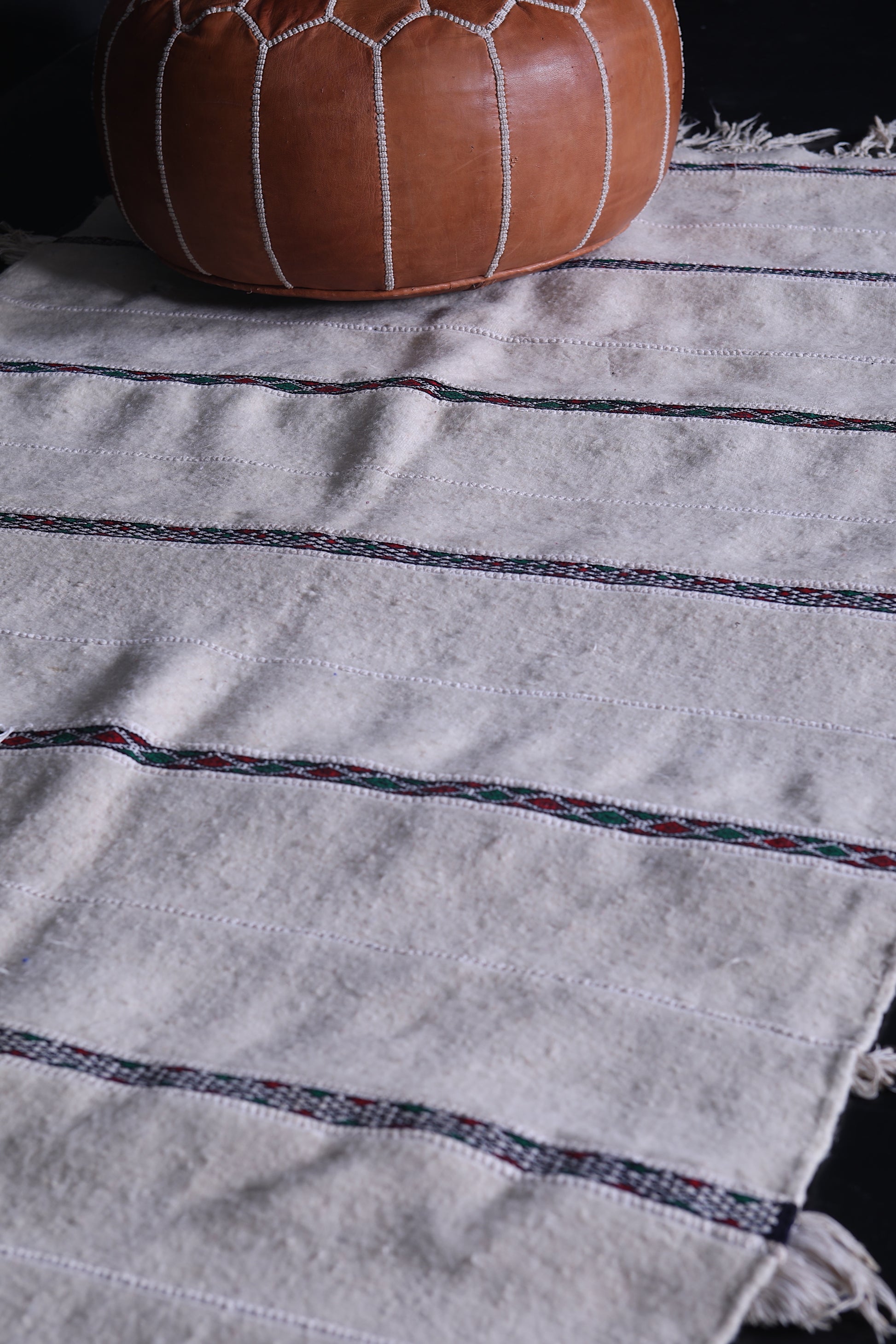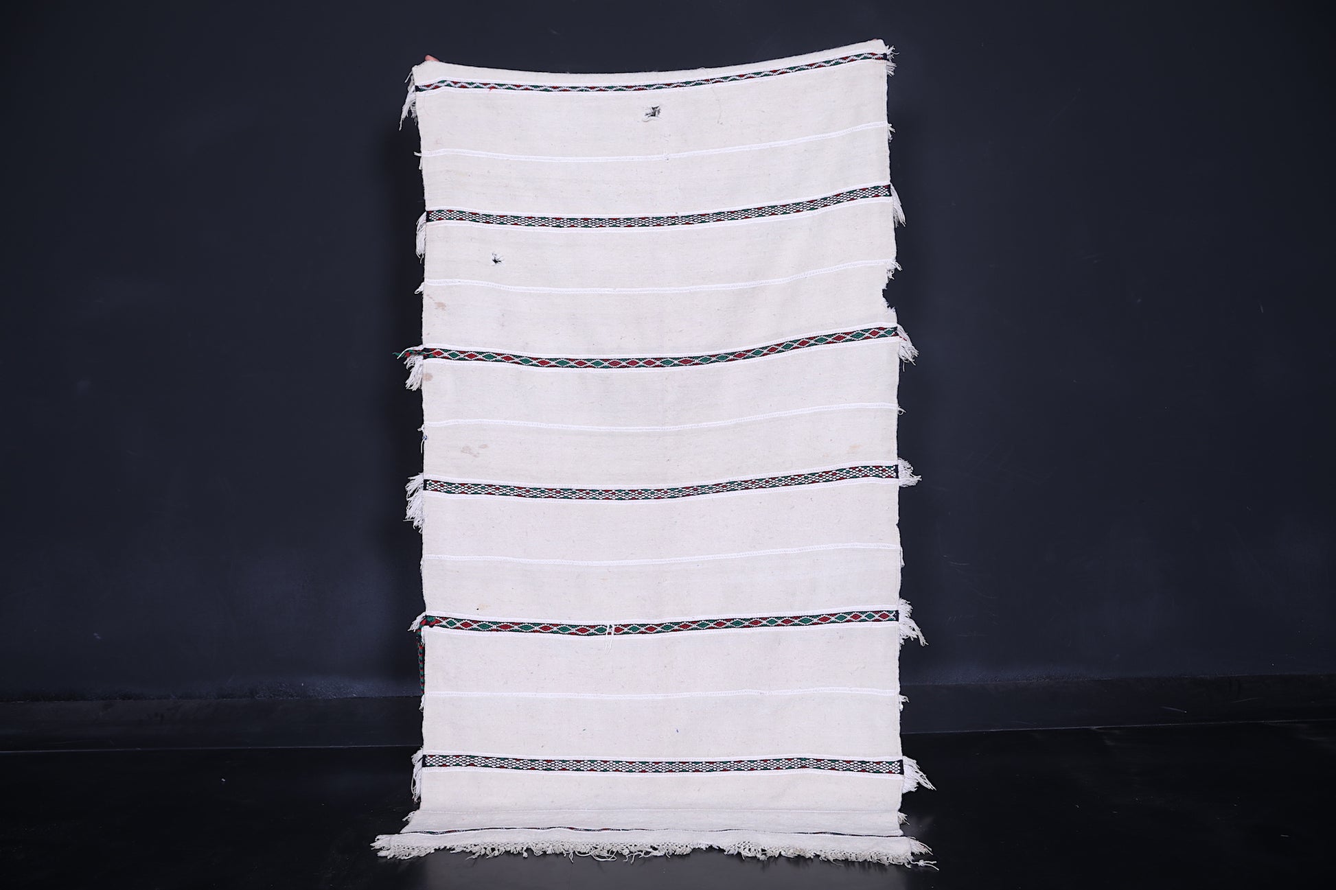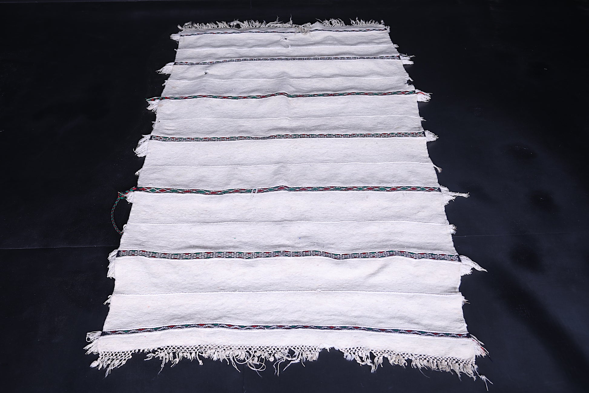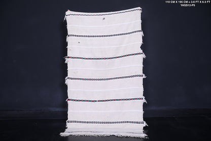 Bring refined simplicity to your space with this Traditional Long Berber Rug, sized at 3.6 x 6.3 feet. Handwoven in Morocco, this minimalist wool rug features a soft ivory base with thin, colorful horizontal stripes. Its understated elegance and durable weave make it a versatile choice for hallways, bedrooms, or layered living spaces.